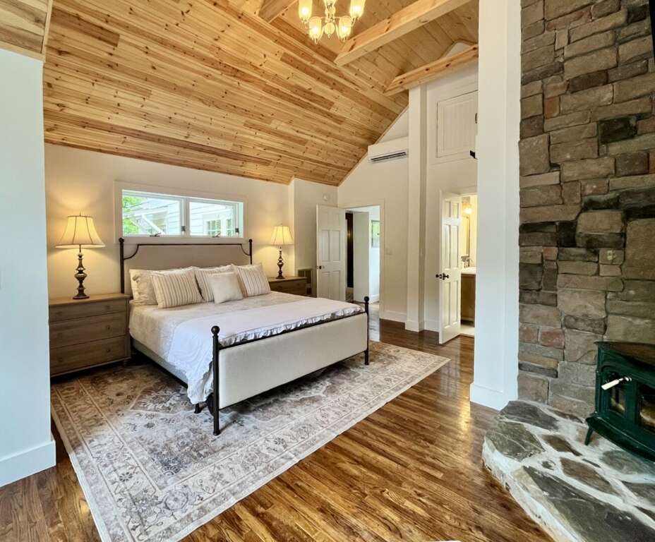 Tucked privately on the main floor, the primary suite is a true mountain sanctuary. Beneath vaulted tongue-and-groove ceilings, a luxurious king-sized bed anchors the room, complemented by soft reading chairs, a rustic wood-burning stove, and a smart TV for late-night unwinding. The ensuite bathroom is a masterpiece of design—boasting a custom tiled walk-in shower, double vanity, elegant lighting, heated floors, and a striking black tiled accent wall that creates a bold yet tranquil ambiance. This suite offers the rare combination of luxury and warmth—a peaceful retreat you may never want to leave.<br />