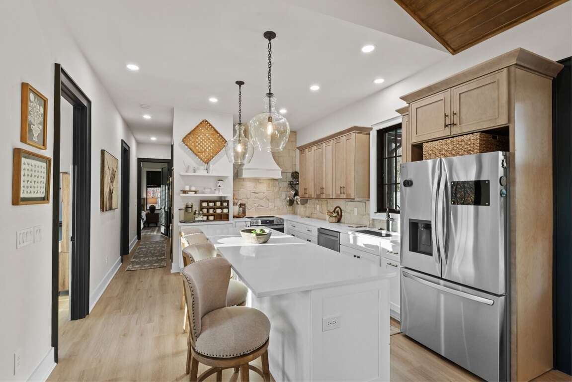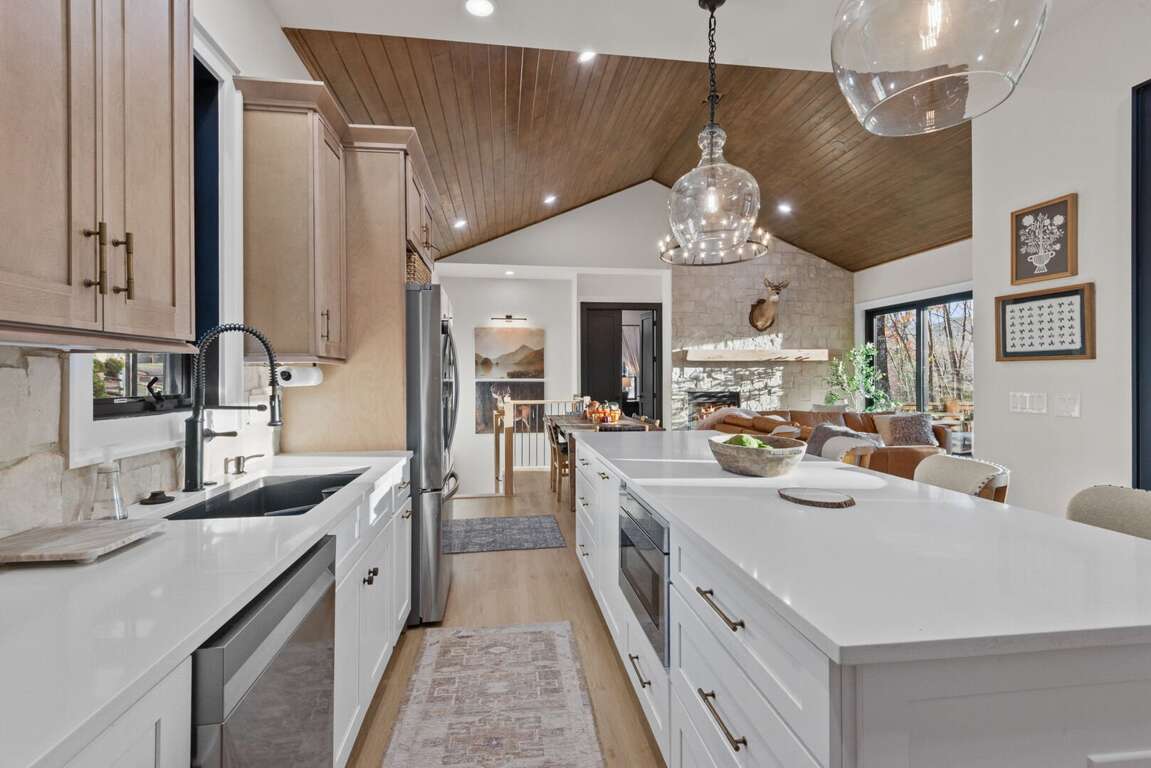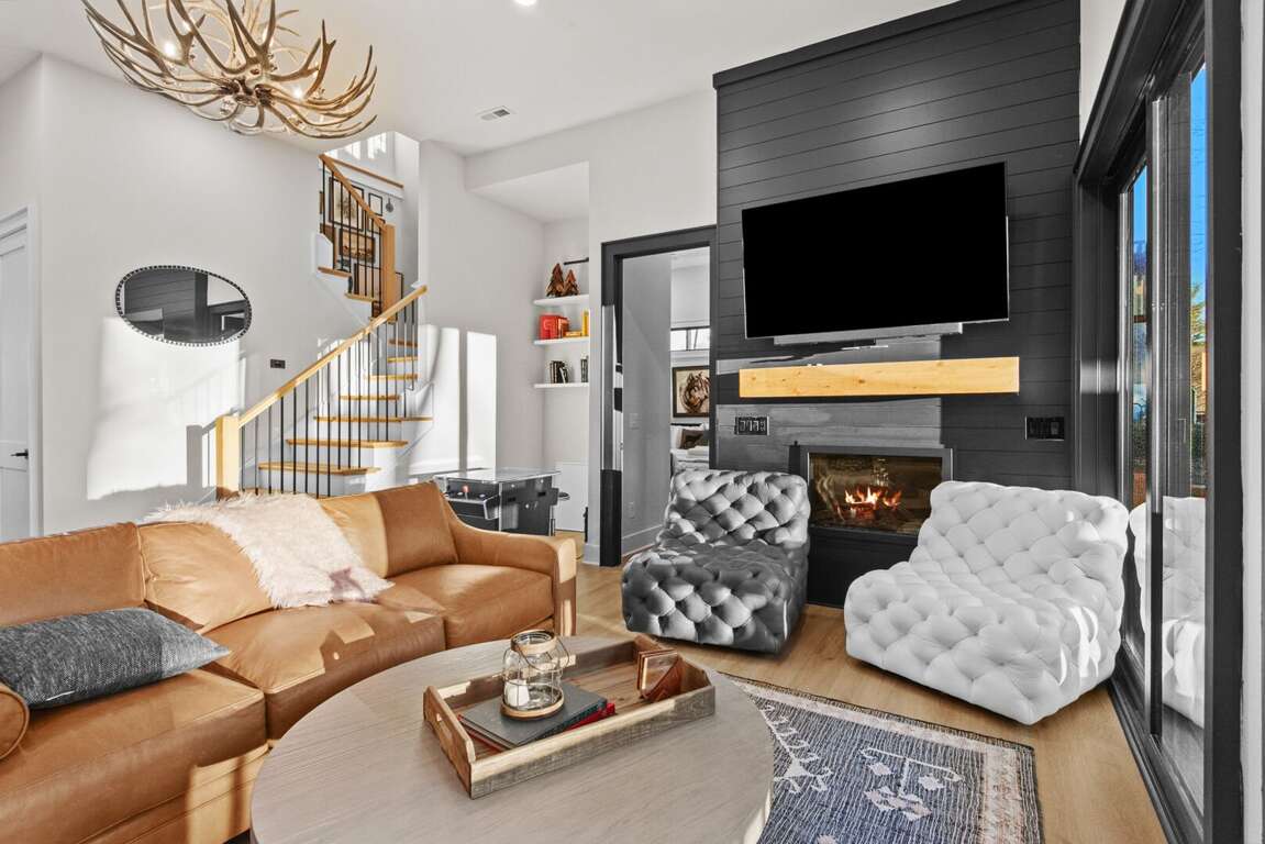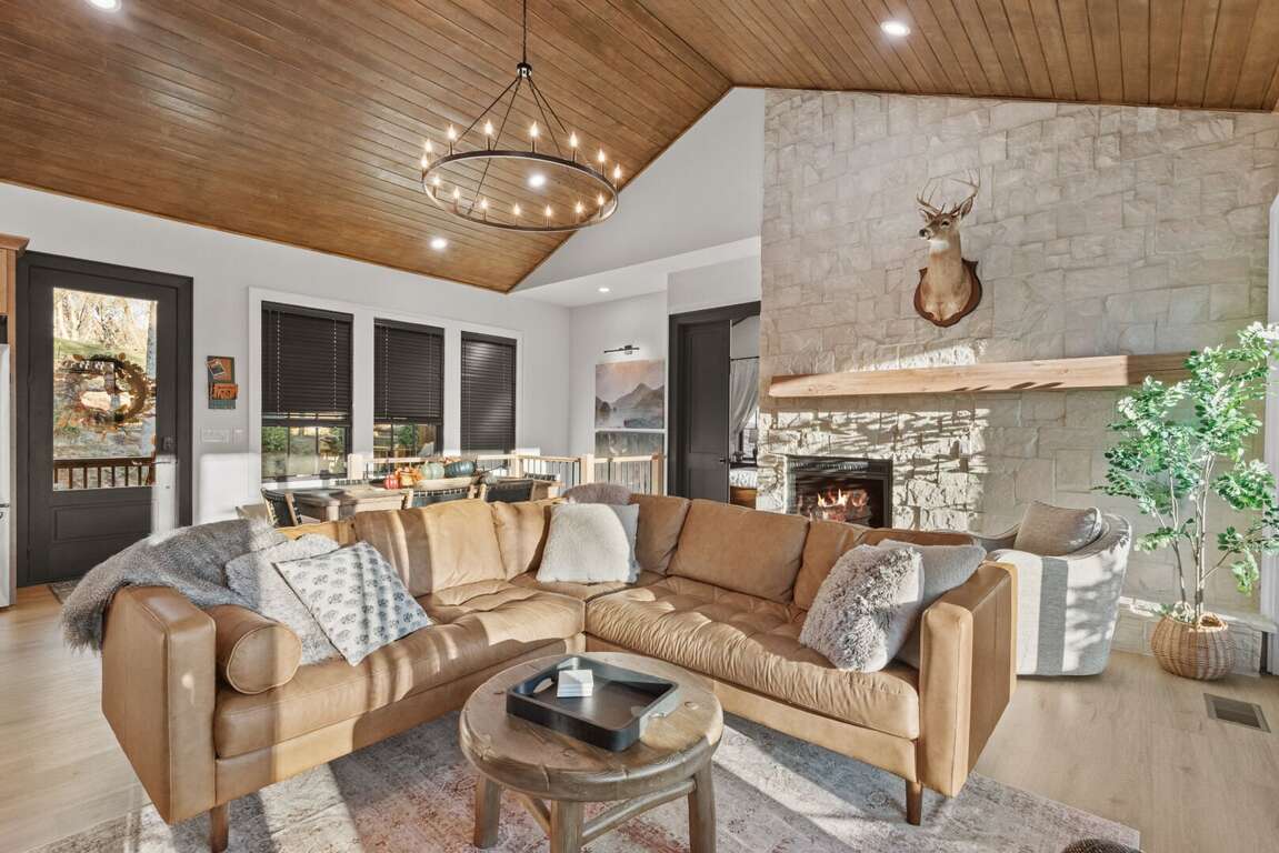 The heart of the home is the bright, open-concept living area with a cozy fireplace and ample seating for the whole group. The adjoining chef’s kitchen is fully stocked with everything you need—high-end appliances, a large island for gathering, and all the cookware and essentials for home-cooked meals.<br />