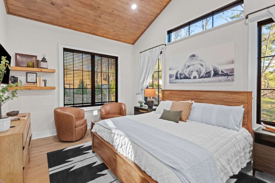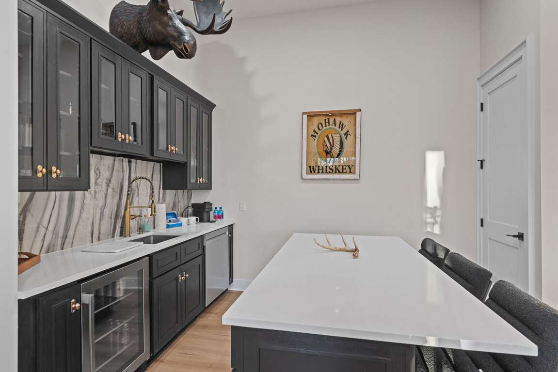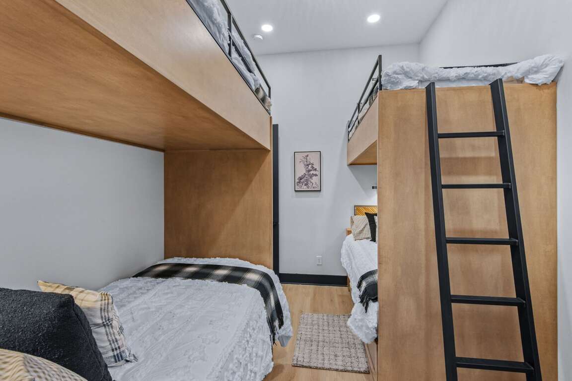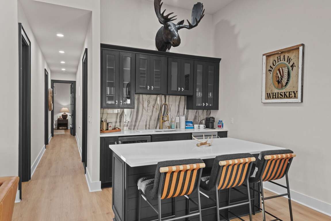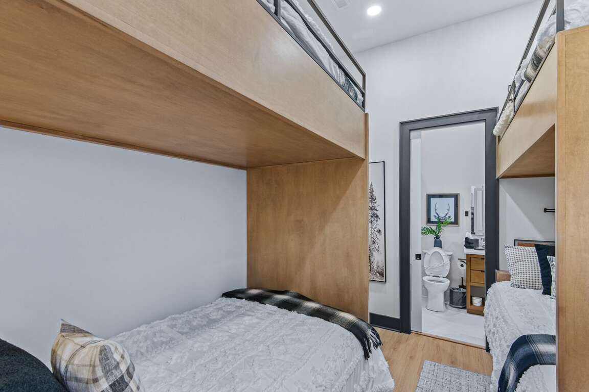 Inside, you’ll find two spacious king suites on the main level (located on the opposite ends of the house for total privacy), each with its own private ensuite bathroom. Also on the main level, guests can work remote in the office which doubles as an additional sleeping space with a pull out queen bed. Downstairs are two additional king suites with ensuite baths, plus a fun bunk room featuring two sets of XL twin bunks and a full bathroom—perfect for kids or extra guests. Each king bedroom is furnished with a flat screen TV. Also downstairs is an additional living area complete with a beautiful wet bar and video game console for kids! Perfect place to cheer on your favorite team or enjoy a family game night. <br />