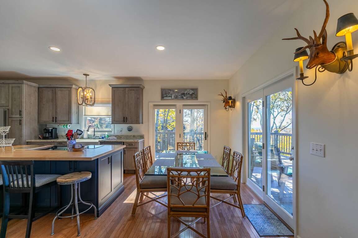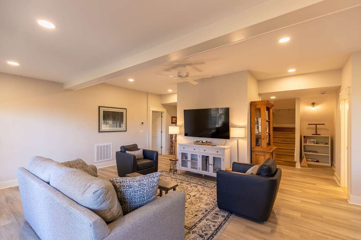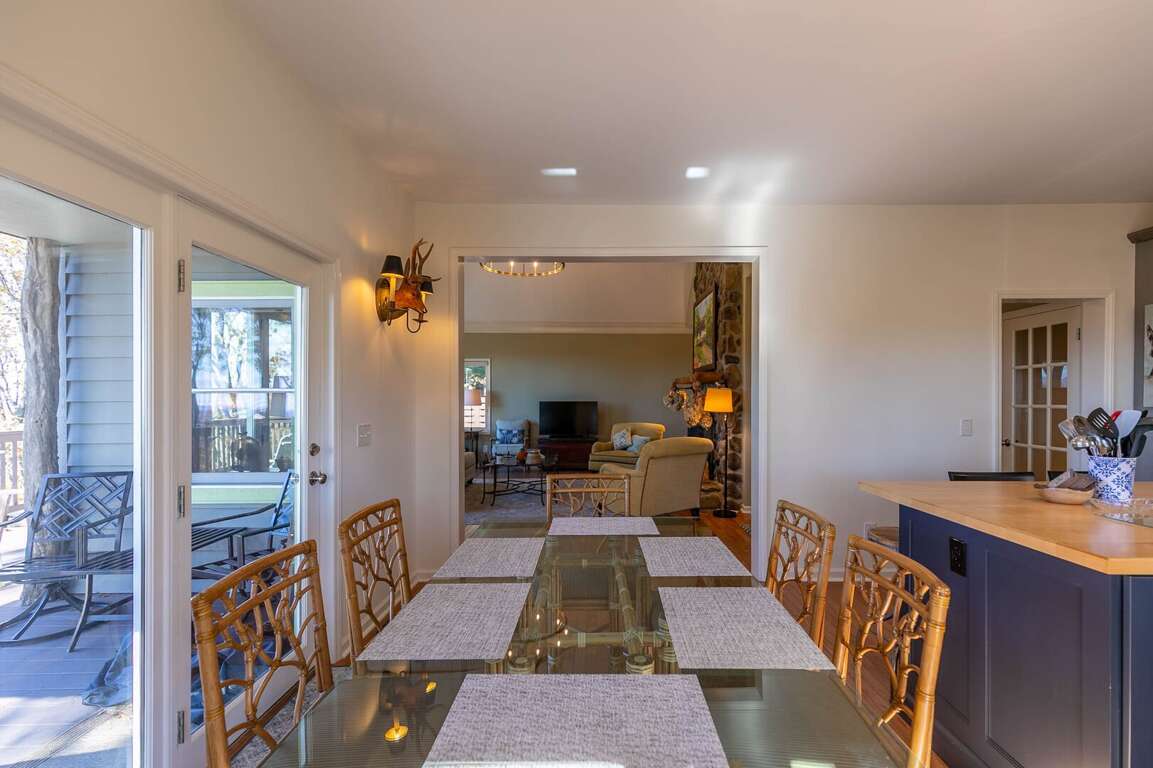 The main level offers a spacious living room, kitchen, and dining space. The living room features a gas fireplace, a large flat screen TV, and cozy furniture to unwind on. The adjacent kitchen is fully stocked with cooking utensils, and offers plenty of space to spread out and prepare a delicious meal for the family. <br />