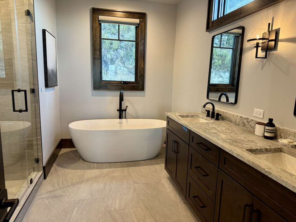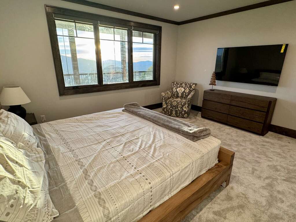 The main level primary king suite is a modern/rustic sanctuary with direct deck access, plentiful sunshine and views, and a spa-worthy en-suite showcasing heated tile floors, standalone soaking tub, fully tiled shower, dual granite vanities, and a separate water closet. <br />