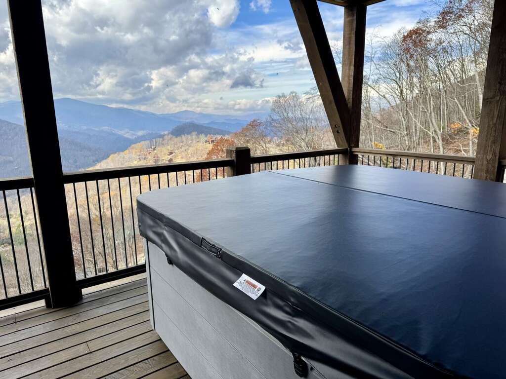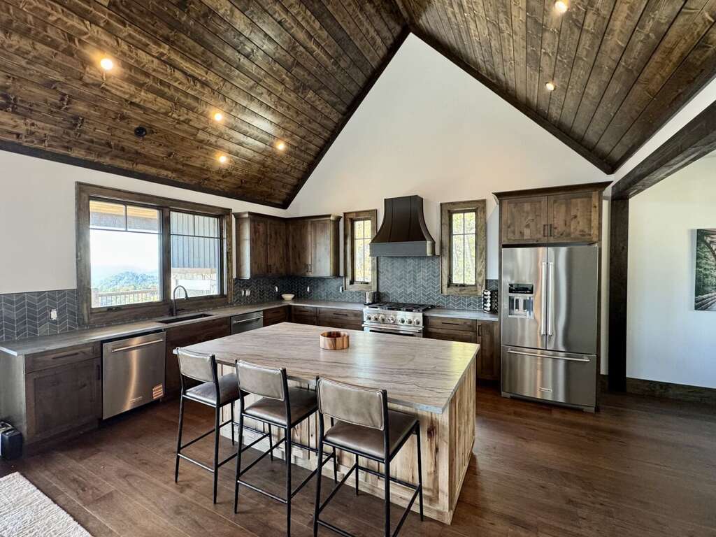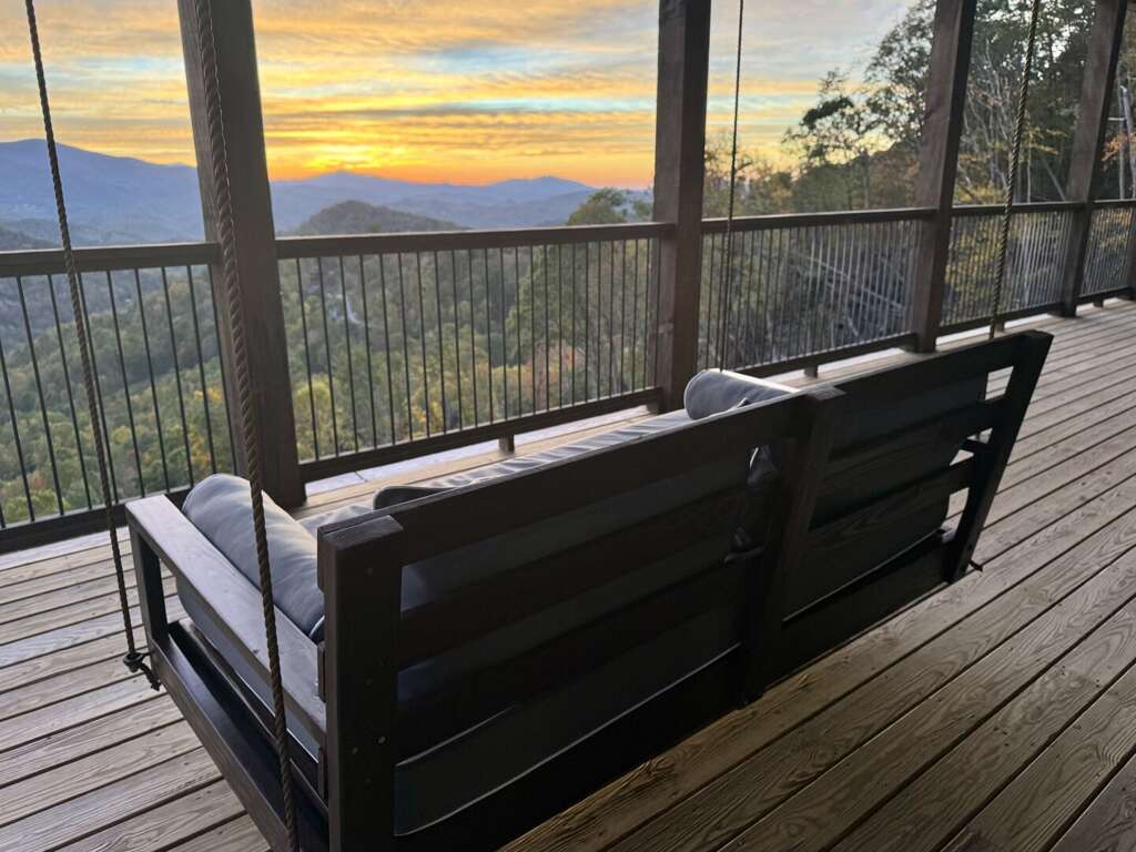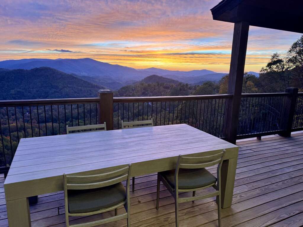 But nature and the outdoors are the true stars at Skyrise. 1,500 square feet of decks, all with the same incredible views, mean you have your choice to gather by the wood-burning fireplace on the upper deck as the sun sets across the mountains, unwind in the oversized hot tub or custom-built porch swing on the lower deck, or head down to the rock-perched fire pit and roast marshmallows in Adirondack chairs.<br />
