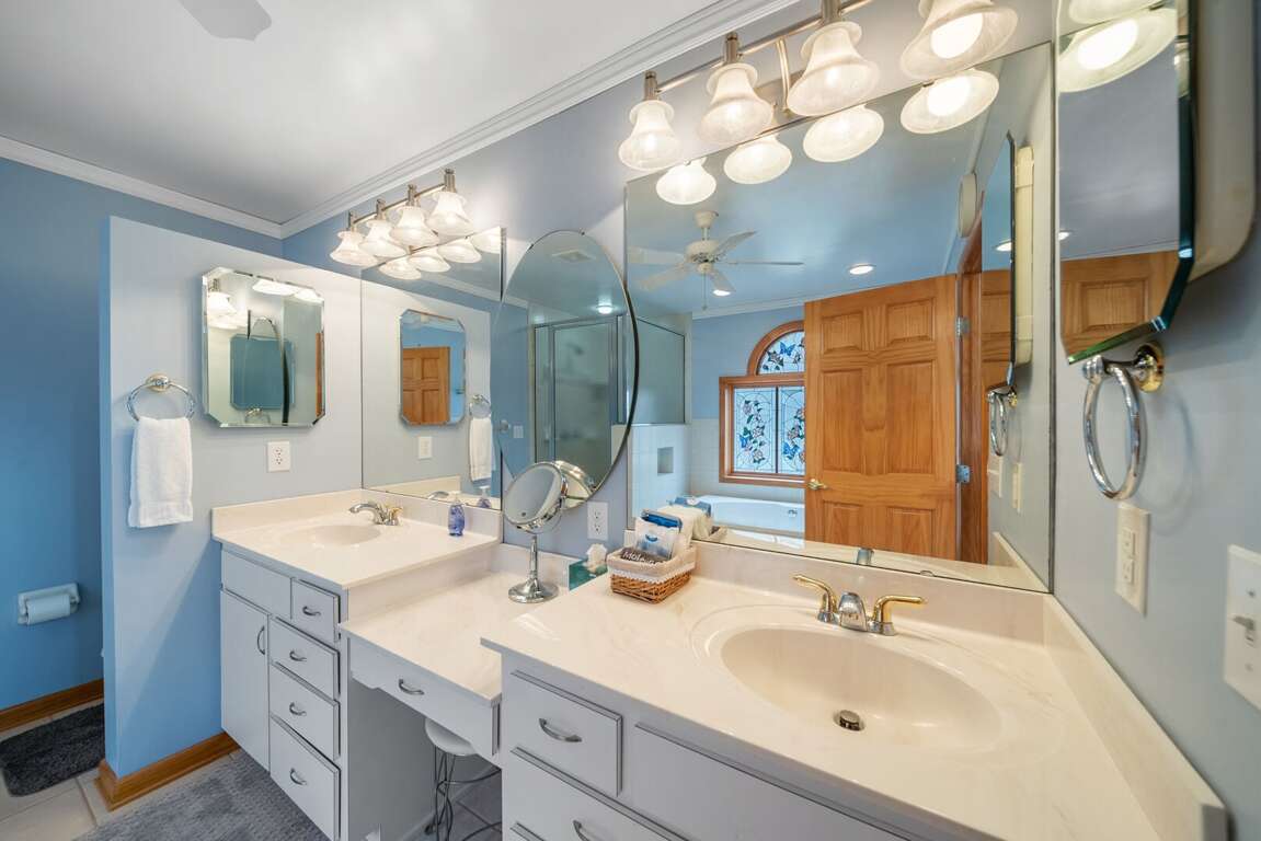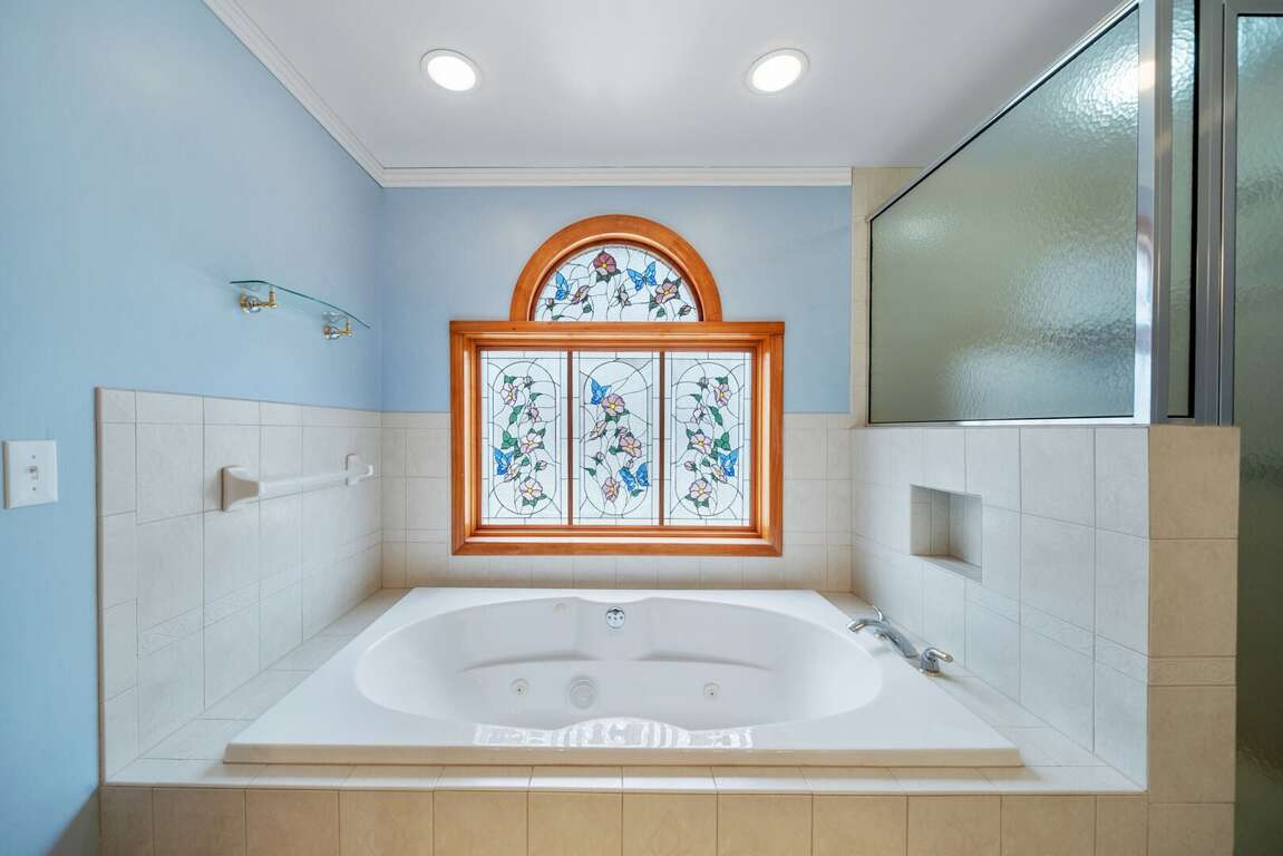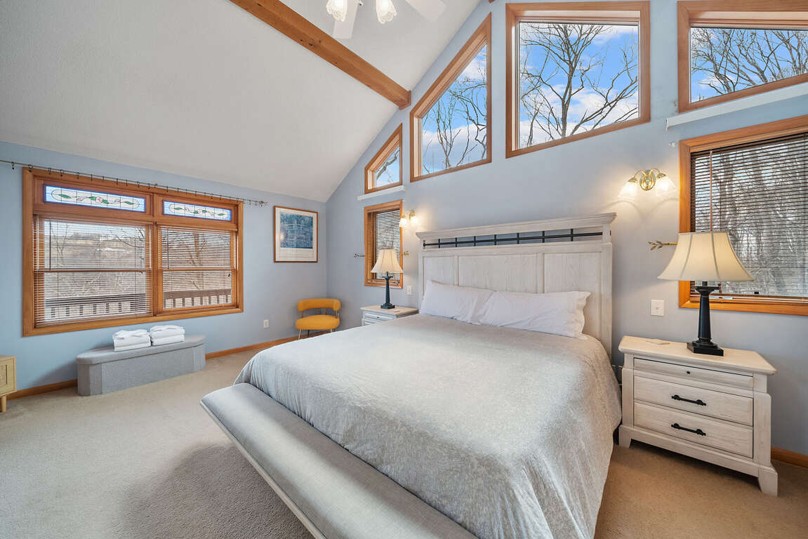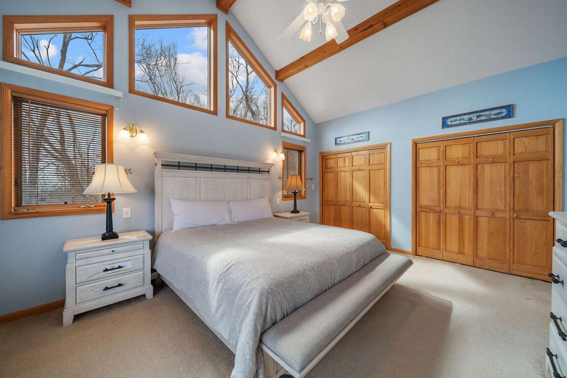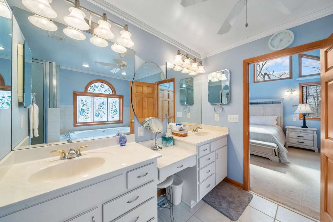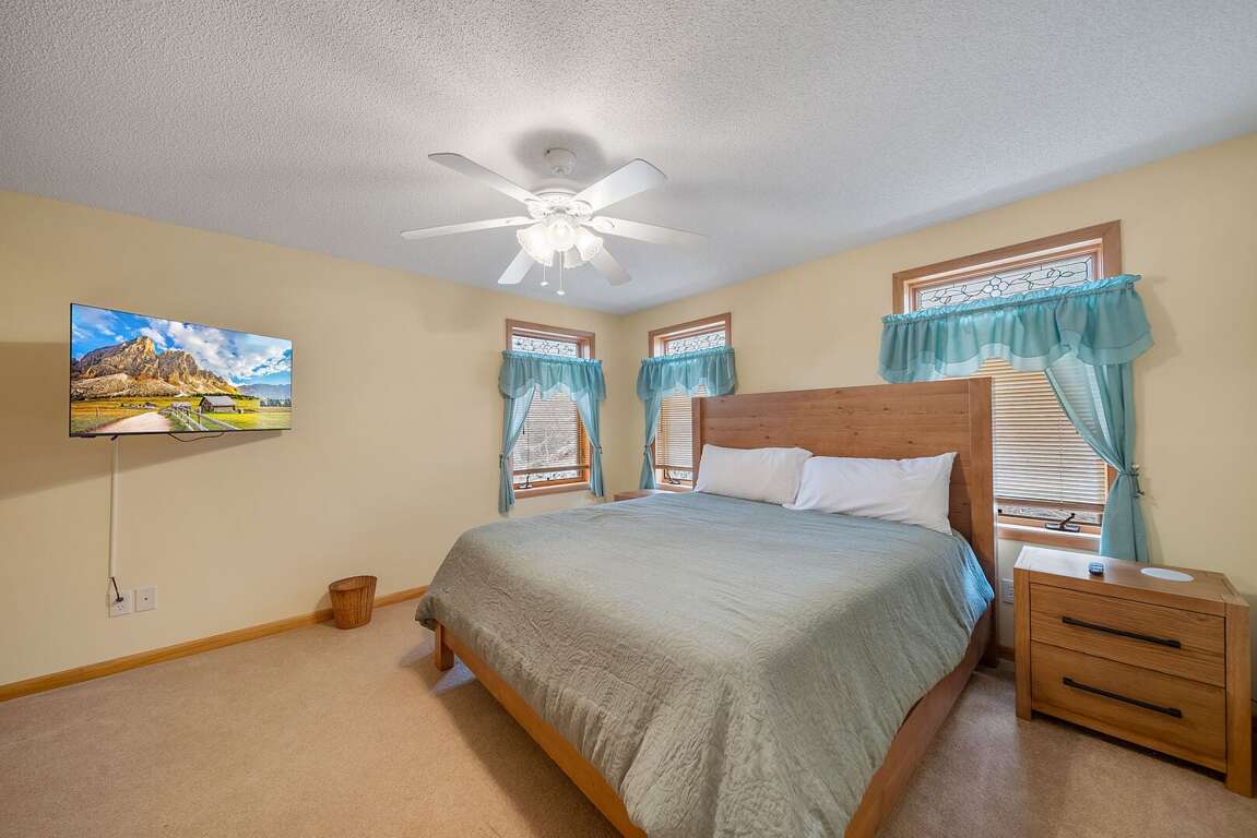 The primary suite on the main level is a peaceful haven featuring tasteful décor, numerous large windows bathing the space in natural light, a plush king bed, and a private TV. The spacious ensuite bathroom feels like a spa escape with double vanities, a large jetted soaking tub perfect for unwinding, and a beautifully tiled custom shower.<br />