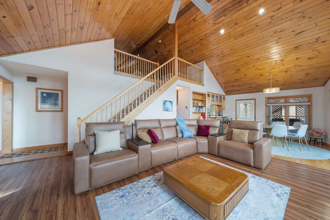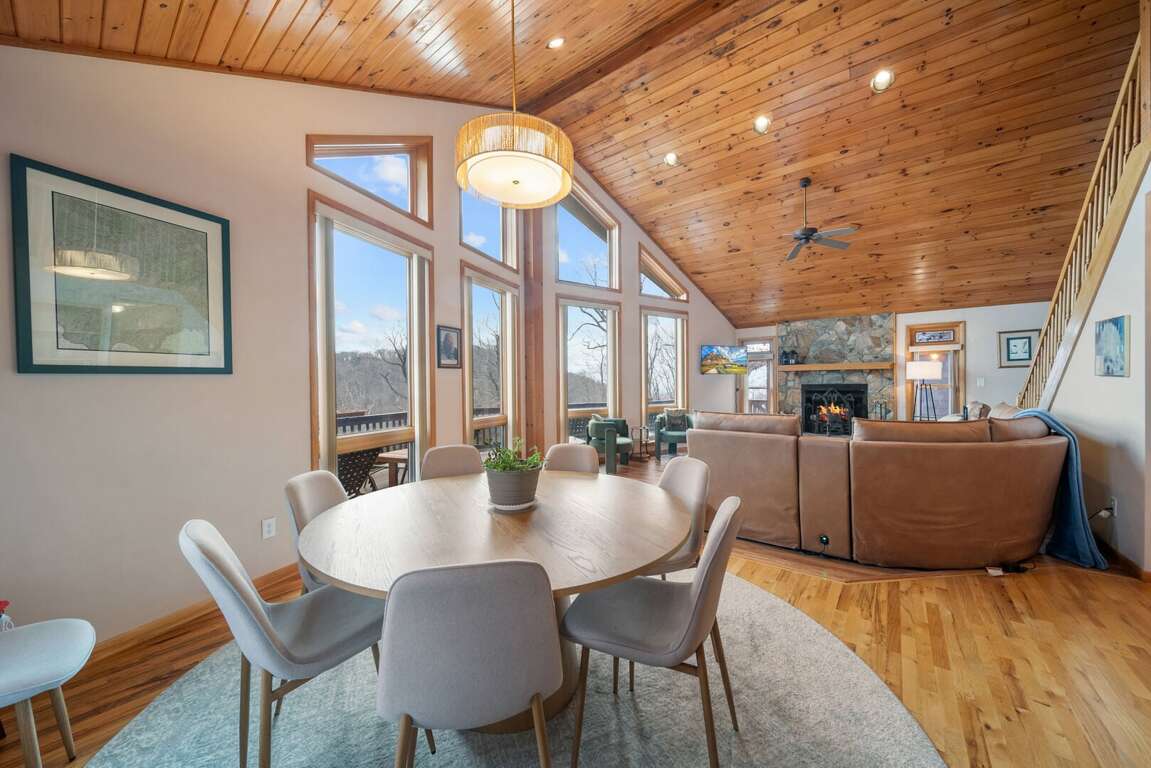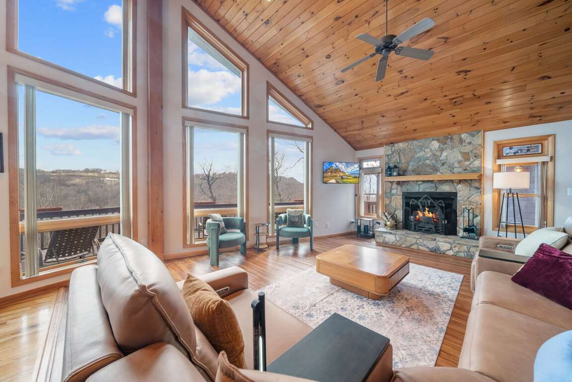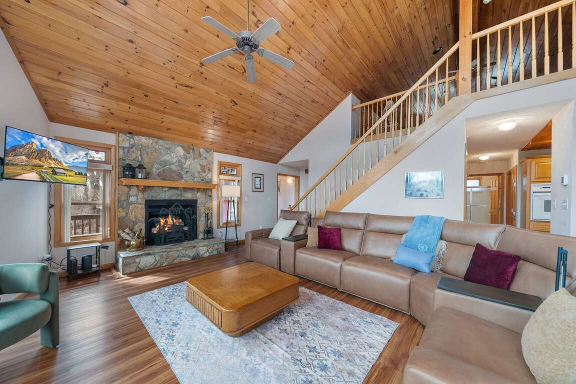 Step inside and immediately feel the warmth of the soaring vaulted tongue-and-groove ceilings and the natural light pouring through large windows that perfectly frame the breathtaking mountain scenery. The great room invites you to sink into comfortable leather seating arranged around a TV and a custom stone fireplace with gas logs—ideal for cozy evenings after a day on the slopes or trails.<br />