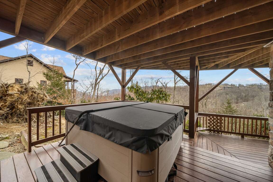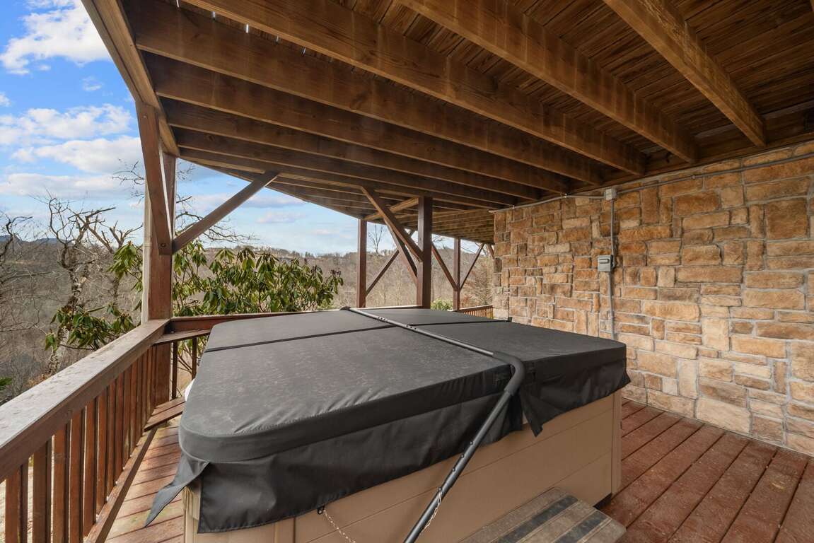Just below, the lower deck sits beside a beautifully landscaped yard and offers yet another incredible perspective. Slip into the bubbling hot tub and relax as you take in the cool mountain air and sweeping views—a perfect way to end any day.<br />