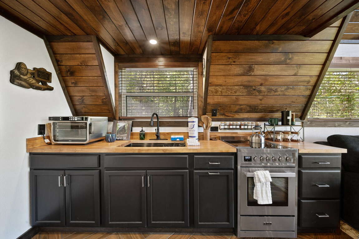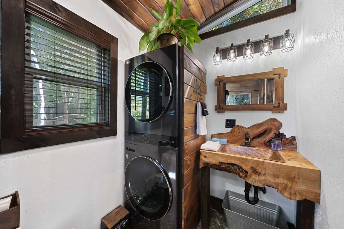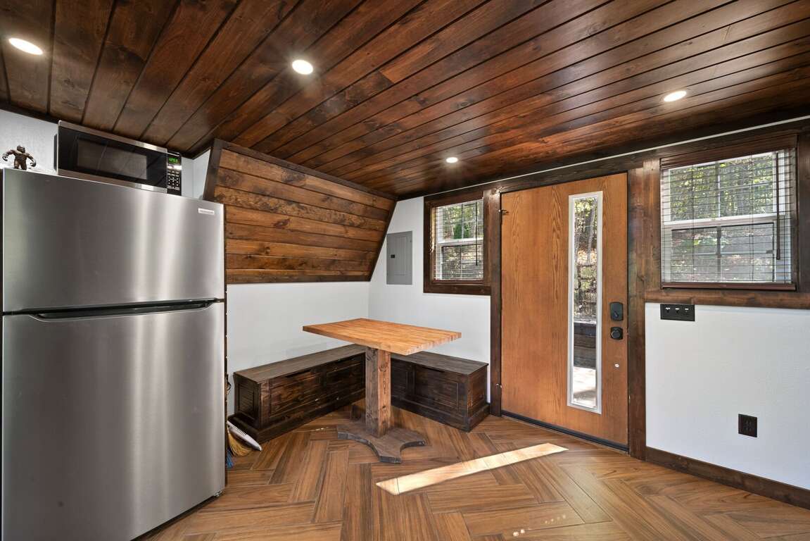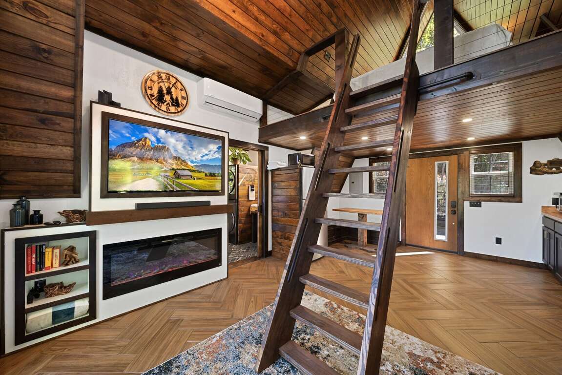 Enter into the main level to be welcomed with a fully stocked kitchen and small dining area. The adjacent living room features a cozy electric fireplace and large Smart TV above. Guests can enjoy their morning coffee or evening glass of wine on the back porch overlooking the beautiful mountain view. The full bathroom is also located on the main level and offers a custom tiled shower, a Cinderella Incineration toilet (instructions will be provided before check-in), and a stacked washer and dryer. Head upstairs to the loft to find a king size bed awaiting you after a day full of fun adventures! <br />