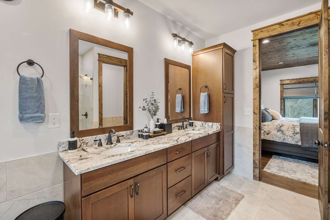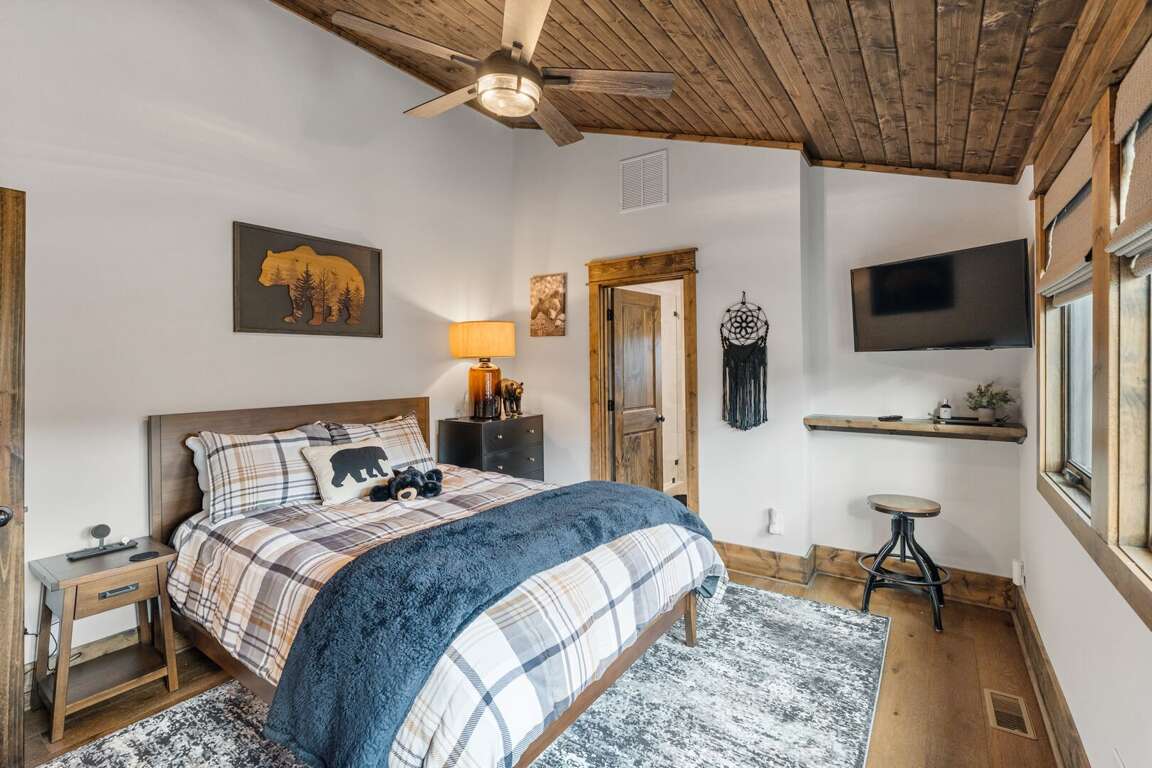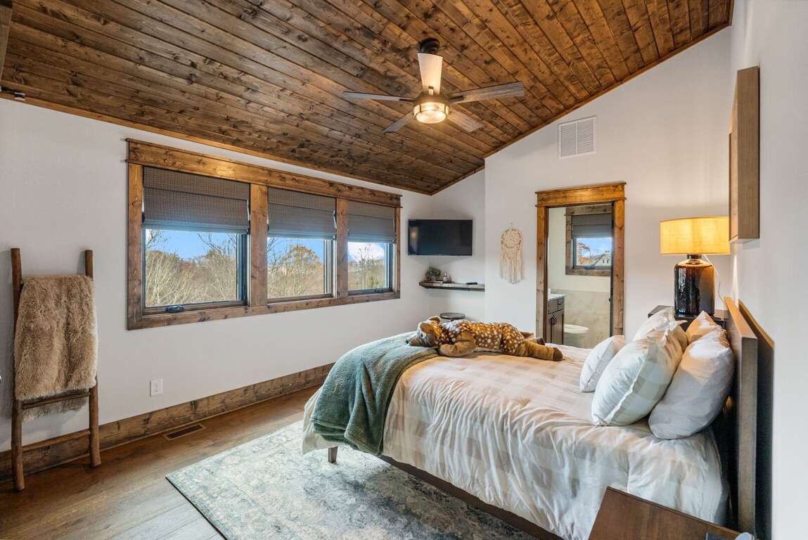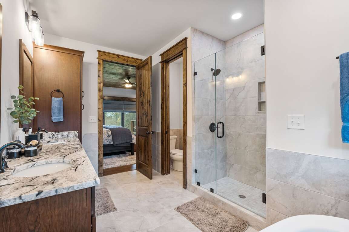 The main-level primary suite includes a king bed, TV, and a spacious bathroom with a soaking tub, double vanity, and a walk-in tiled shower. Upstairs, you’ll find two queen ensuite bedrooms, each with a TV and tiled walk-in showers.<br />