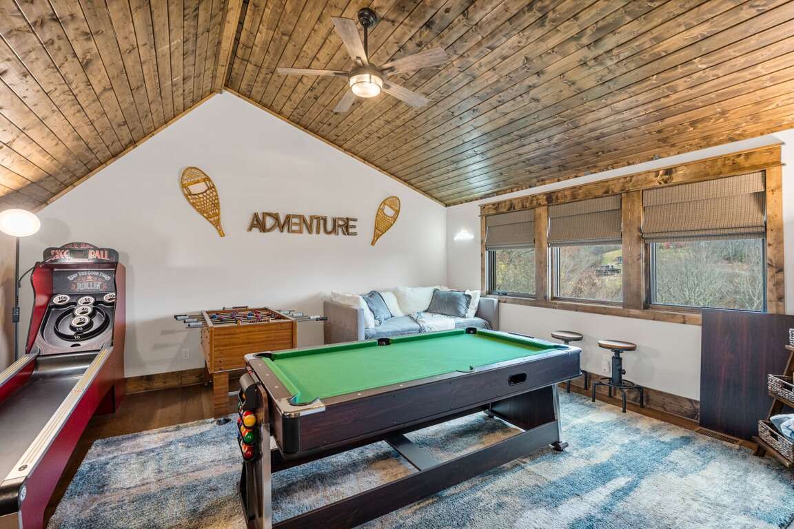 For added fun, head to the game room, featuring a pool table, foosball, Skee ball, Connect 4, tic-tac-toe, and a TV — plus a twin daybed with trundle for extra sleeping space.<br />