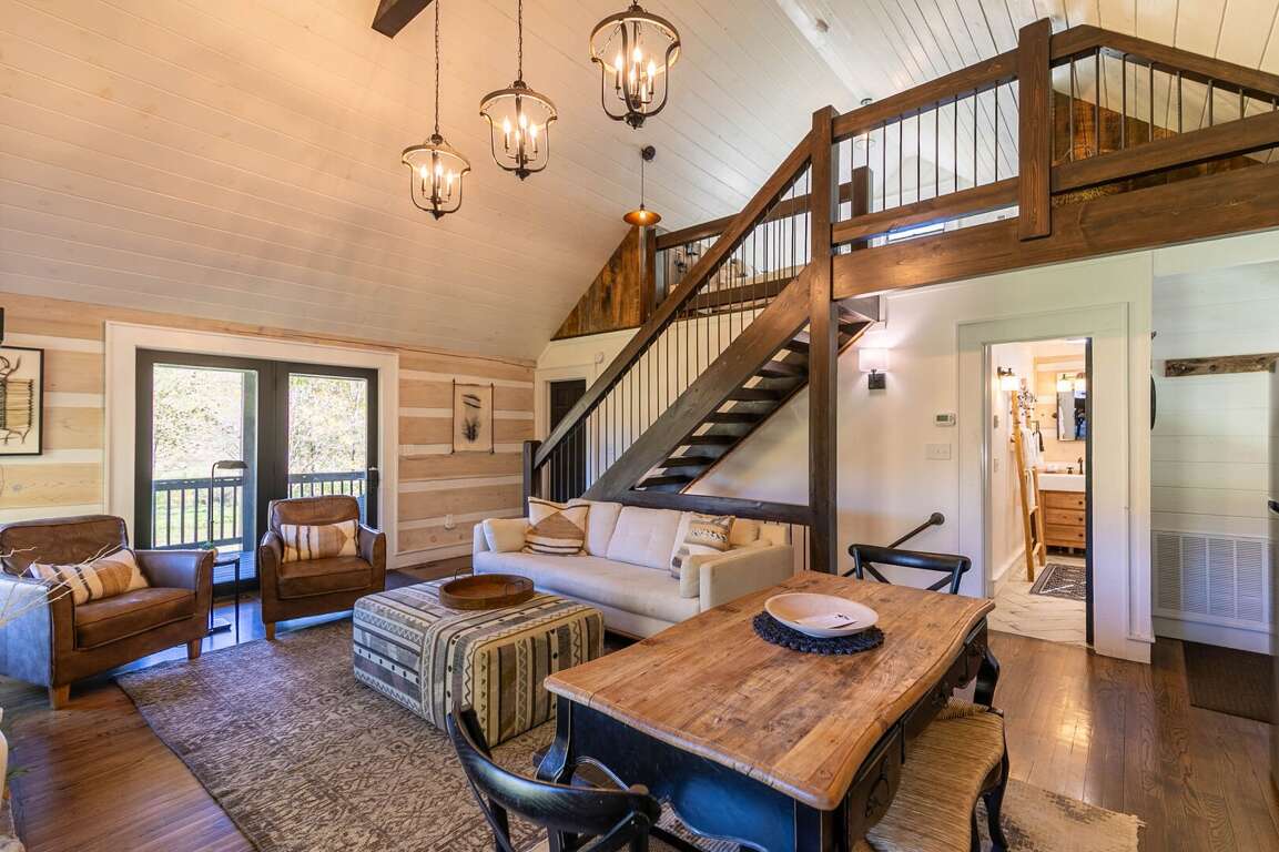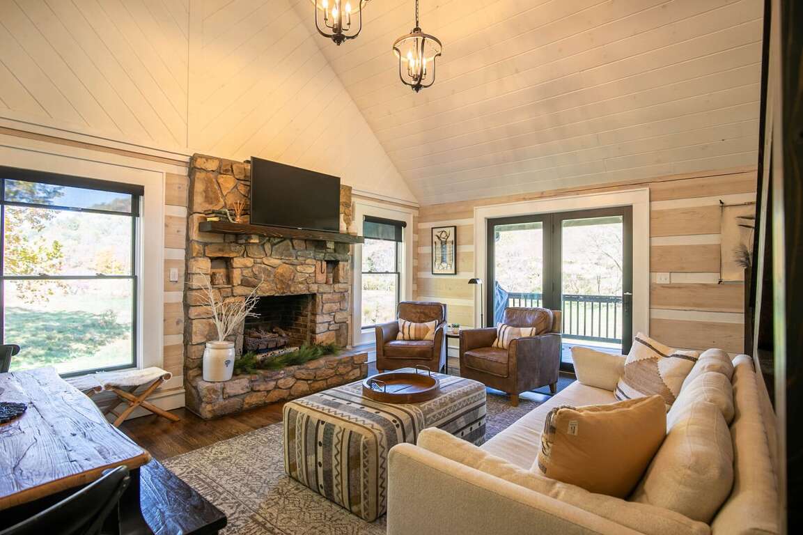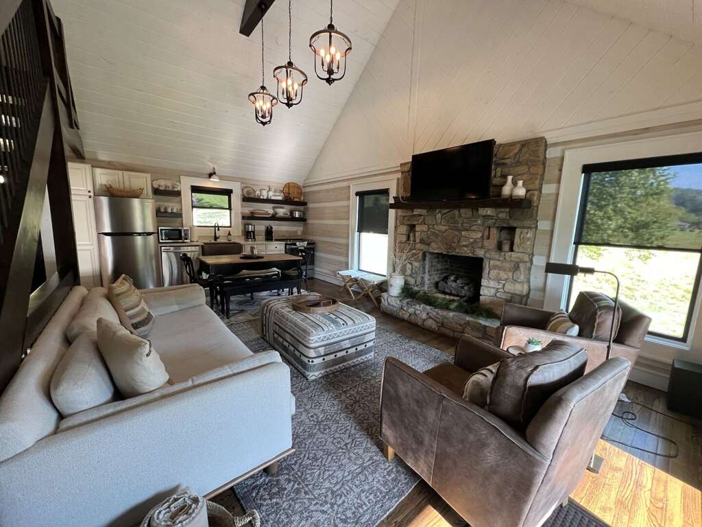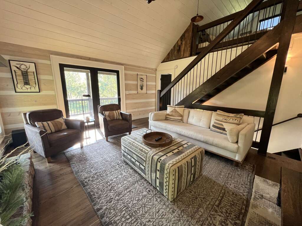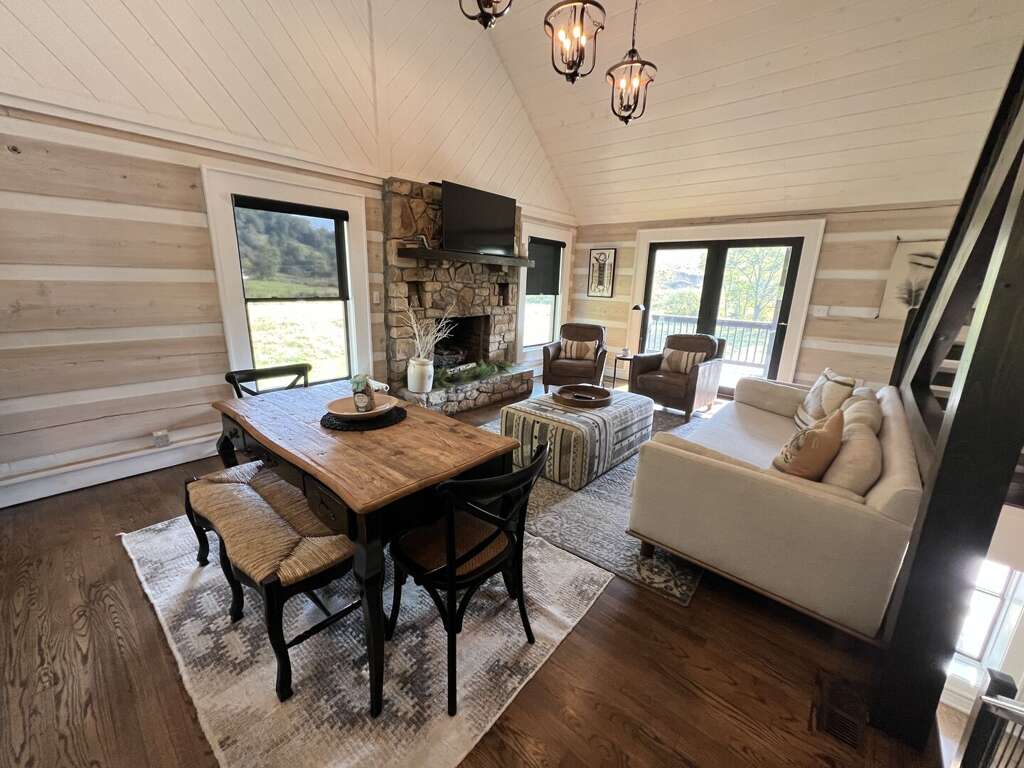 The open-concept living area features vaulted ceilings, hardwood floors, and a striking stone fireplace that sets a cozy tone. Mountain-modern finishes make the space warm and inviting, whether you’re gathered around the fire on a cool evening or sharing a meal at the dining table.<br />