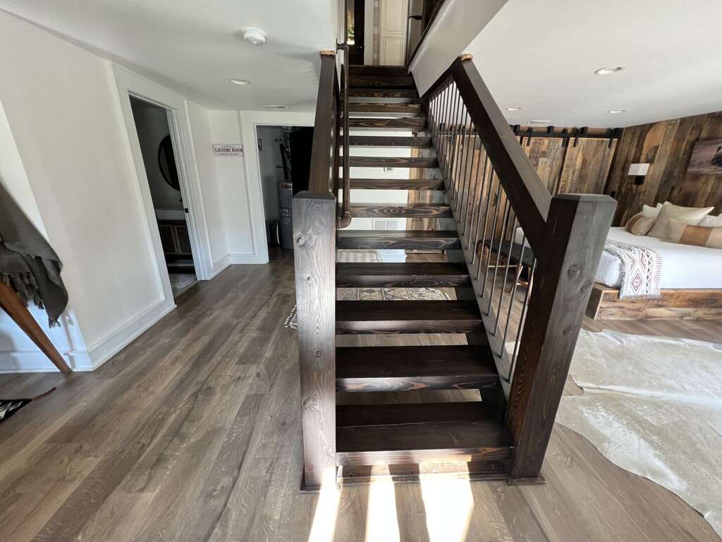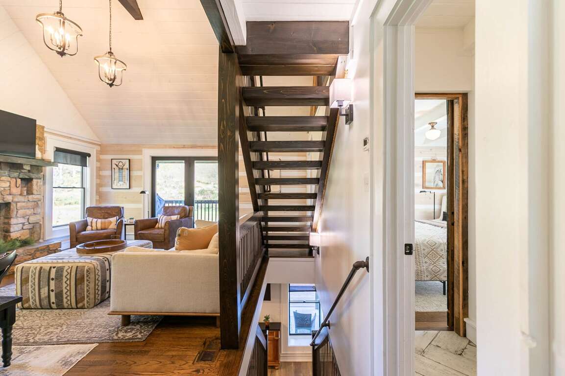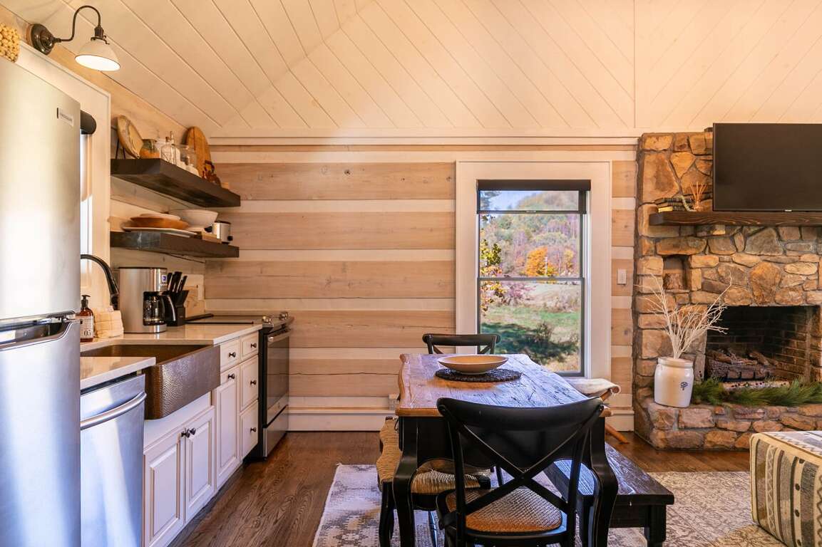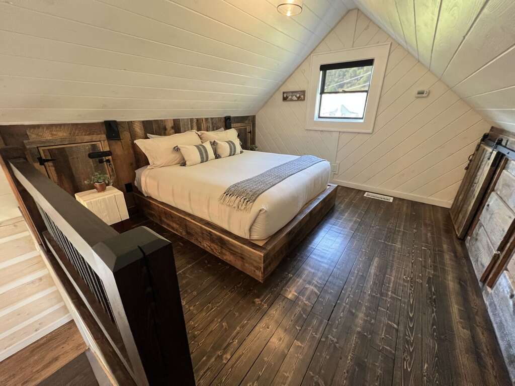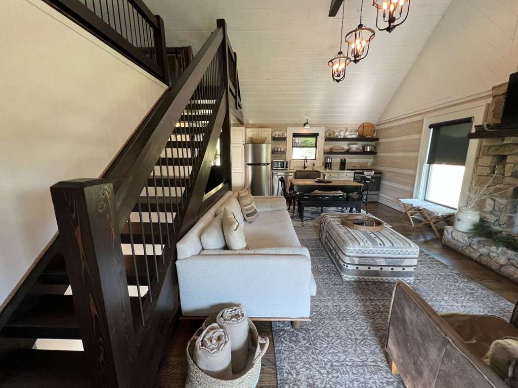 The open-concept living area features vaulted ceilings, hardwood floors, and a striking stone fireplace that sets a cozy tone. Mountain-modern finishes make the space warm and inviting, whether you’re gathered around the fire on a cool evening or sharing a meal at the dining table.<br />