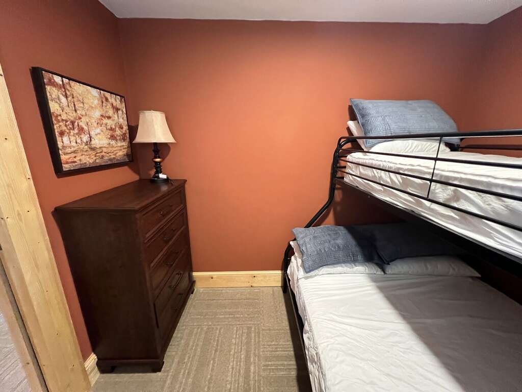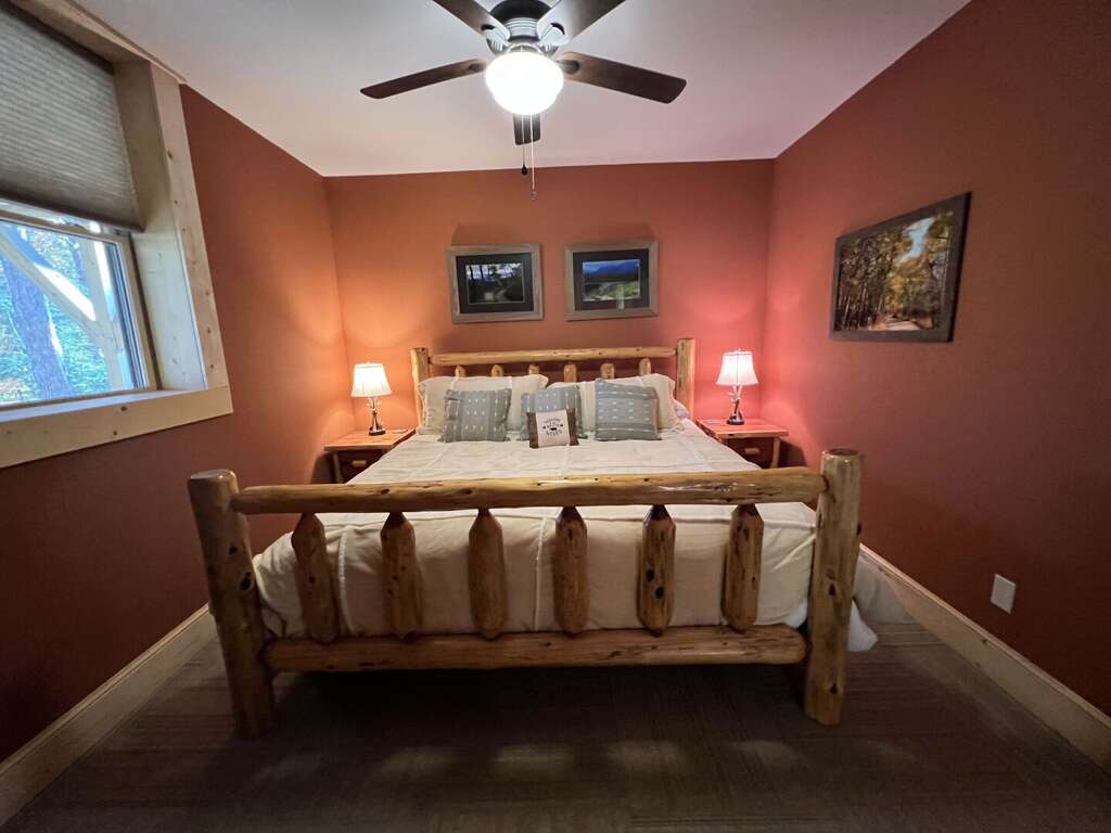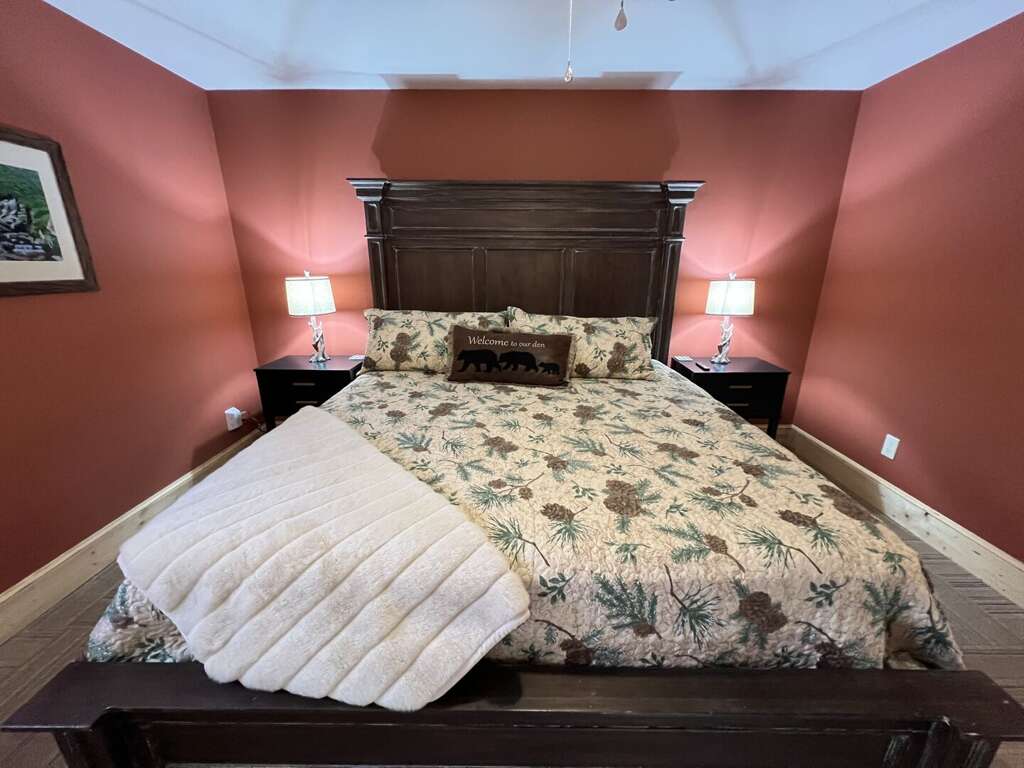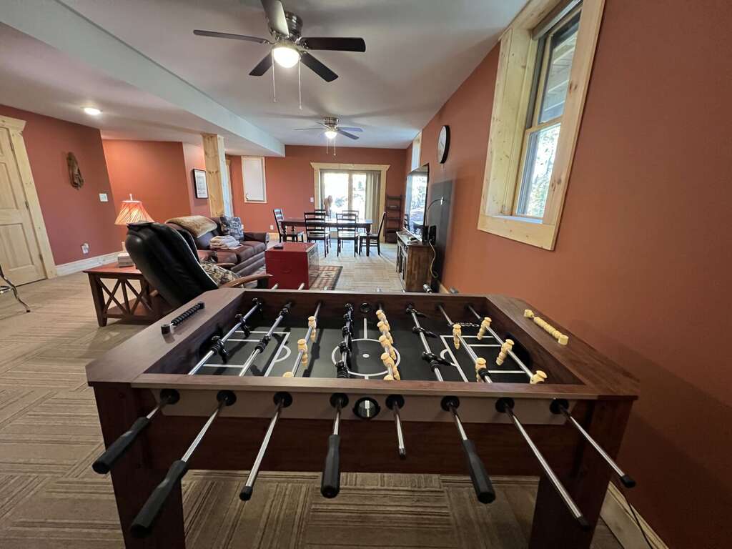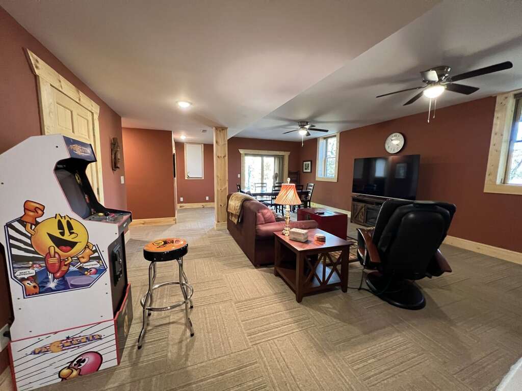 The lower level is designed for fun and relaxation, featuring a den with seating, TV, foosball table, and Pac-Man arcade. Three comfortable bedrooms are located on this level — a king bedroom with TV and ceiling fan, a second king bedroom with a rustic log bed, and a bunk room with a twin-over-full bunk for additional guests.<br />