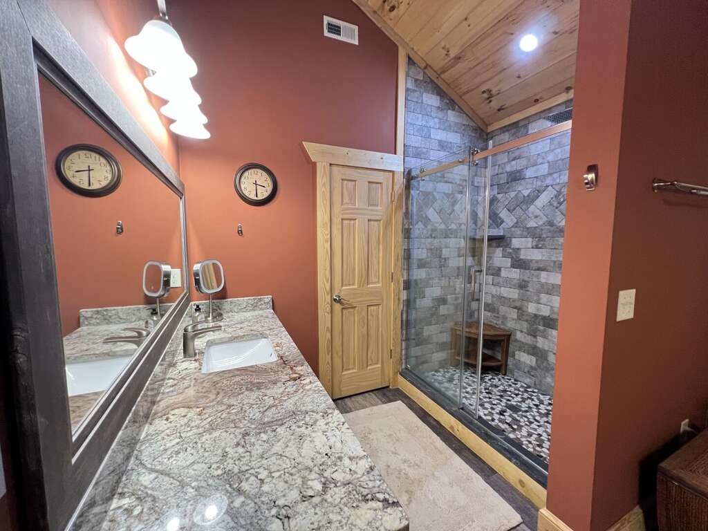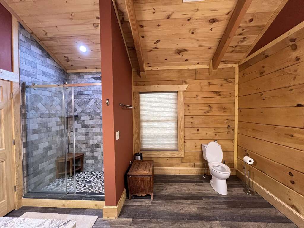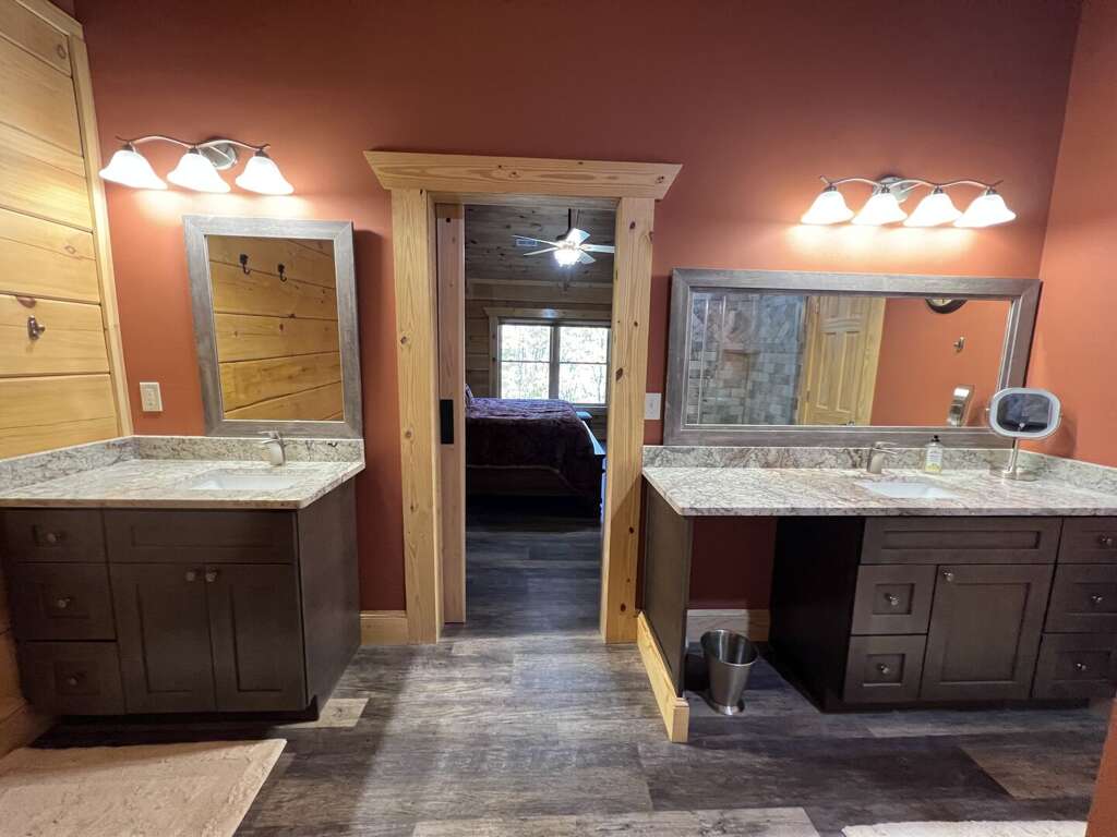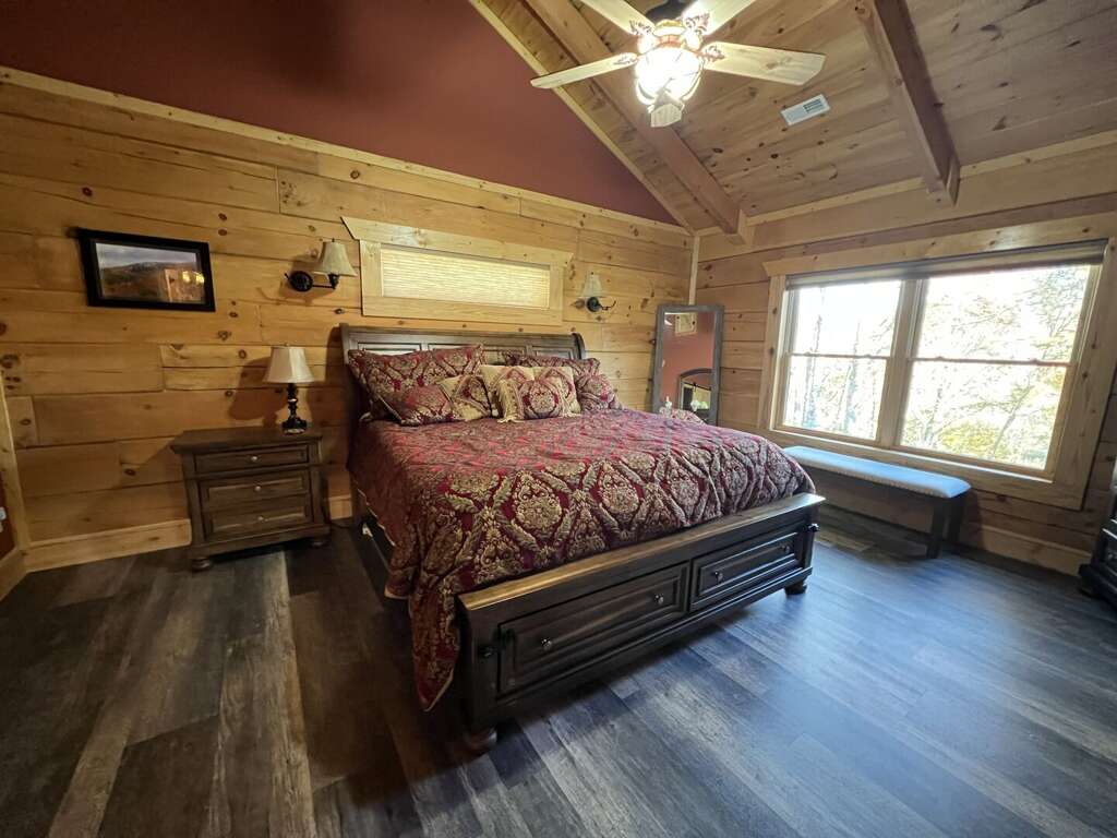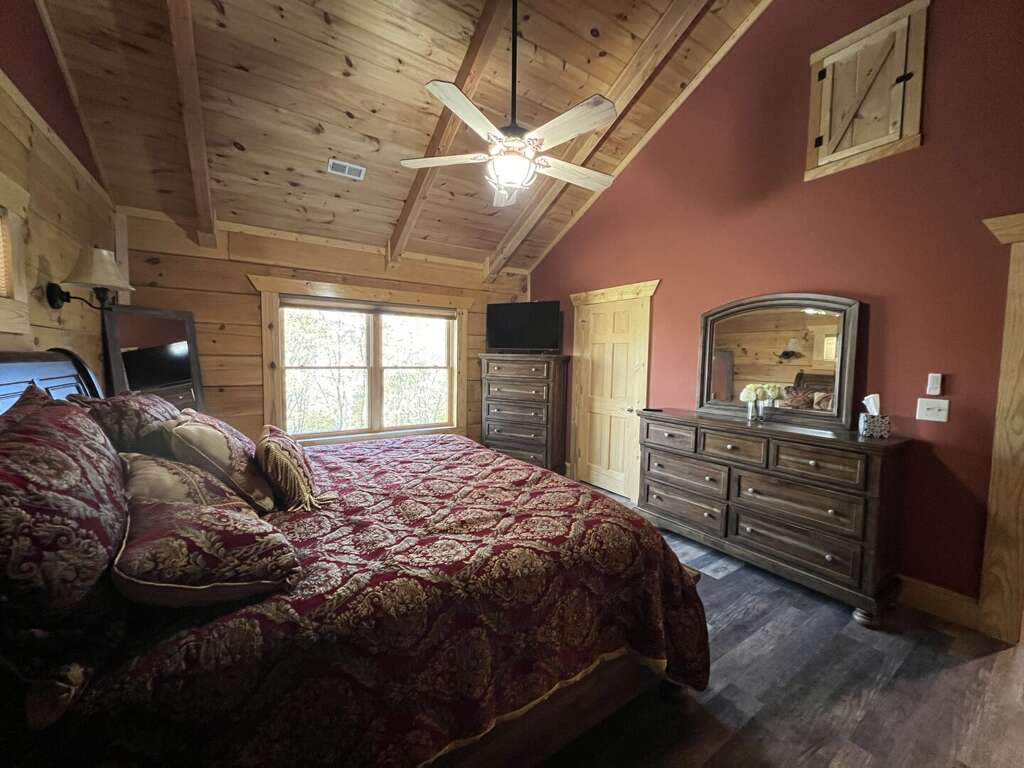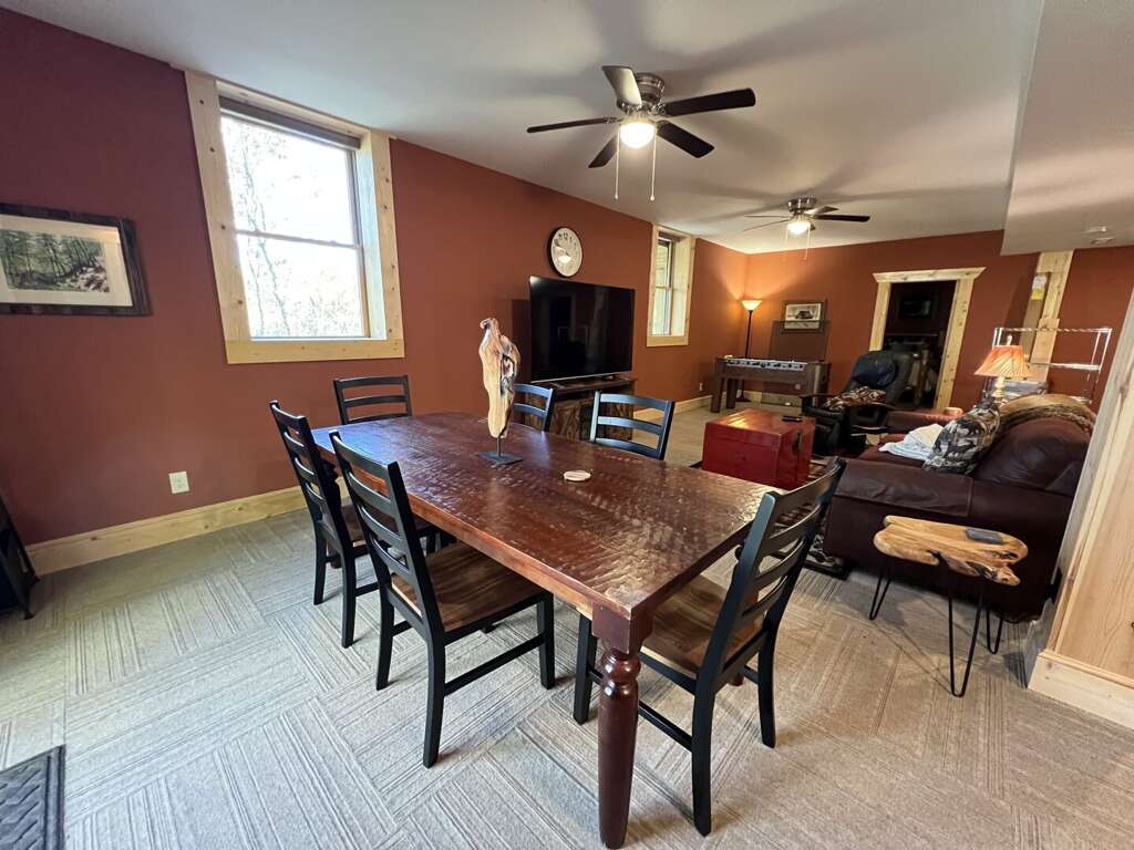 The lower level is designed for fun and relaxation, featuring a den with seating, TV, foosball table, and Pac-Man arcade. Three comfortable bedrooms are located on this level — a king bedroom with TV and ceiling fan, a second king bedroom with a rustic log bed, and a bunk room with a twin-over-full bunk for additional guests.<br />