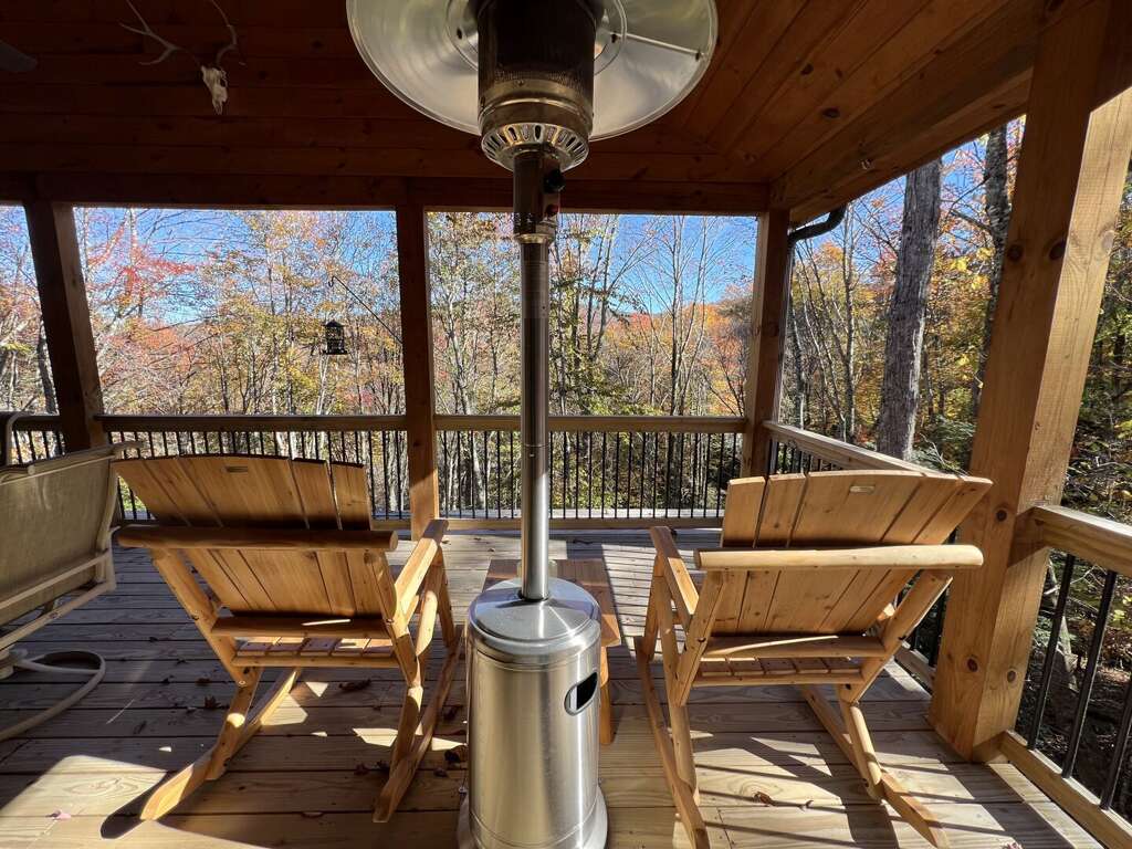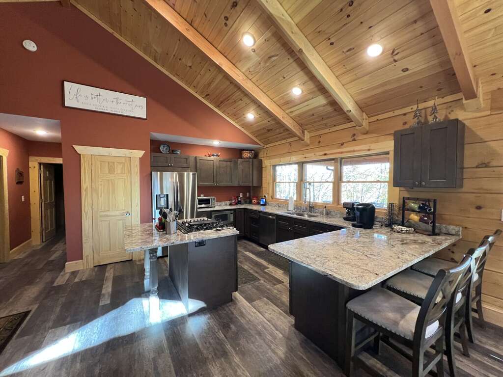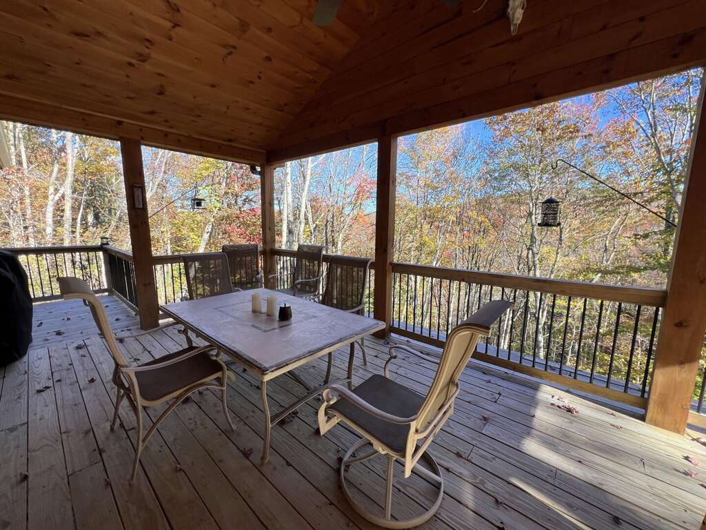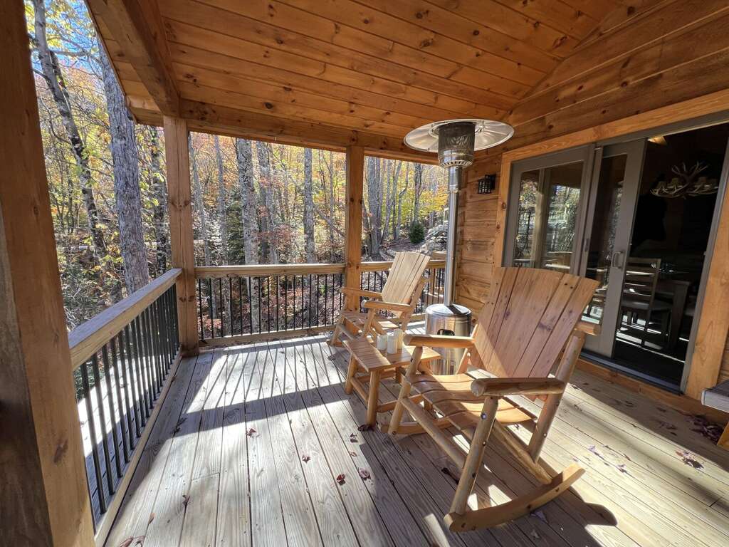 Inside, the main level features an open floor plan with a warm and inviting gas log fireplace, cozy sofa and chairs, and a large-screen TV mounted above the mantle. The dining table seats six, with room for three more at the granite peninsula, and the spacious kitchen with island makes it easy to prepare meals and gather together. A laundry center and half bath on this level add extra convenience for guests. Step outside to the covered deck, where you’ll find seasonal mountain views, a dining table for 6–8, and two large rockers for quiet mornings or sunset conversations.<br />