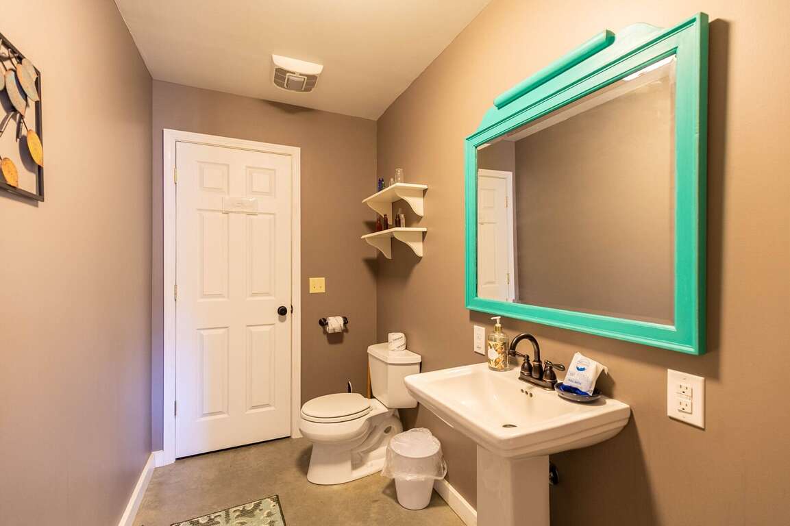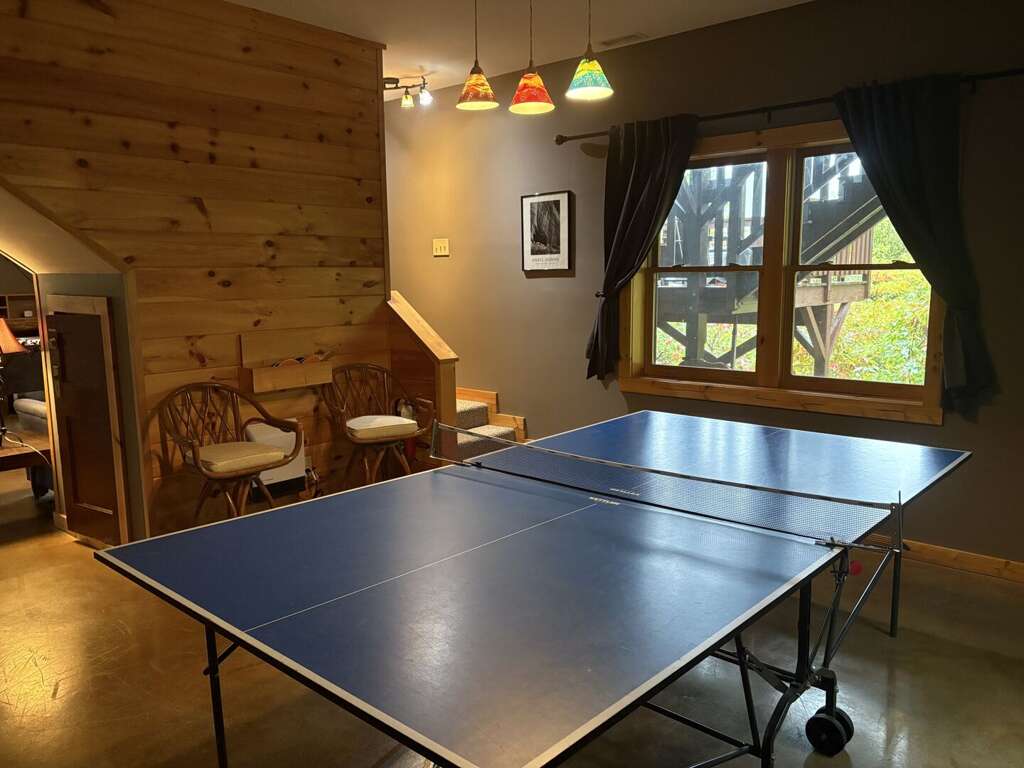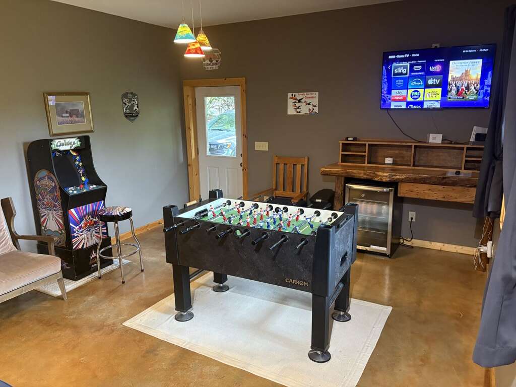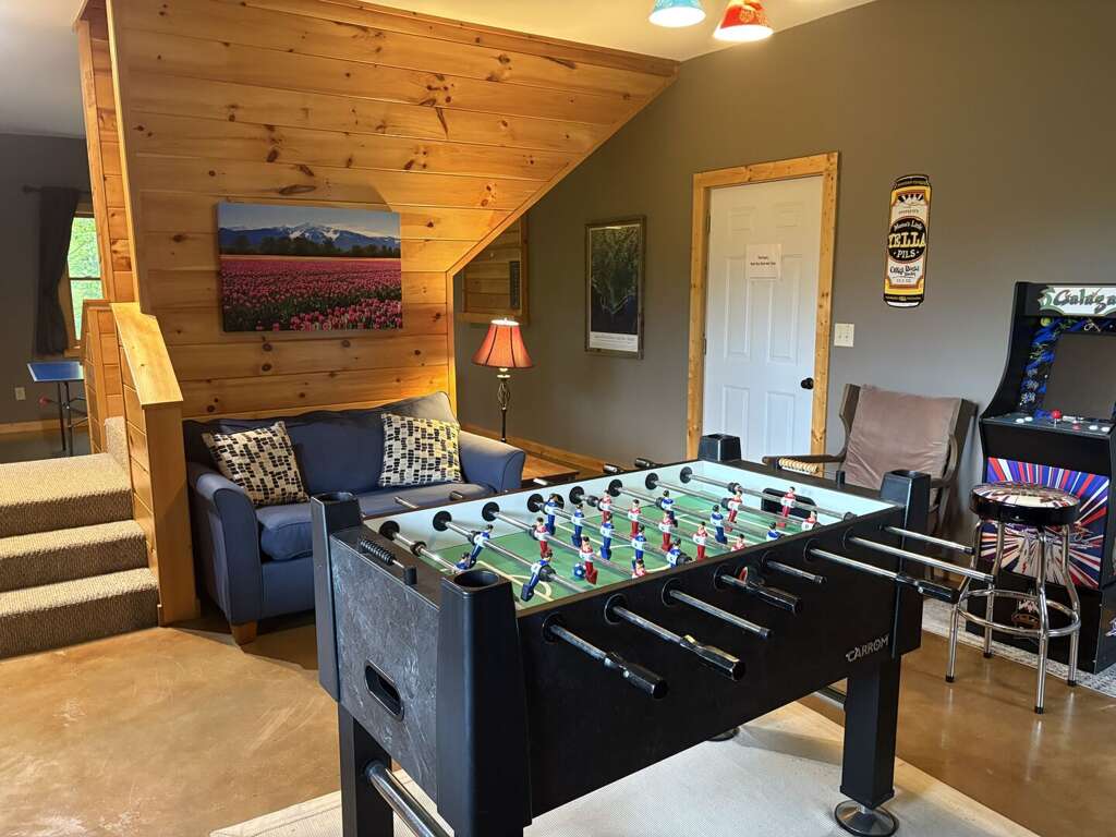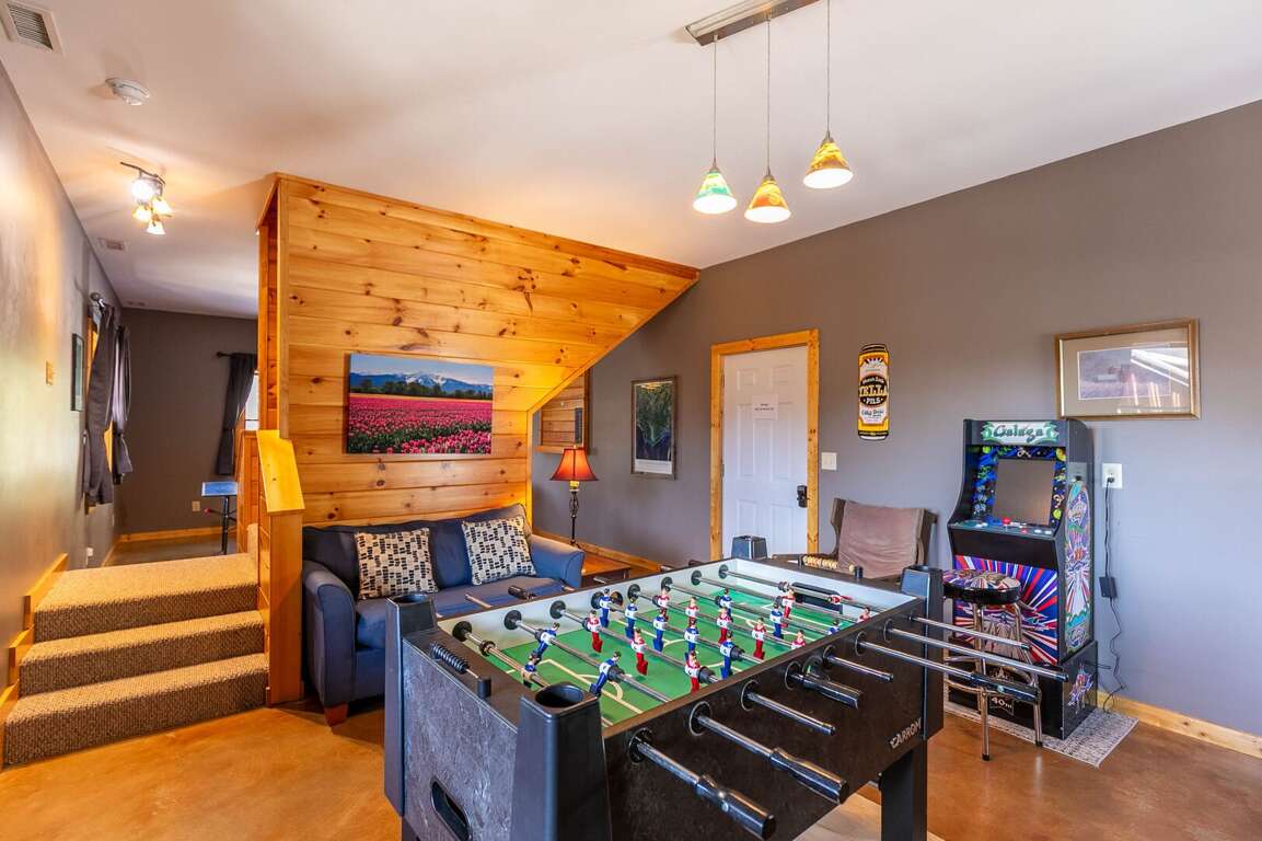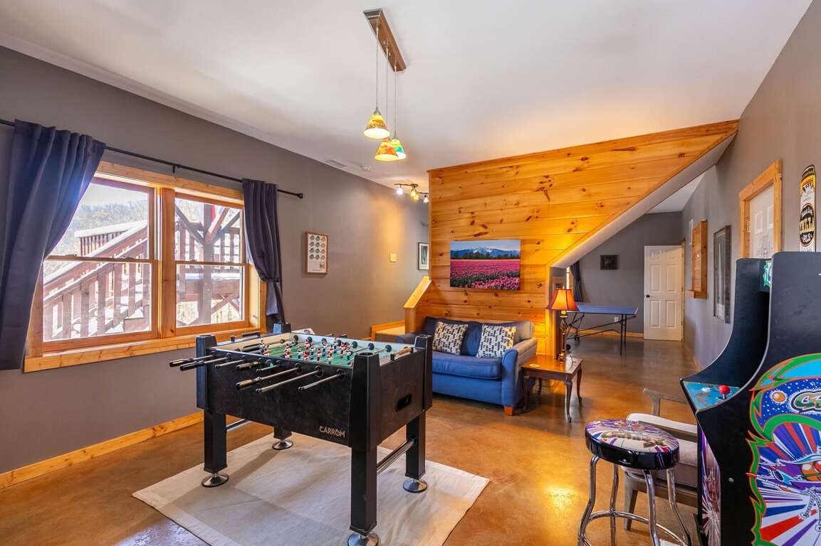 On the lower level of the home, guests can enjoy the thoughtfully designed game room which features a ping-pong table, a Foosball table, an arcade machine, and a bar area with a wine fridge and TV. There is also a half bathroom on this level.<br />