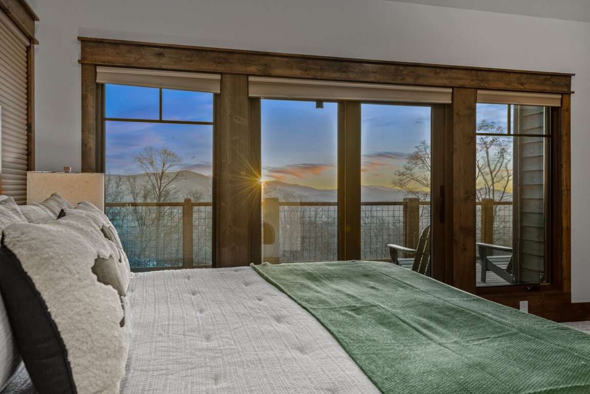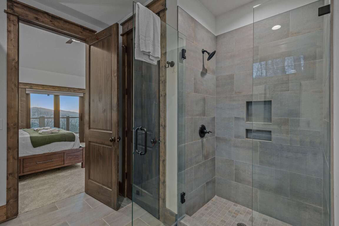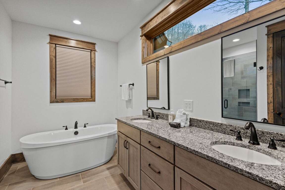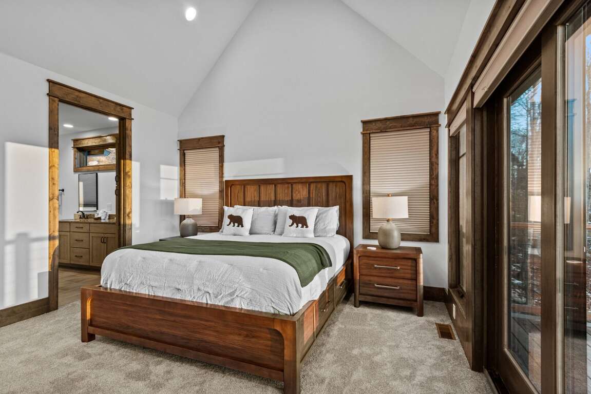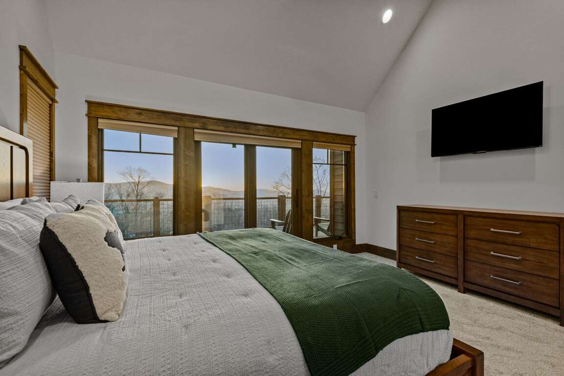 The main level features the private primary suite, designed for relaxation and comfort. This elegant retreat includes a king bed, direct deck access, a mounted Smart TV, and a luxurious ensuite bathroom with a granite double vanity, custom tiled shower, and a soothing soaking tub — the perfect way to unwind after a day in the mountains.<br />