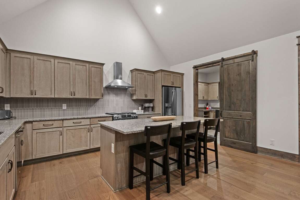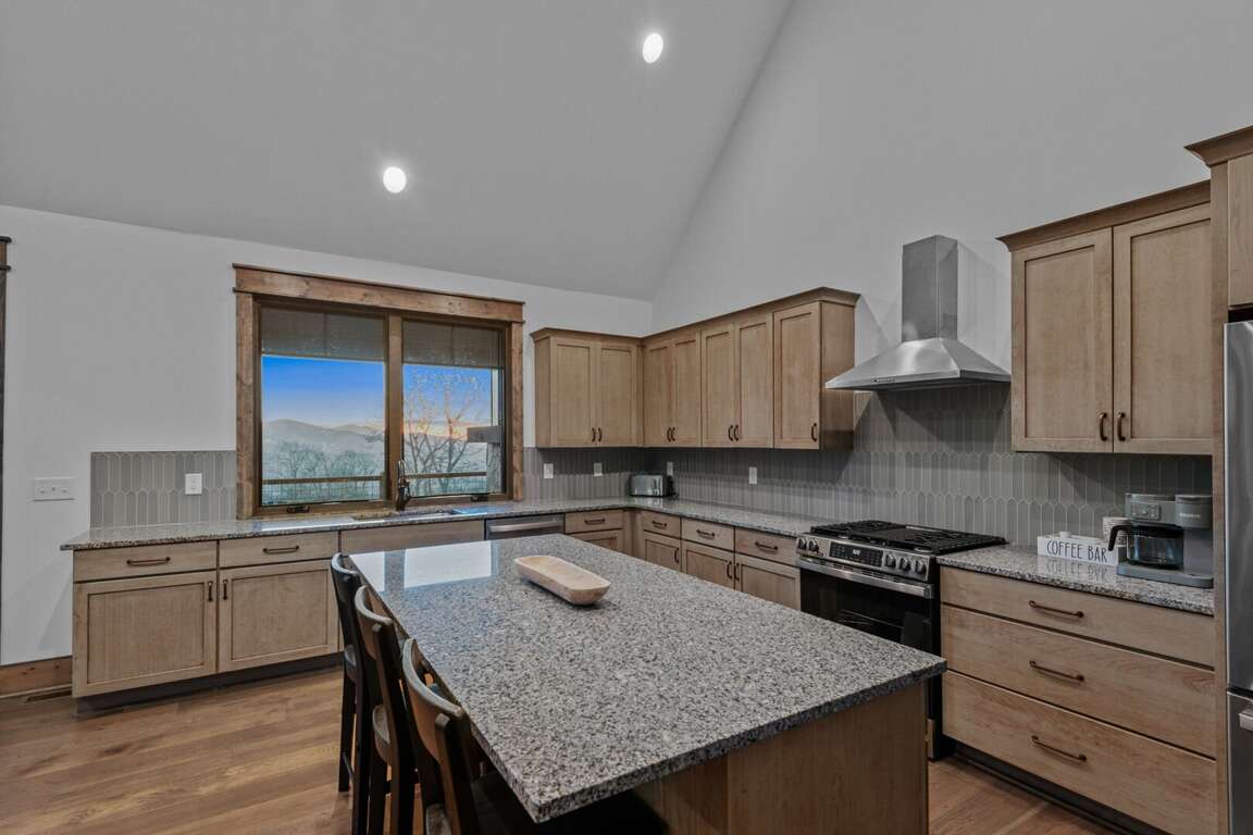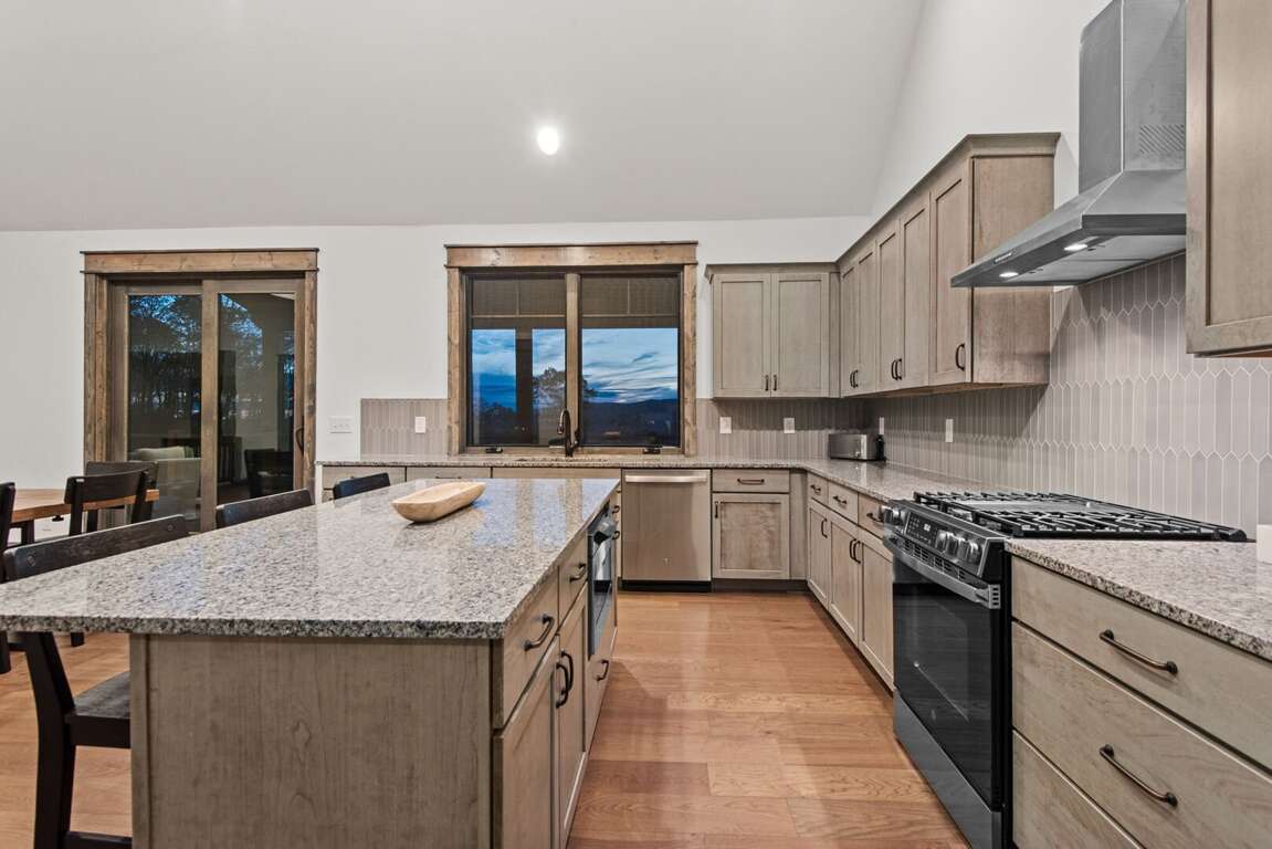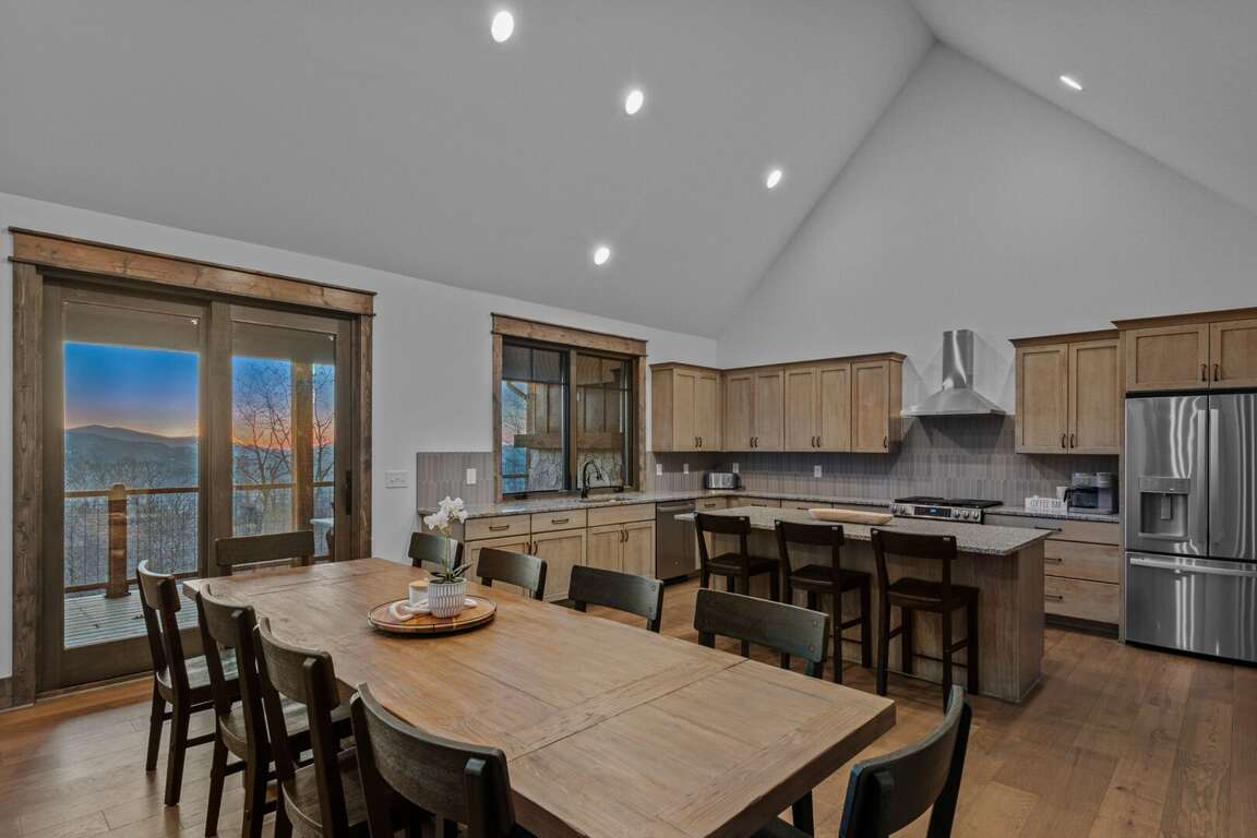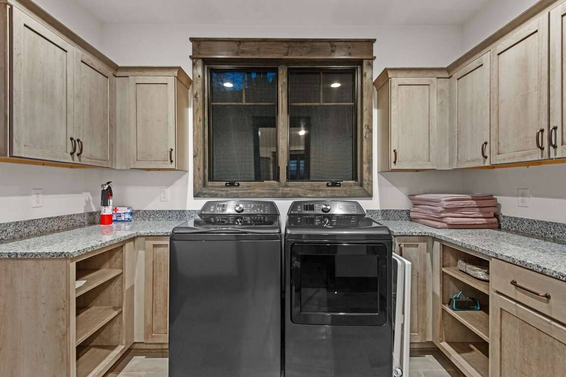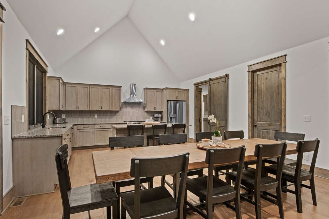 The kitchen is a chef’s dream, featuring custom cabinetry, granite countertops, a large island for gathering, and stainless-steel appliances. It comes fully stocked with kitchen essentials, ready for everything from morning coffee to a family feast. The spacious dining table comfortably seats ten guests, with additional seating for three at the nearby island counter, creating the perfect space for shared meals and conversation. A convenient half bath is located just off the kitchen, along with a nearby laundry room for added ease during your stay.<br />