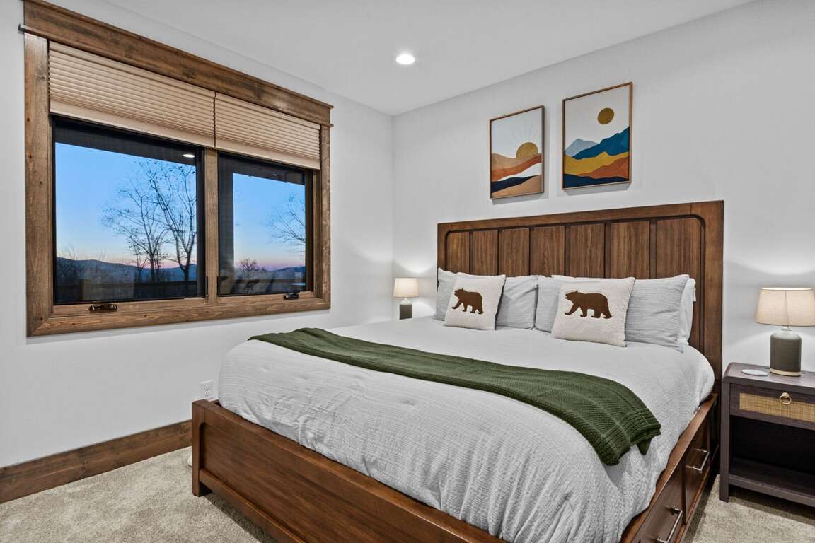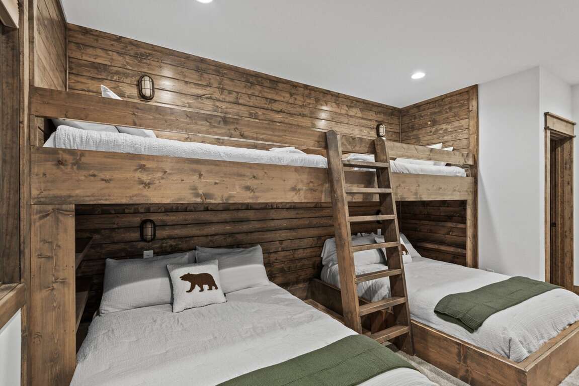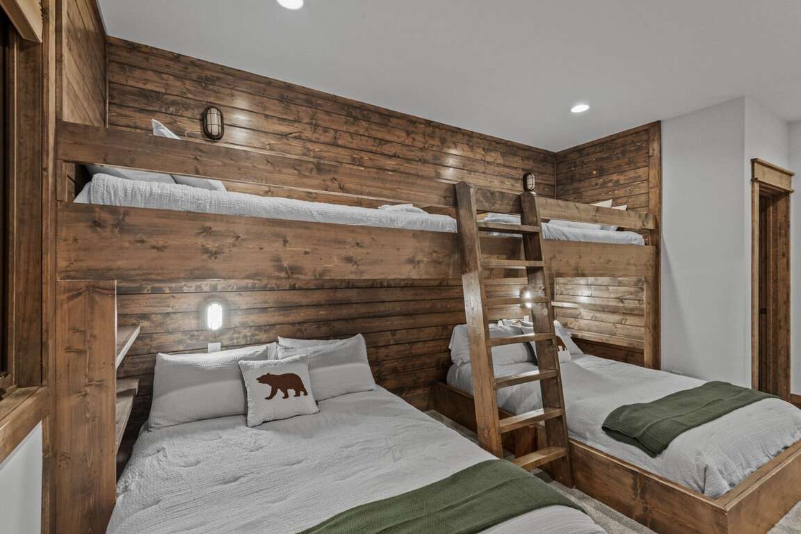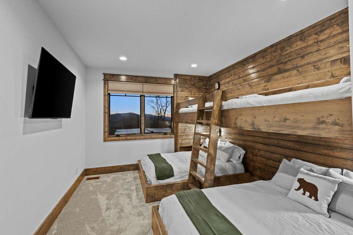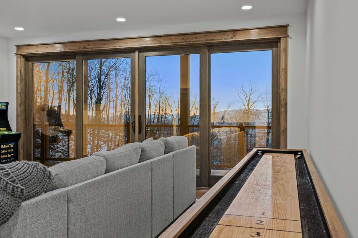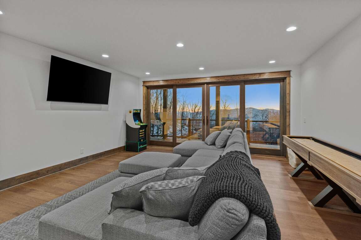 Downstairs, the lower-level living area is a bright and inviting retreat, with a full wall of windows and sliding glass doors that blur the line between indoors and out. Sink into the cozy seating for a movie night on the big-screen TV, or mix up something delicious at the nearby wet bar—perfect for cocktails, laughter, and a little friendly competition around the shuffleboard table or the Golden Tee retro arcade cabinet. Three additional bedrooms make this level a peaceful getaway for everyone, each with its own TV for private downtime. The second king suite opens directly onto the lower deck and boasts an ensuite bath with granite double vanities and a custom tiled shower. Another king bedroom sits just steps from a beautifully tiled hallway bath, while the bunk room steals the show with its custom-built bunks—two twins over two queens—and a private ensuite that keeps everyone happy after a long day of fun.<br />
