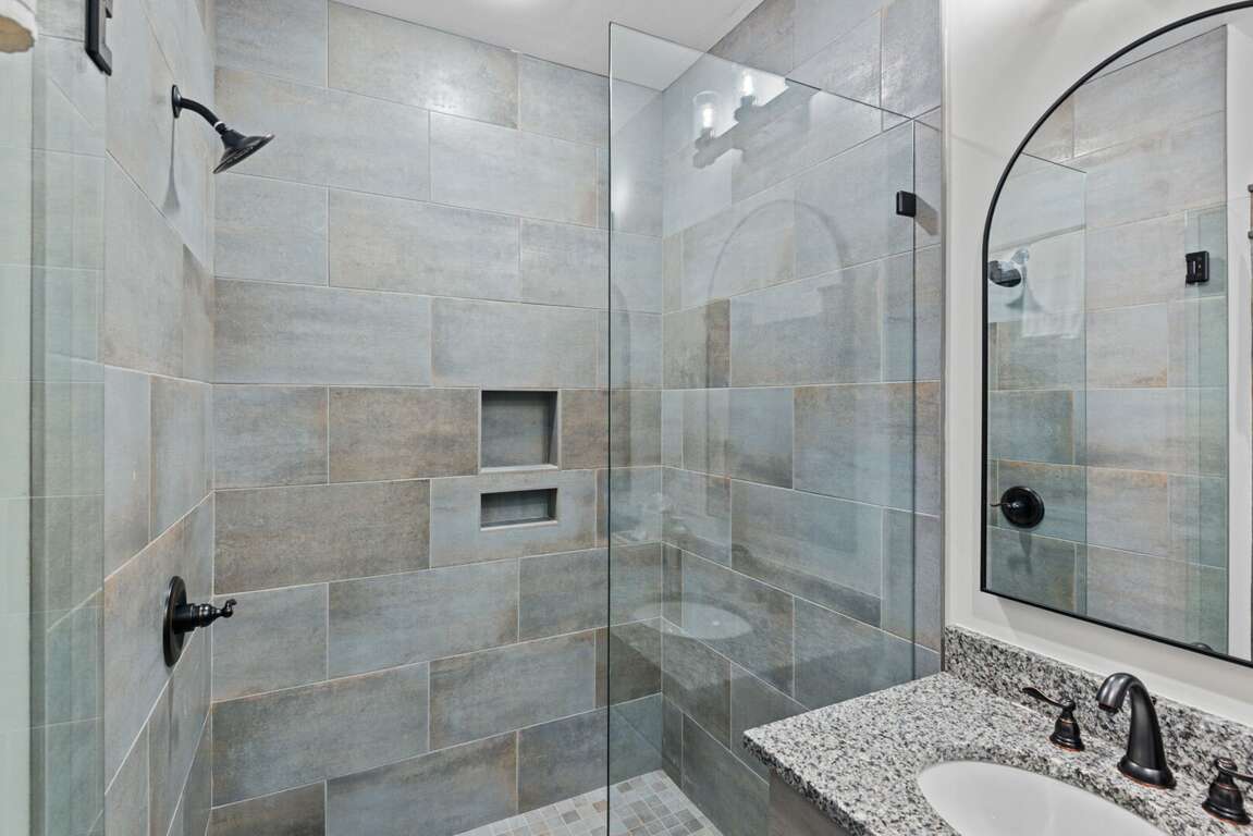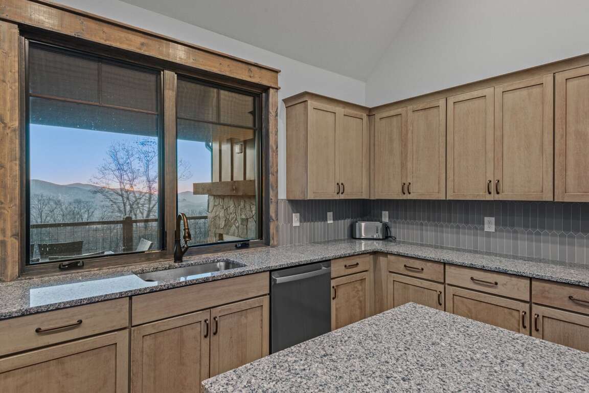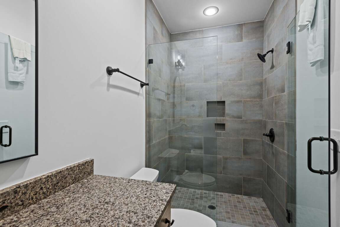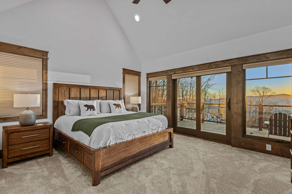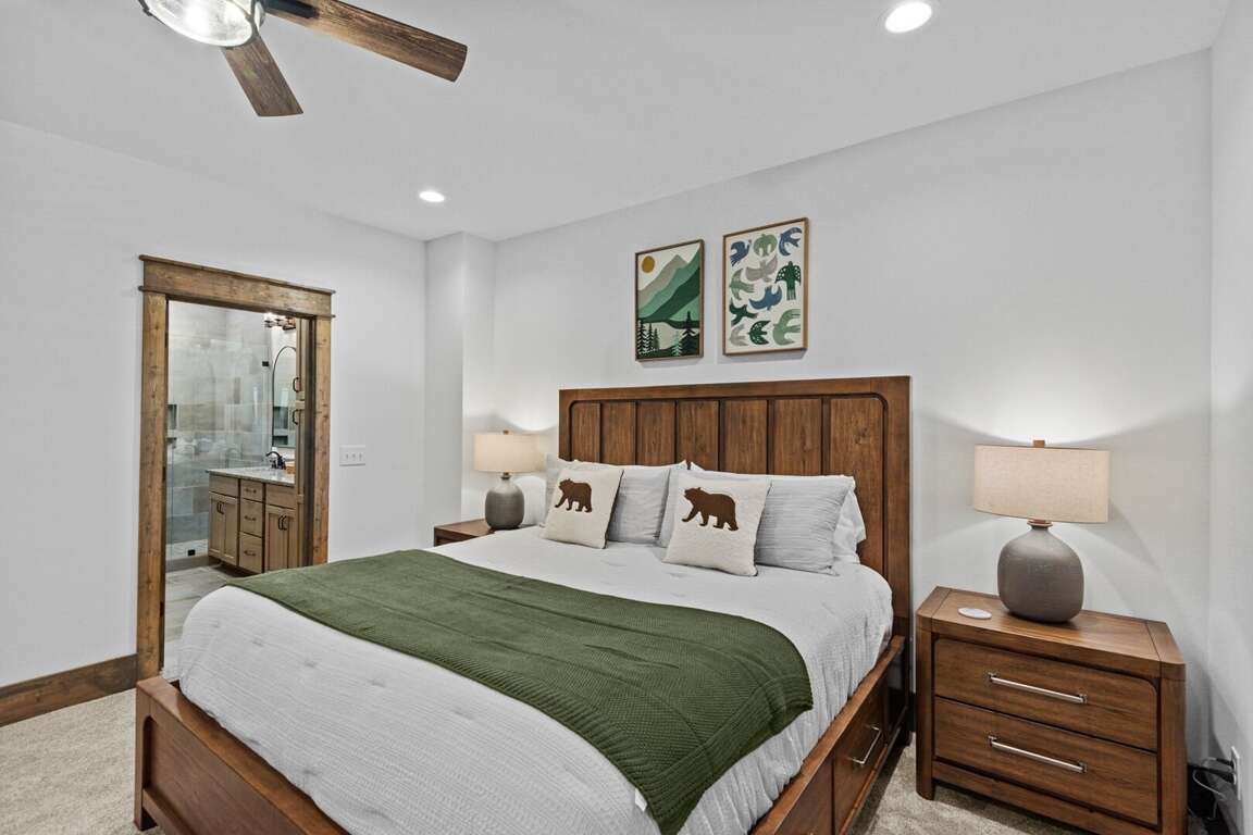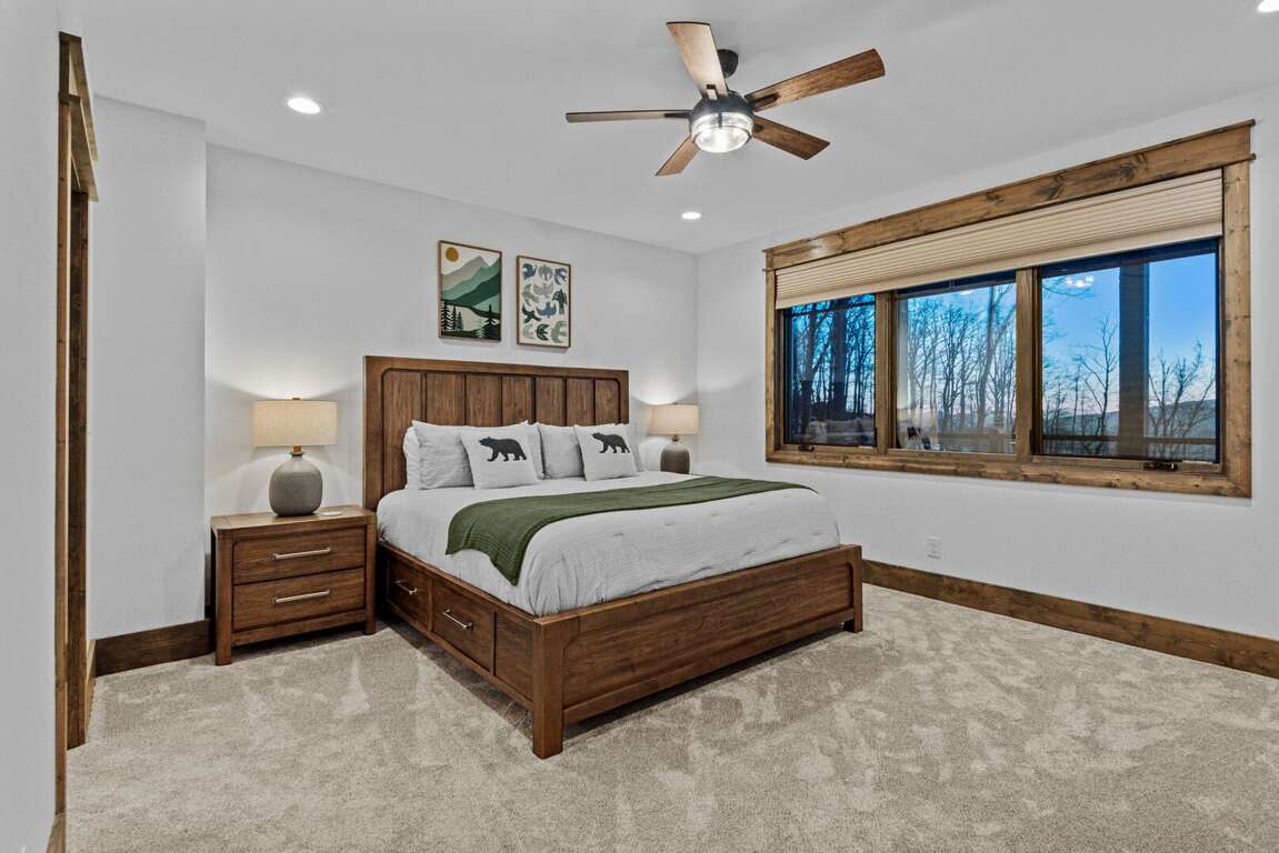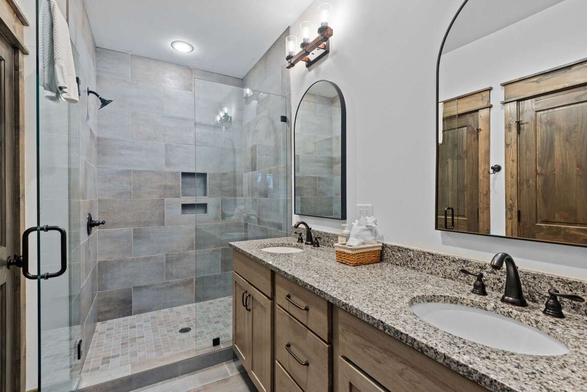 Downstairs, the lower-level living area is a bright and inviting retreat, with a full wall of windows and sliding glass doors that blur the line between indoors and out. Sink into the cozy seating for a movie night on the big-screen TV, or mix up something delicious at the nearby wet bar—perfect for cocktails, laughter, and a little friendly competition around the shuffleboard table or the Golden Tee retro arcade cabinet. Three additional bedrooms make this level a peaceful getaway for everyone, each with its own TV for private downtime. The second king suite opens directly onto the lower deck and boasts an ensuite bath with granite double vanities and a custom tiled shower. Another king bedroom sits just steps from a beautifully tiled hallway bath, while the bunk room steals the show with its custom-built bunks—two twins over two queens—and a private ensuite that keeps everyone happy after a long day of fun.<br />