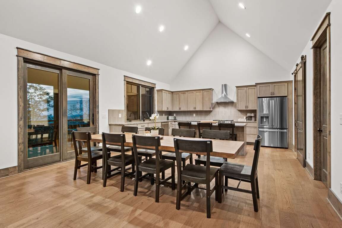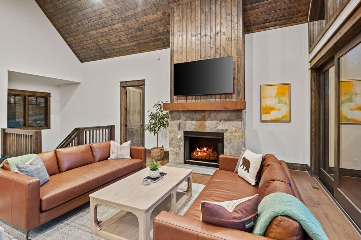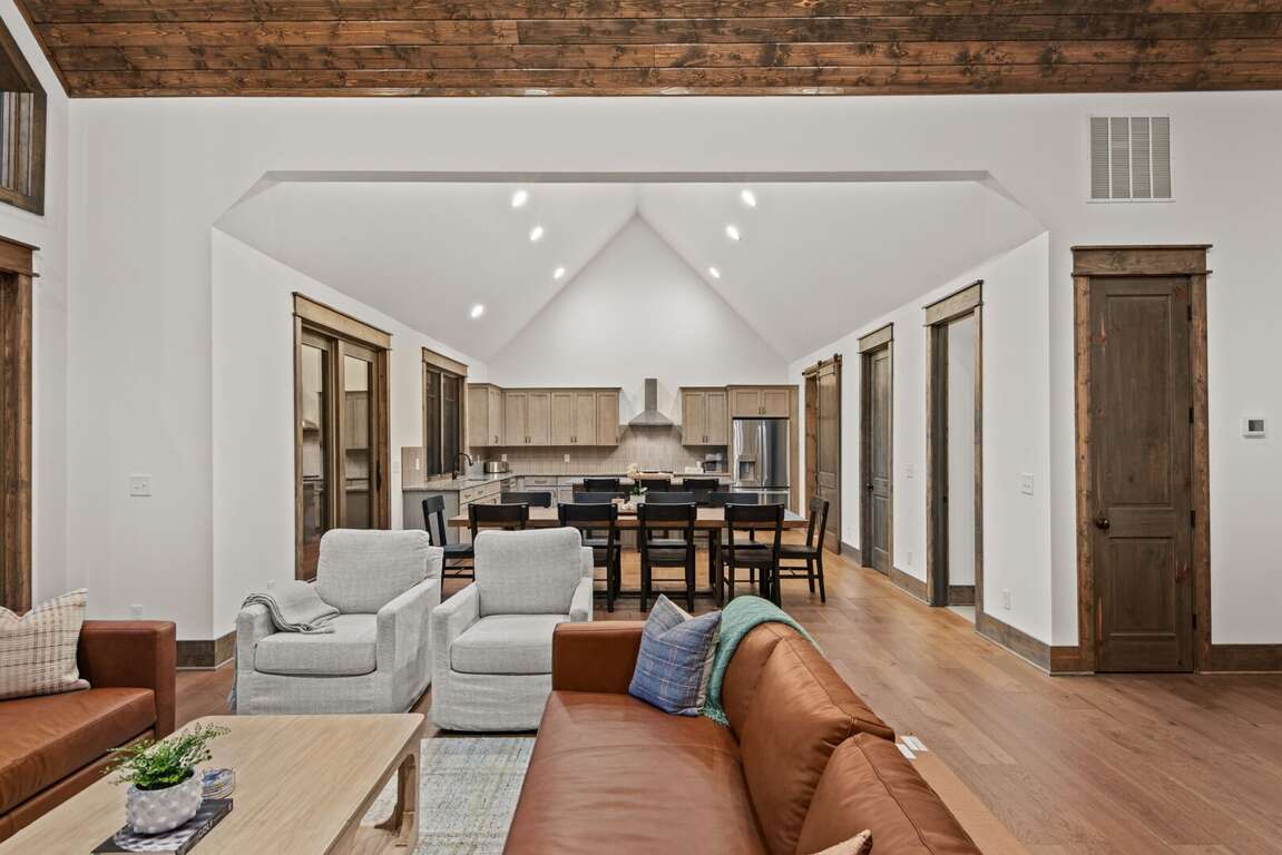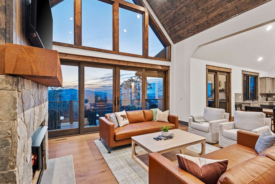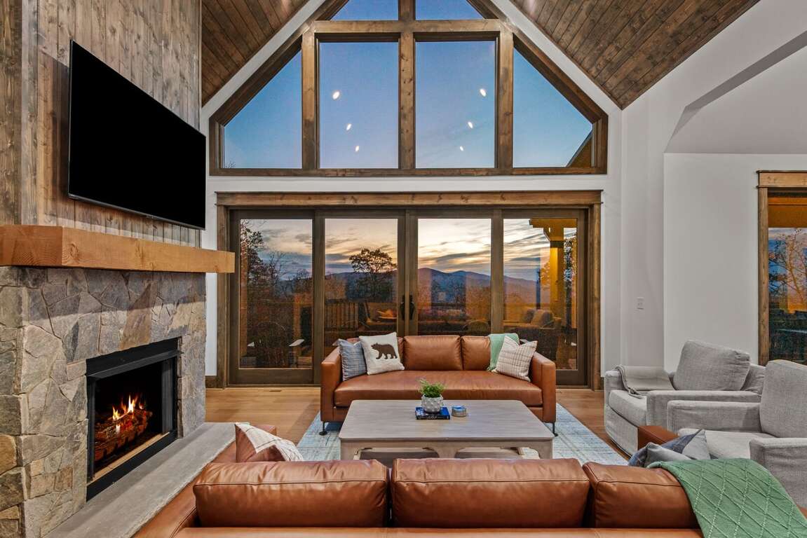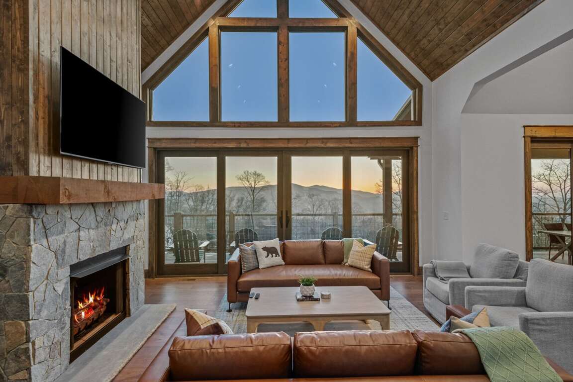 As you step inside, you're welcomed into an expansive great room where vaulted tongue-and-groove ceilings soar overhead, and large windows frame the majestic mountain landscape. Natural light fills the space, drawing you toward the heart of the room — a striking gas log fireplace with a large Smart TV mounted above, surrounded by plush seating perfect for relaxing after a day of exploration. The open floor plan flows seamlessly into the gourmet kitchen and dining area, making entertaining both easy and enjoyable.<br />