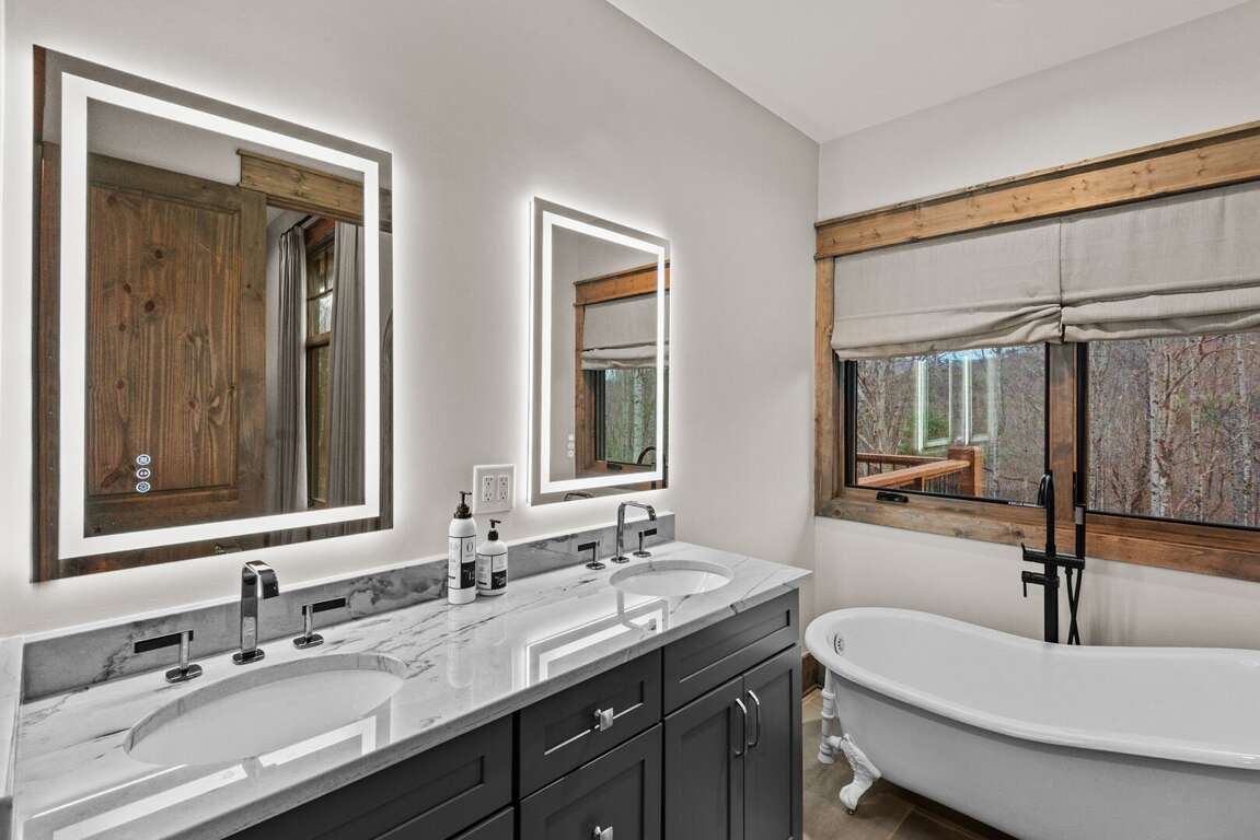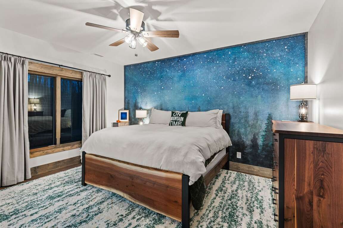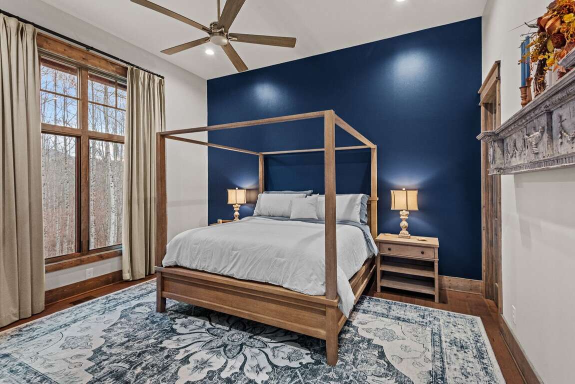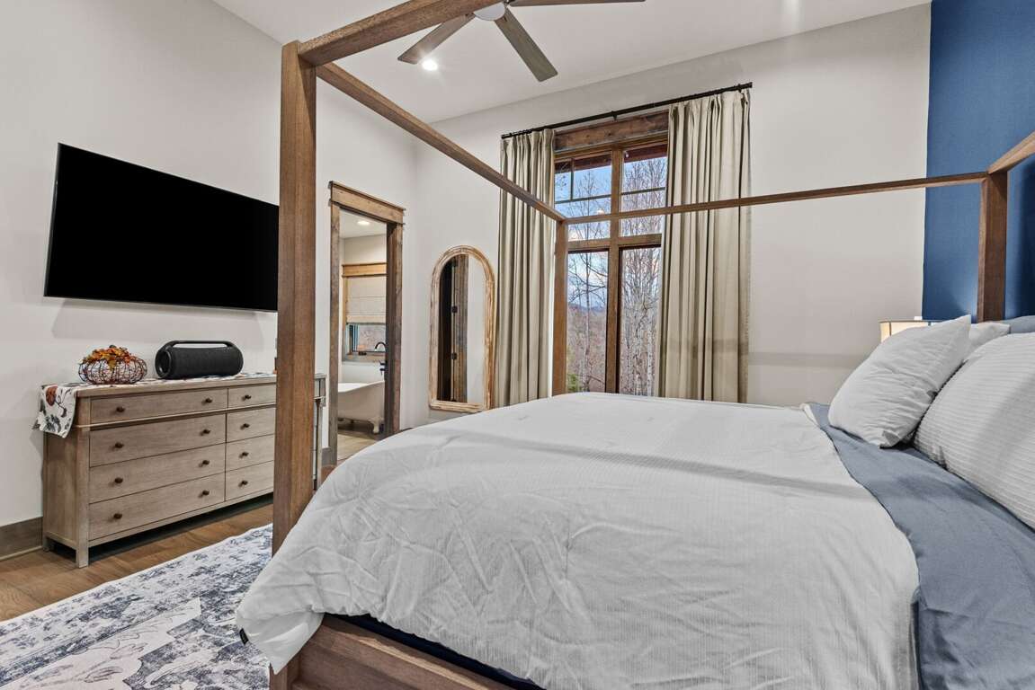 Also on the main level is a luxurious king ensuite that serves as a private retreat. This serene space features an upgraded plush mattress, a private TV, and a spa-like ensuite bathroom with a tiled shower, deep soaking tub, and double marble vanity. A picture window frames the surrounding views, adding a peaceful finishing touch.<br />