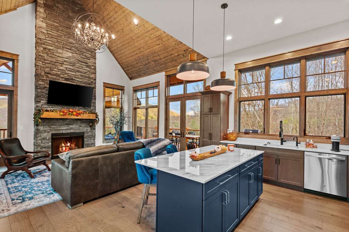 The living room is warm and inviting, anchored by a gas fireplace and filled with natural light. A leather sofa, two comfortable chairs, and a large flatscreen TV create the perfect spot to unwind after a day on the lake. Whether you are cooking, dining, or relaxing by the fire, the main living area offers an ideal balance of comfort and style. A half bath is located near the mudroom entrance.<br />