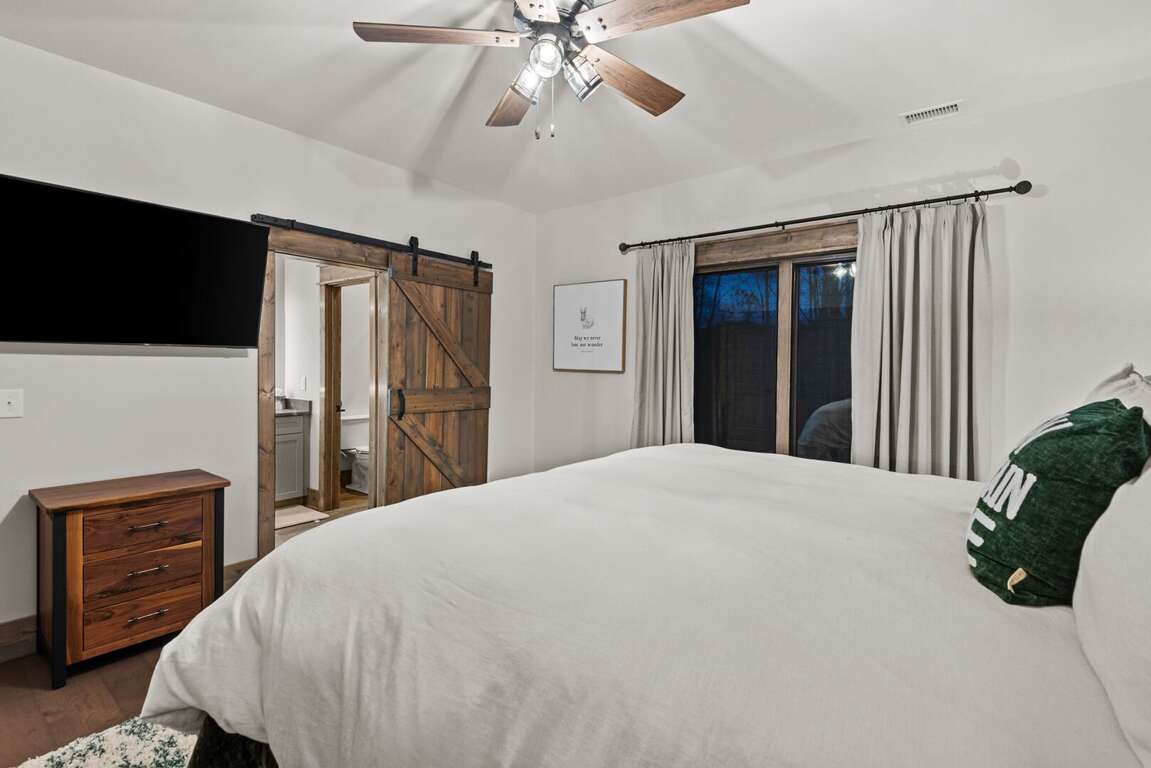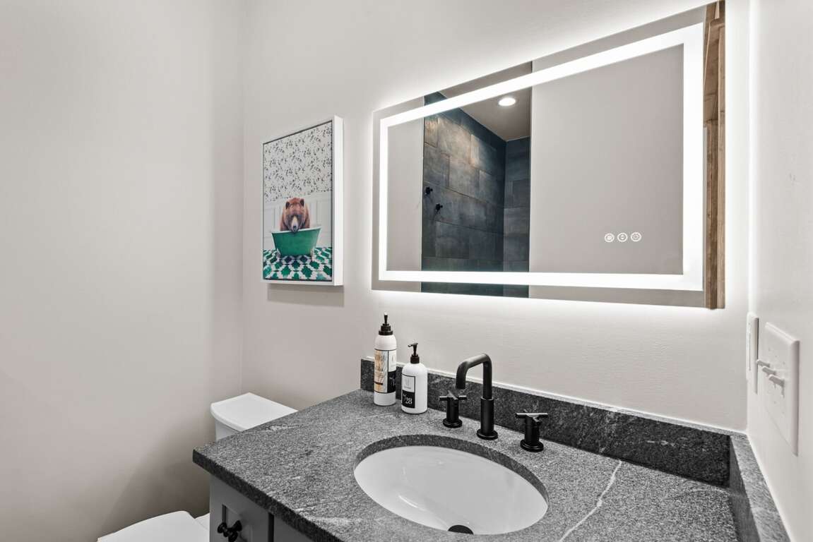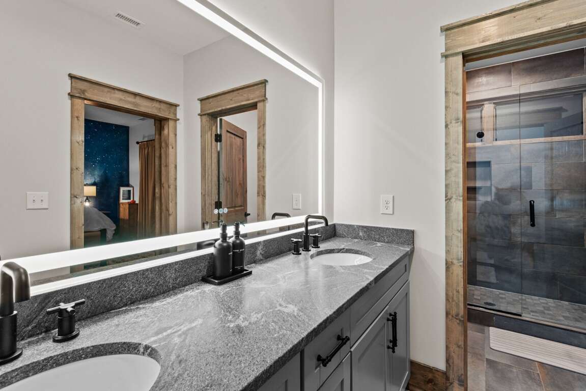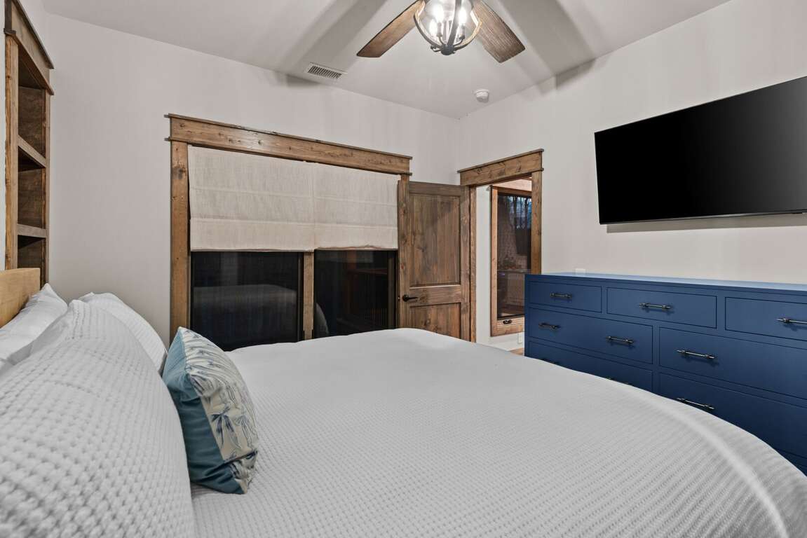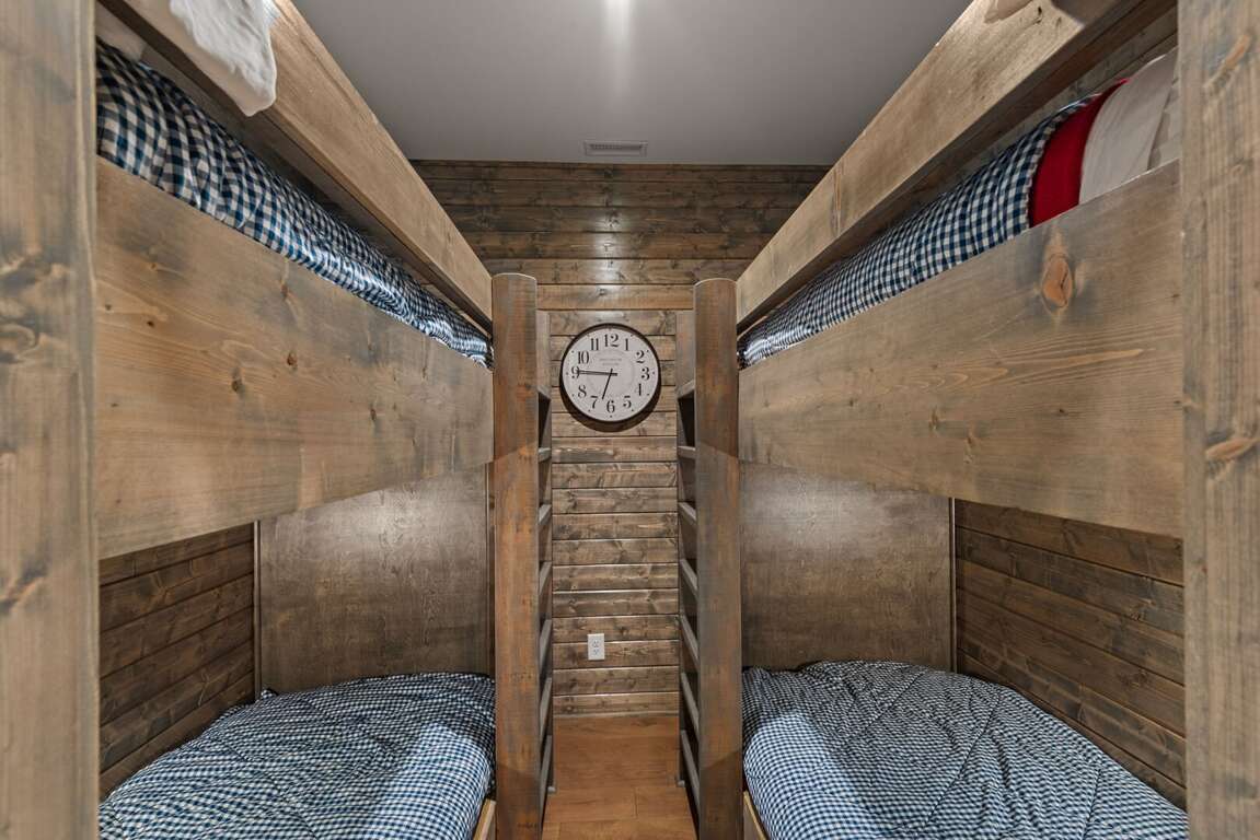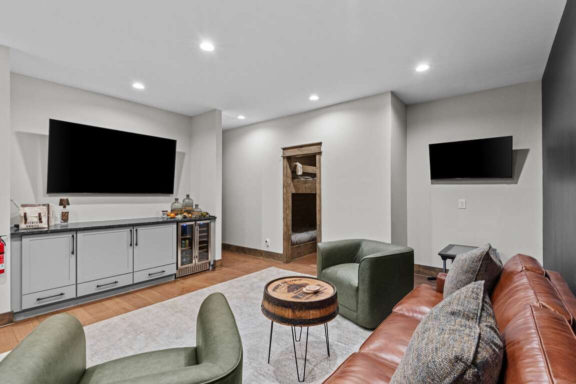 The lower level offers three additional bedrooms along with a cozy den and media space. The first king suite includes a TV and a private bathroom with a tiled shower. The second king ensuite features a beautifully designed bathroom with double vanities, tiled shower, and a private window that fills the space with natural light, and it also opens to the hallway for convenient access from the den and bunk room. The bunk room is perfect for younger guests, offering two sets of twin-over-twin beds and a Smart TV, located just steps from the wet bar and den area with a sofa and TV. A second half bath is on the lower level for guest use.<br />