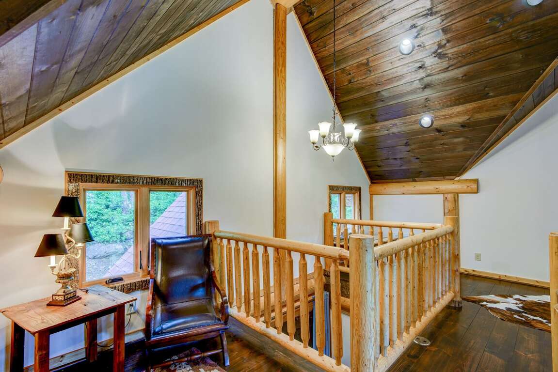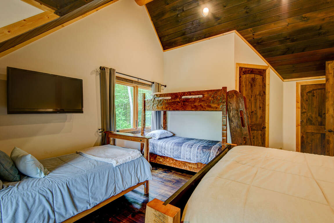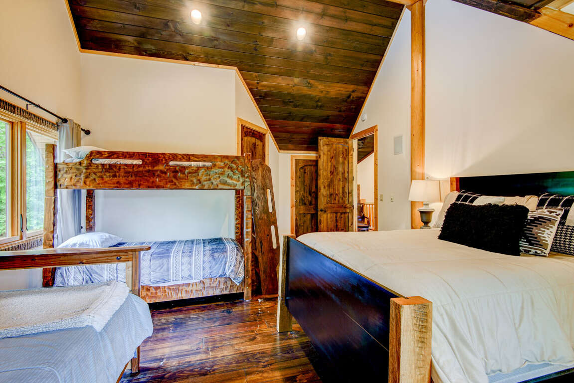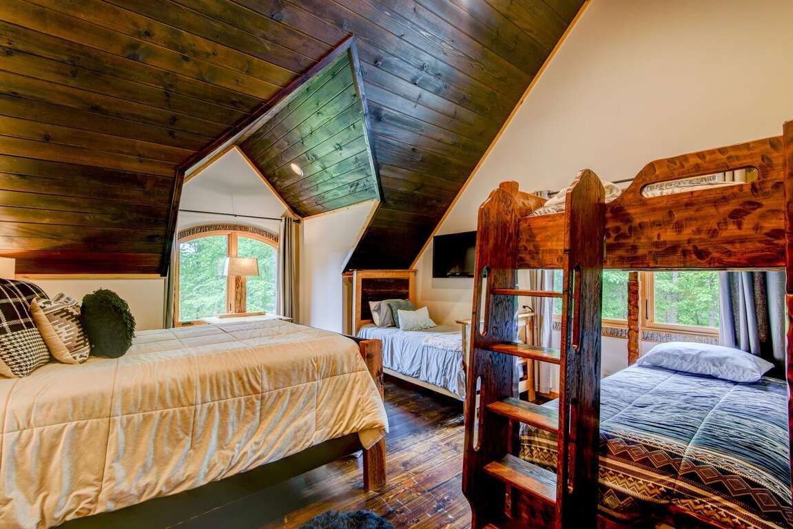 Upstairs is a loft with two suites. To the right is a suite with a queen bed, twin bed, and a twin trundle. To the left is a suite with a queen, a set of twin over twin bunk beds, and a single twin. Each suite has a private bath with a walk in shower and granite counters. On the deck you may enjoy the views of Great Camp and the mountains, or grill up dinner on the gas grill. Off the deck to the left is a beautiful firepit. You may add firewood to be delivered (with a week's notice) or bring in your own.<br />