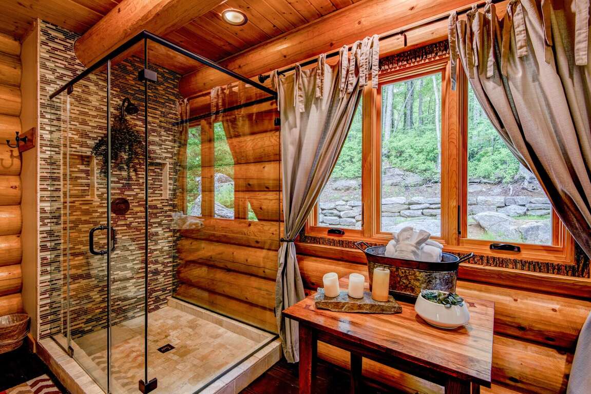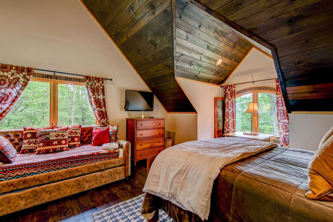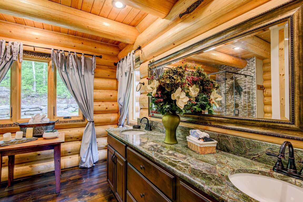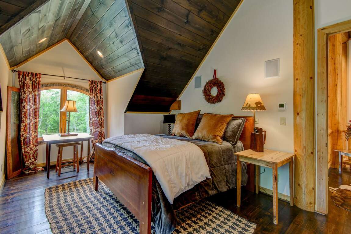 Upstairs is a loft with two suites. To the right is a suite with a queen bed, twin bed, and a twin trundle. To the left is a suite with a queen, a set of twin over twin bunk beds, and a single twin. Each suite has a private bath with a walk in shower and granite counters. On the deck you may enjoy the views of Great Camp and the mountains, or grill up dinner on the gas grill. Off the deck to the left is a beautiful firepit. You may add firewood to be delivered (with a week's notice) or bring in your own.<br />