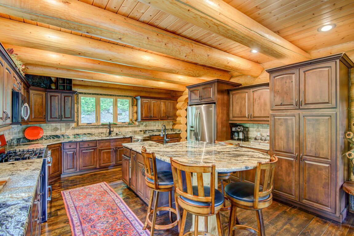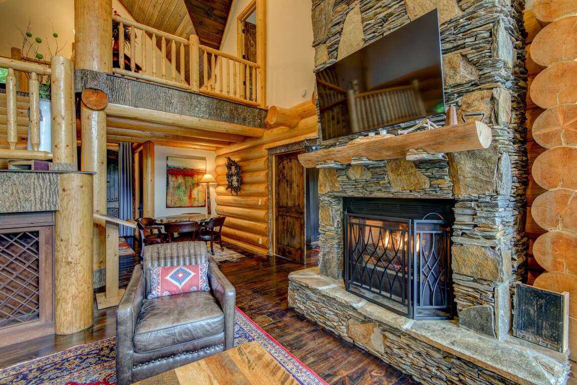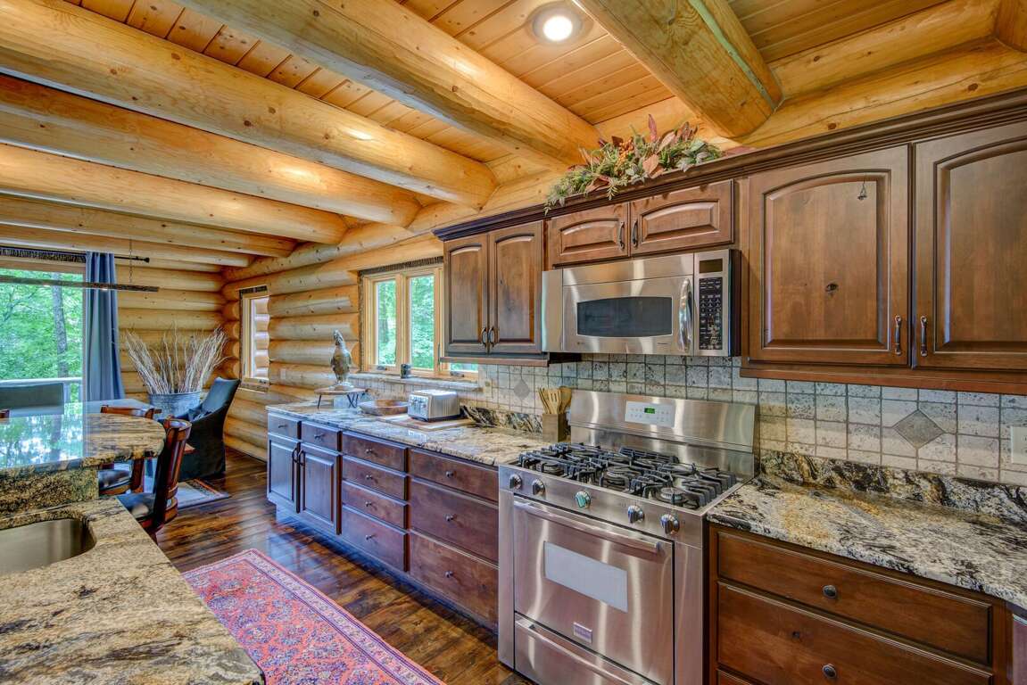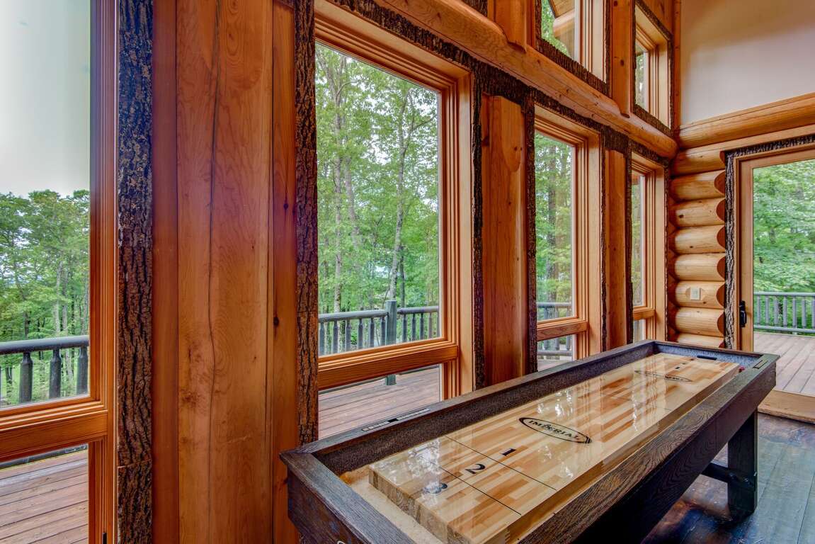 Enter the main level to the great room. The stacked stone, gas log fireplace with leather seating offers the perfect place to relax with family. Play a game of shuffleboard while looking out at the Blue Ridge Mountains, or a round of poker at the custom made table near the entrance. The kitchen is fit for a chef with granite counters, a prep sink, and island. The Flexbrew coffee pot will take k-cups or grounds for your cup of coffee. The dining table seats eight, with bar seating for another four guests. A laundry center is conveniently located just off of the kitchen. The king suite is on the main level. It has private deck access, a TV, and a bathroom with tiled walk-in shower and a double granite vanity.<br />