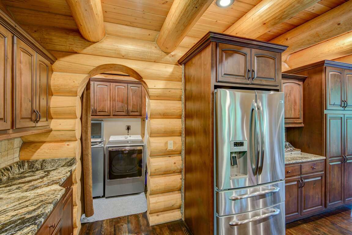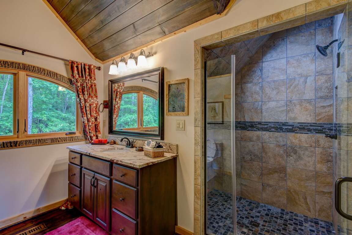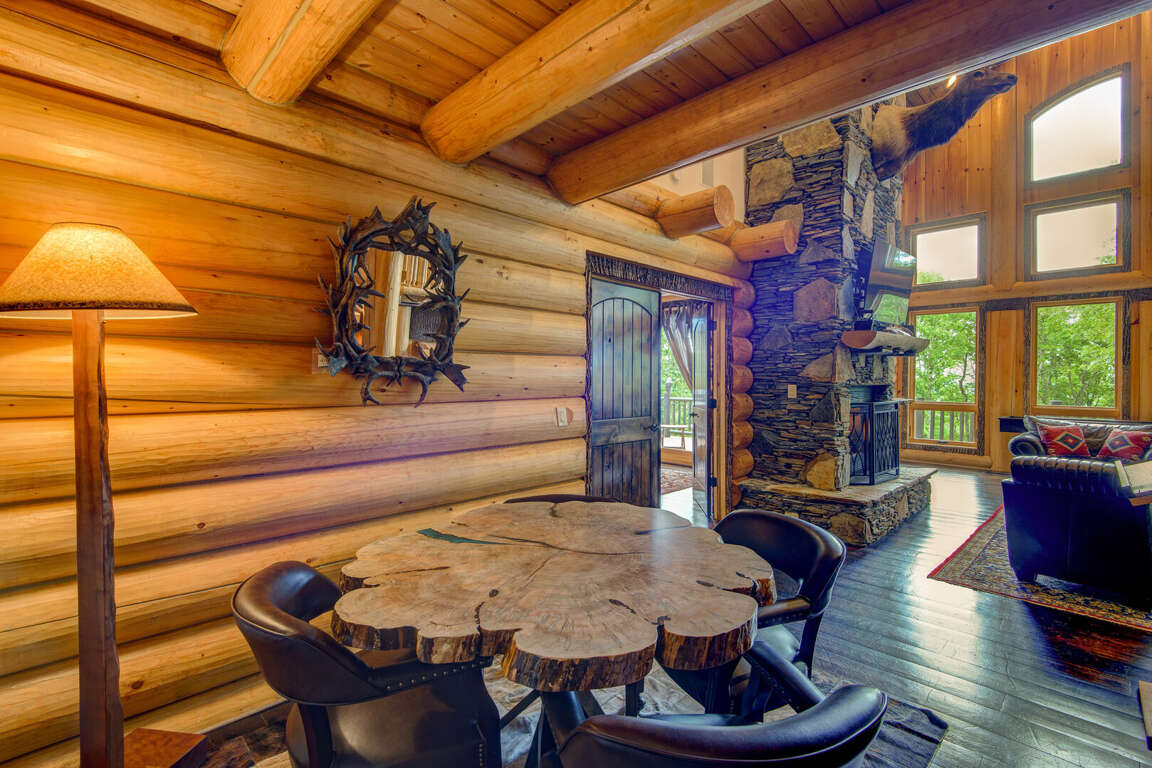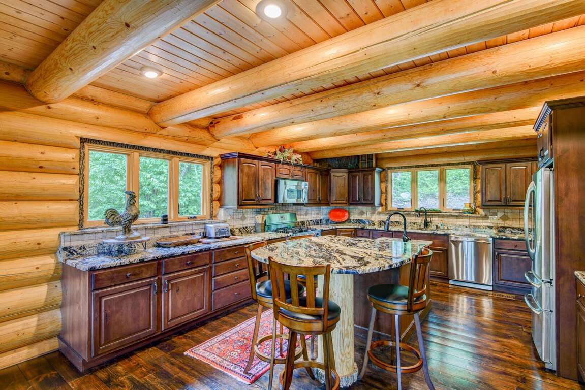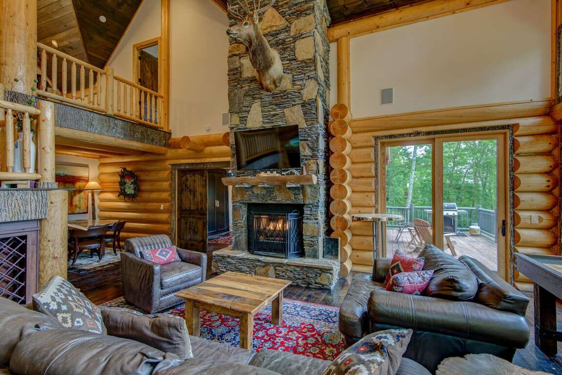 Enter the main level to the great room. The stacked stone, gas log fireplace with leather seating offers the perfect place to relax with family. Play a game of shuffleboard while looking out at the Blue Ridge Mountains, or a round of poker at the custom made table near the entrance. The kitchen is fit for a chef with granite counters, a prep sink, and island. The Flexbrew coffee pot will take k-cups or grounds for your cup of coffee. The dining table seats eight, with bar seating for another four guests. A laundry center is conveniently located just off of the kitchen. The king suite is on the main level. It has private deck access, a TV, and a bathroom with tiled walk-in shower and a double granite vanity.<br />