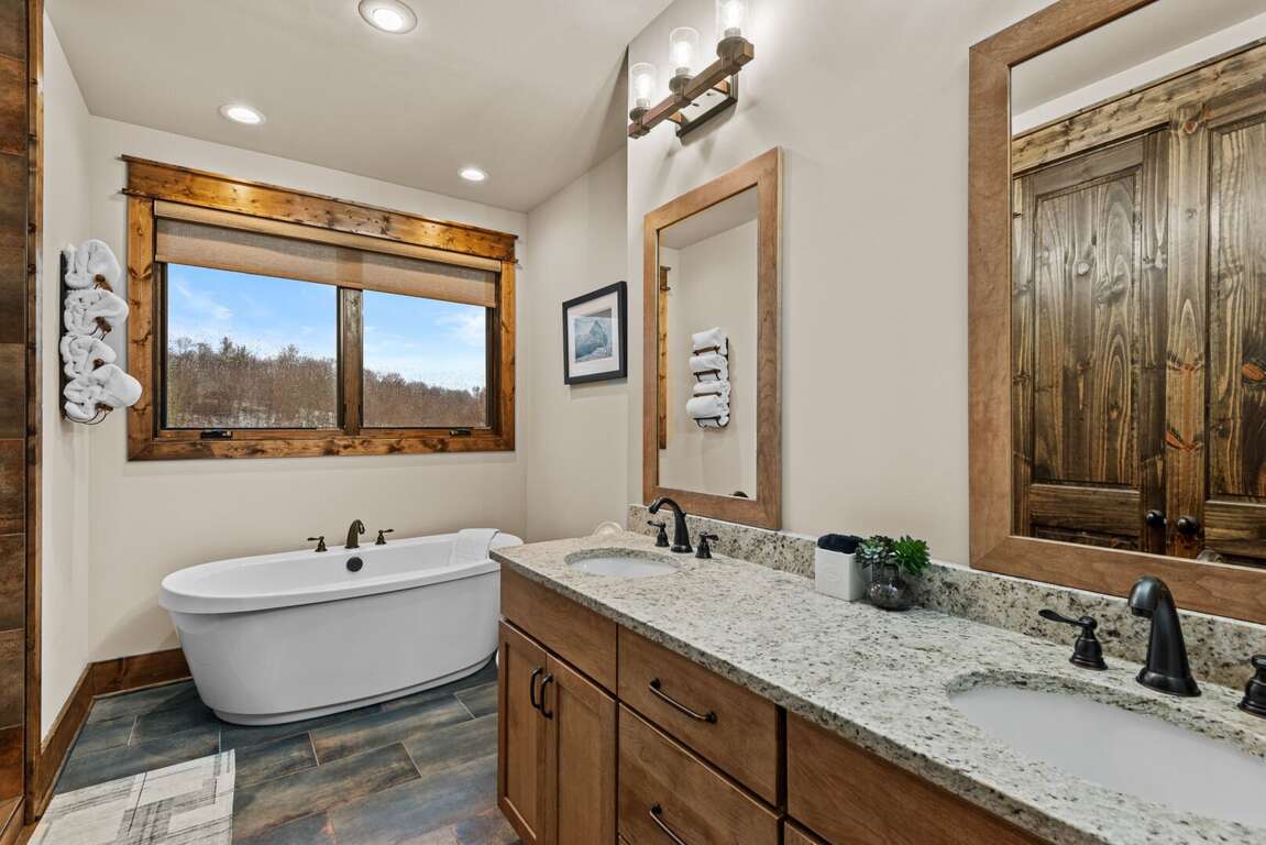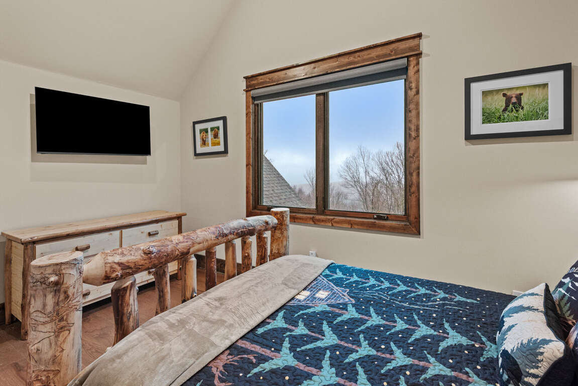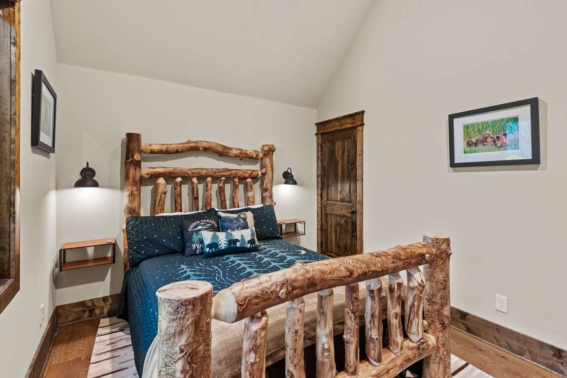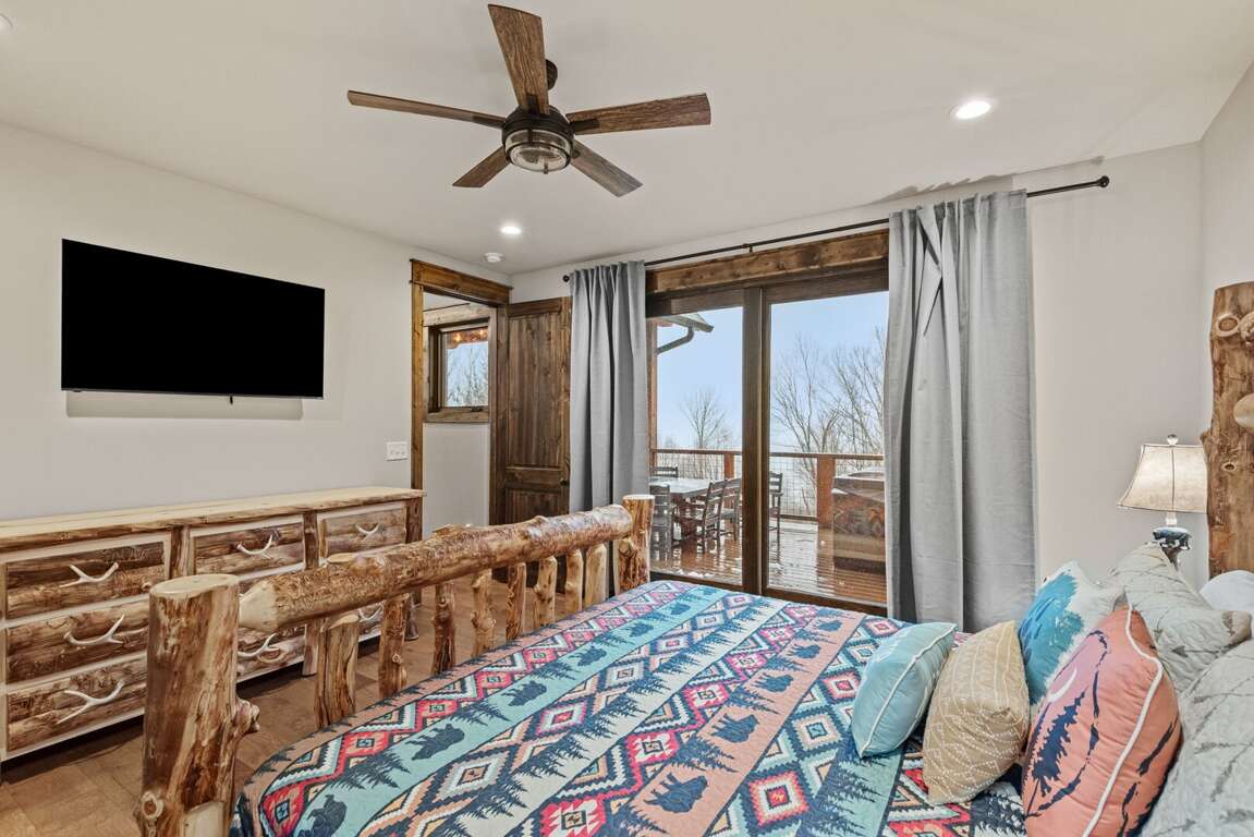 The main-level king ensuite provides a private retreat, complete with a log bed, TV, and ceiling fan. The bathroom offers a touch of luxury with a soaking tub, tiled shower, and double granite vanities.<br />