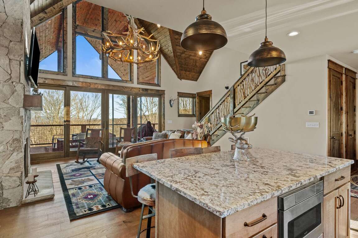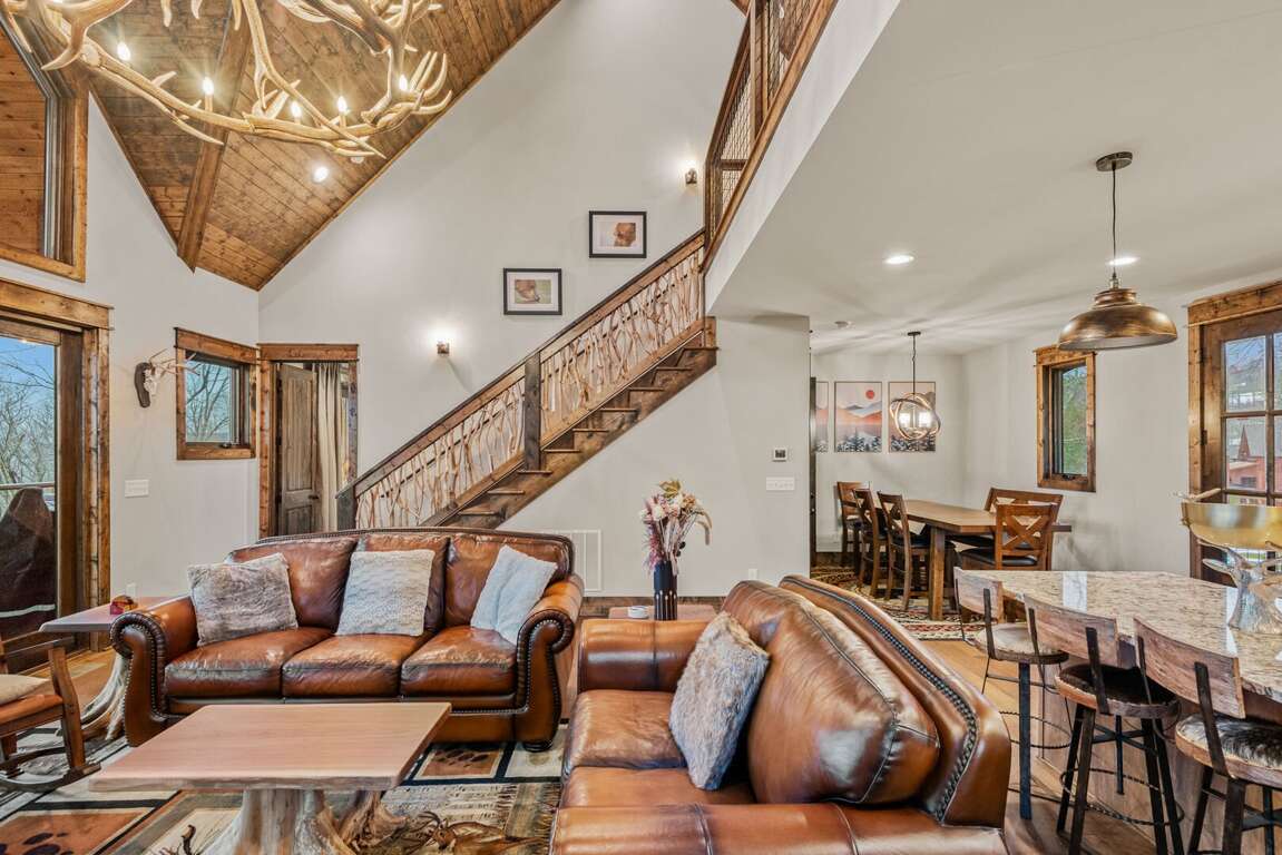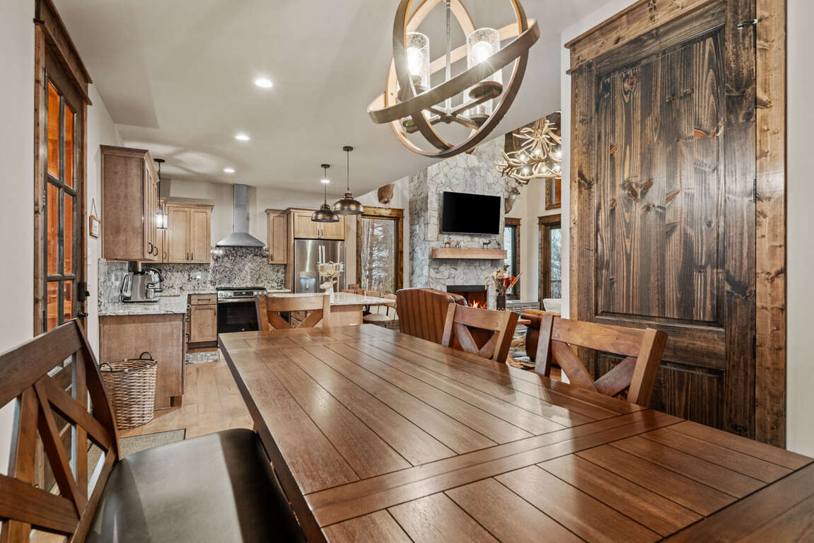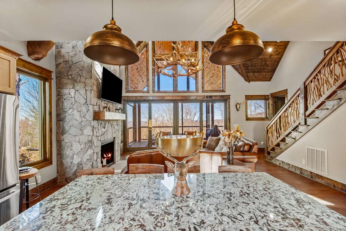 The open-concept main level features a bright and welcoming living area with a leather sofa, gas fireplace, and a large flatscreen TV (bring your own logins). The fully stocked kitchen boasts granite counters, a center island with seating for three, and a dining table for six, ideal for family meals after a day of adventure. From the living room, step out onto the spacious deck to enjoy fresh mountain air and peaceful wooded surroundings.<br />