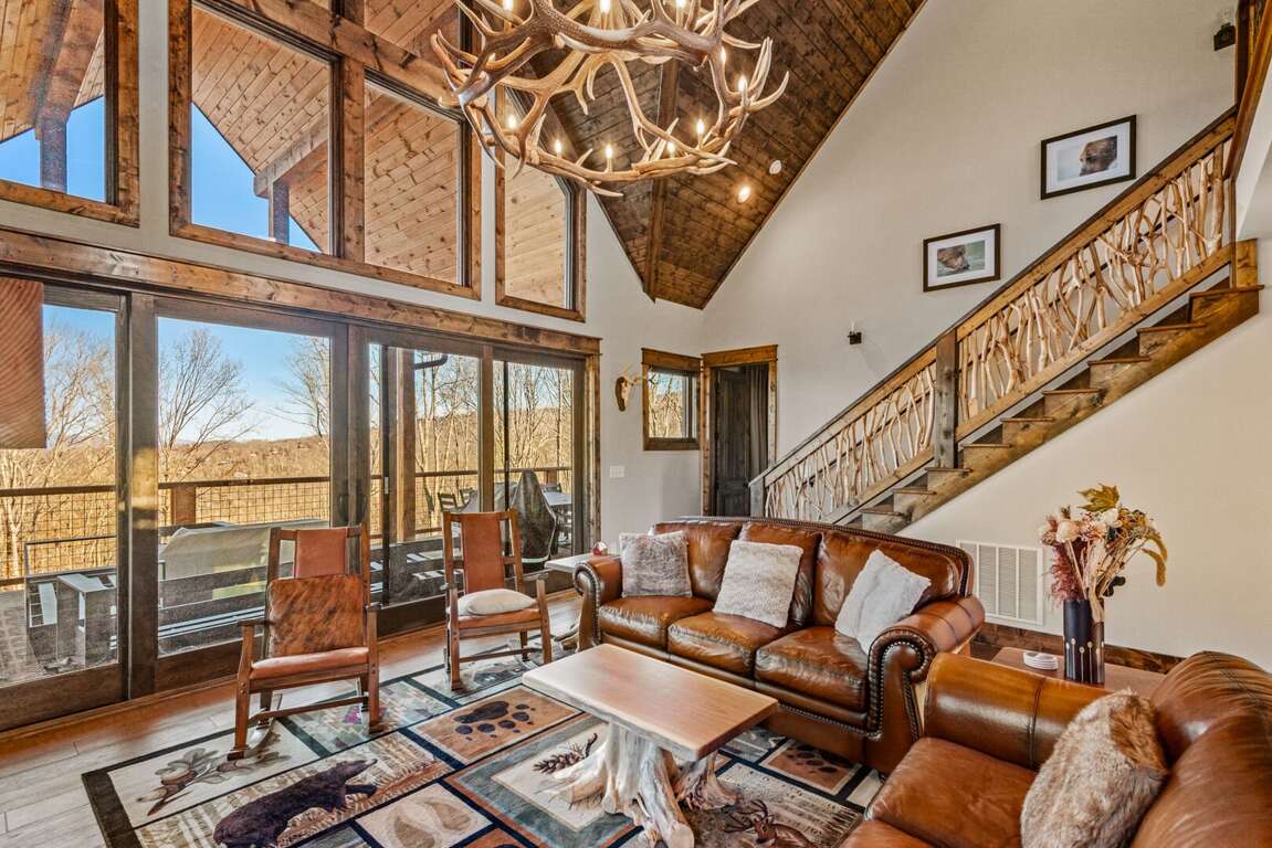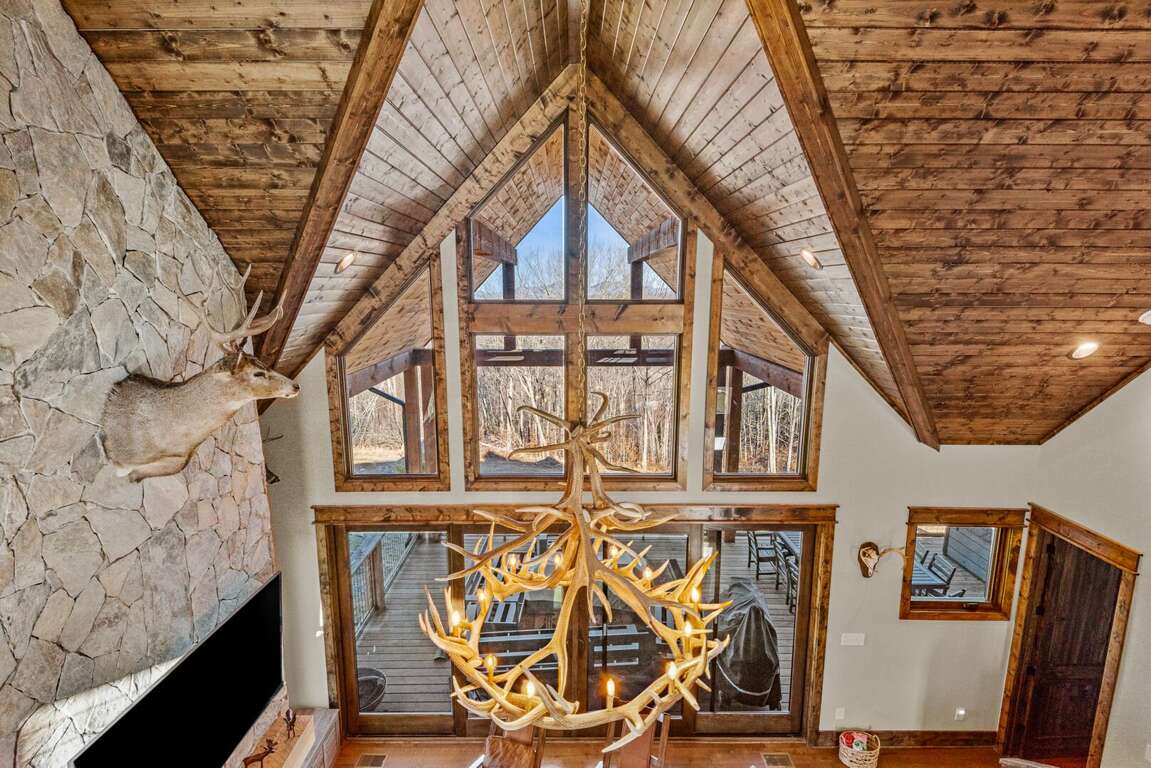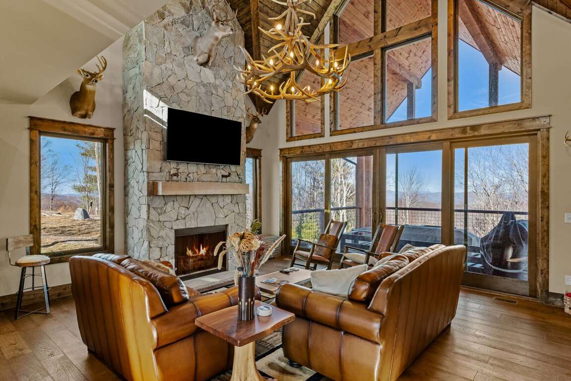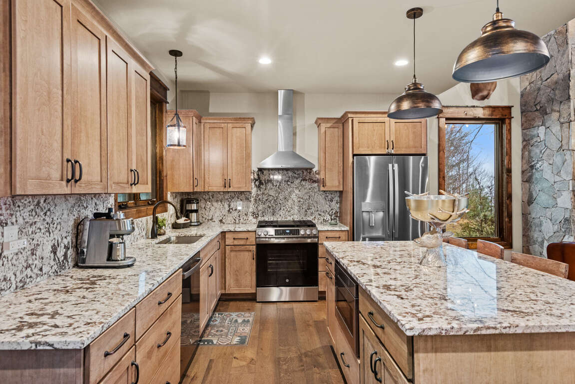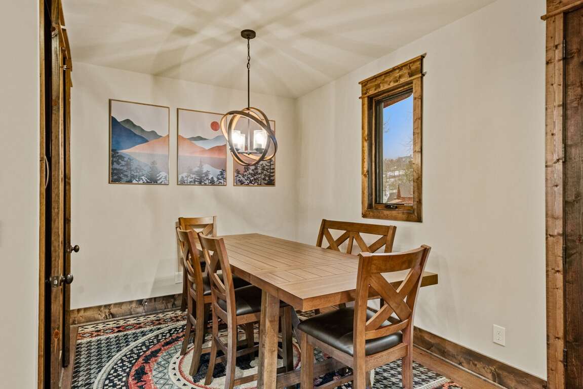 The open-concept main level features a bright and welcoming living area with a leather sofa, gas fireplace, and a large flatscreen TV (bring your own logins). The fully stocked kitchen boasts granite counters, a center island with seating for three, and a dining table for six, ideal for family meals after a day of adventure. From the living room, step out onto the spacious deck to enjoy fresh mountain air and peaceful wooded surroundings.<br />