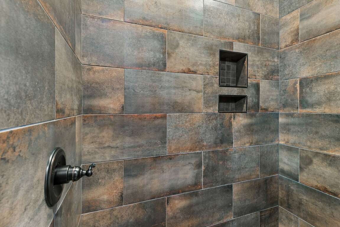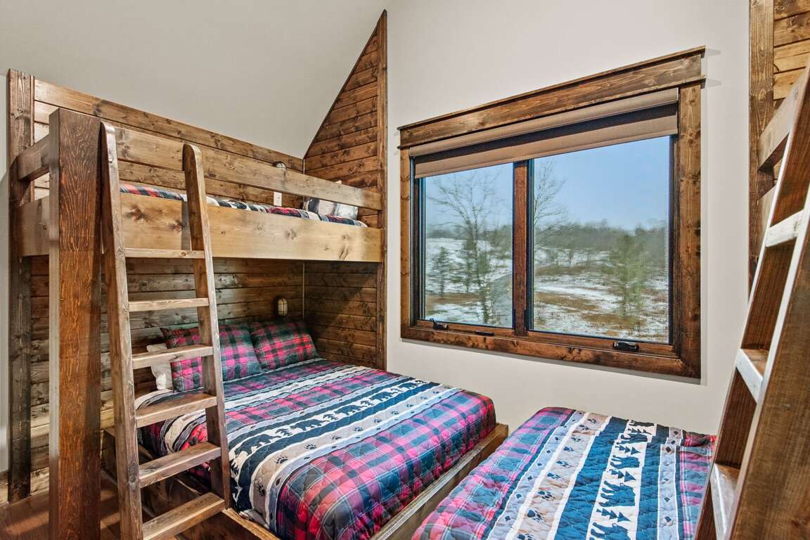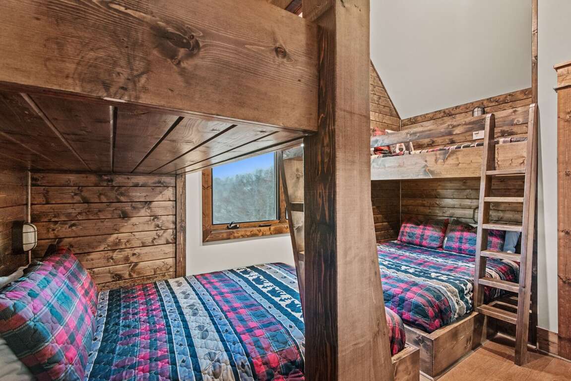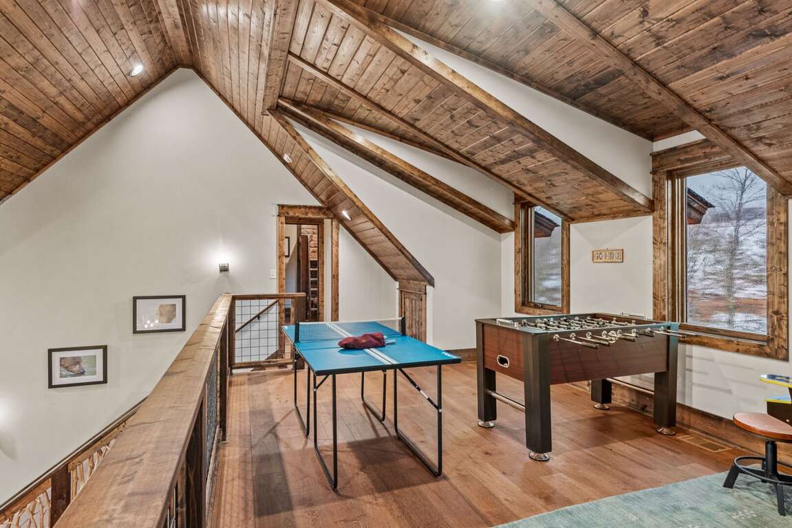 Upstairs, the loft brings fun for all ages with ping pong, foosball, a Pac-Man arcade, and a comfortable sofa for lounging. This level also features two beautifully furnished bedrooms — one with a queen log bed and TV, and the other a custom bunk room featuring two twin-over-queen bunks and a TV. A shared hallway bath with a tiled tub/shower combination and granite counter serves both rooms.<br />