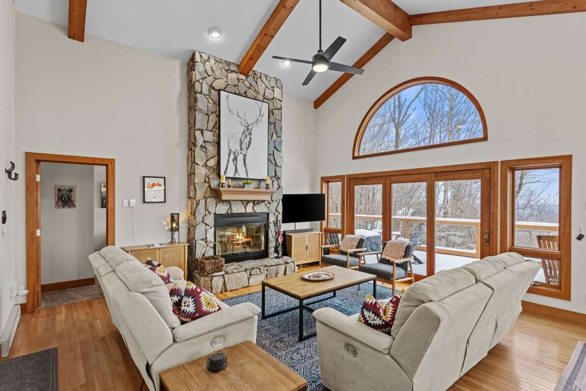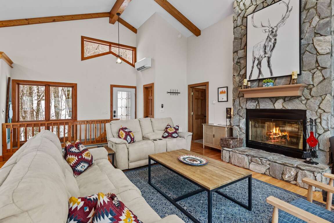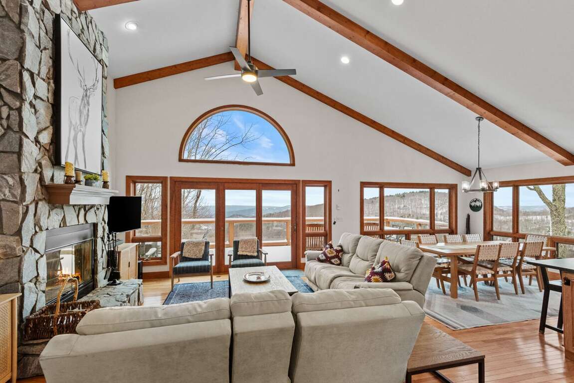 Inside, vaulted ceilings and expansive windows fill the home with natural light while framing breathtaking Blue Ridge Mountain vistas. The spacious great room features a dramatic double-sided fireplace, perfect for cozy evenings in any season, and connects seamlessly with the main-level king ensuite.<br />