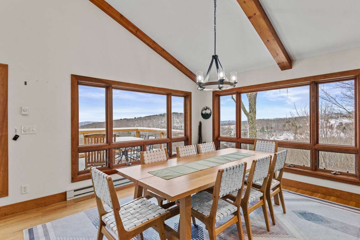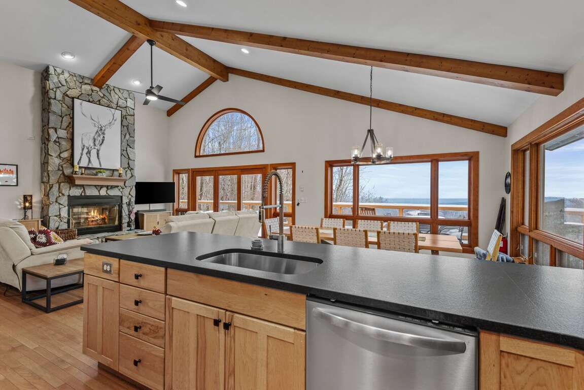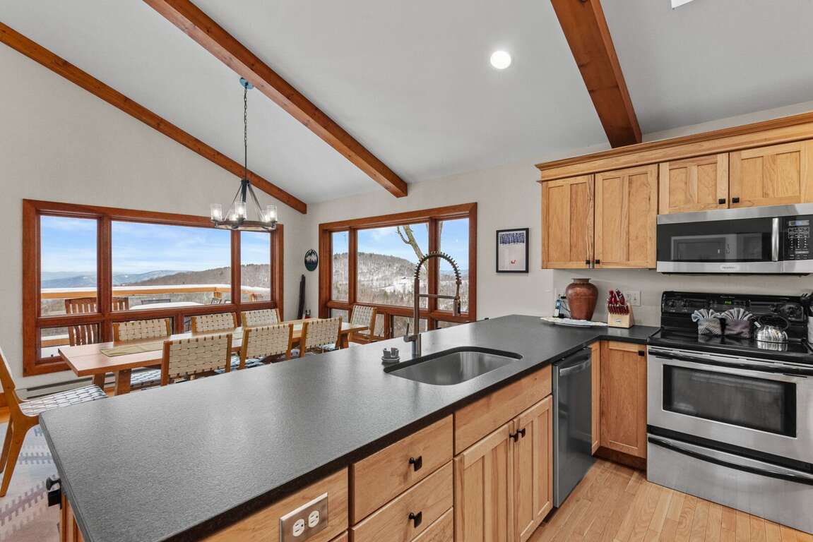 The recently renovated kitchen combines style and functionality with stainless steel appliances, leathered granite countertops, ample cabinetry, a pantry, and a dining area designed for large gatherings. Sliding doors open to an oversized rear deck, offering an ideal space for outdoor dining, morning coffee, or quiet reflection while soaking in the mountain panorama.<br />
