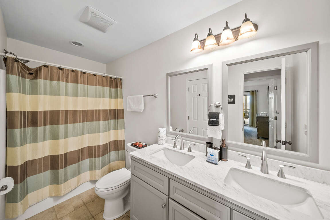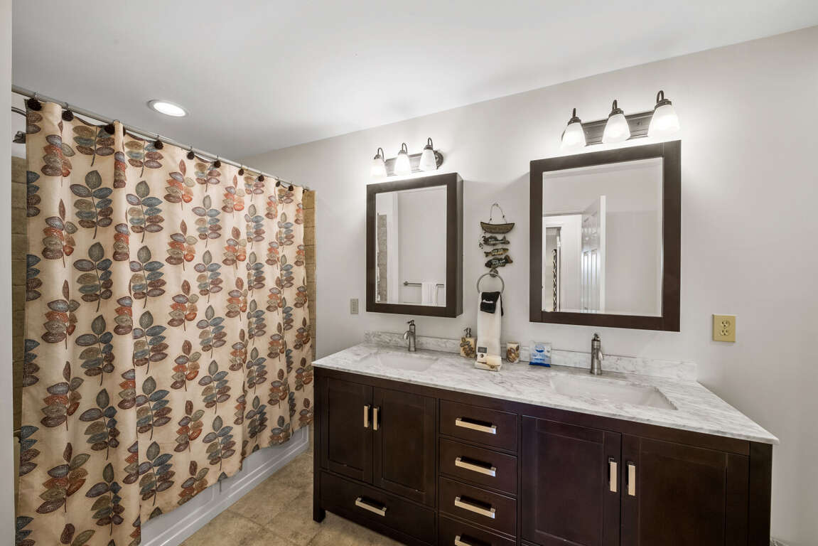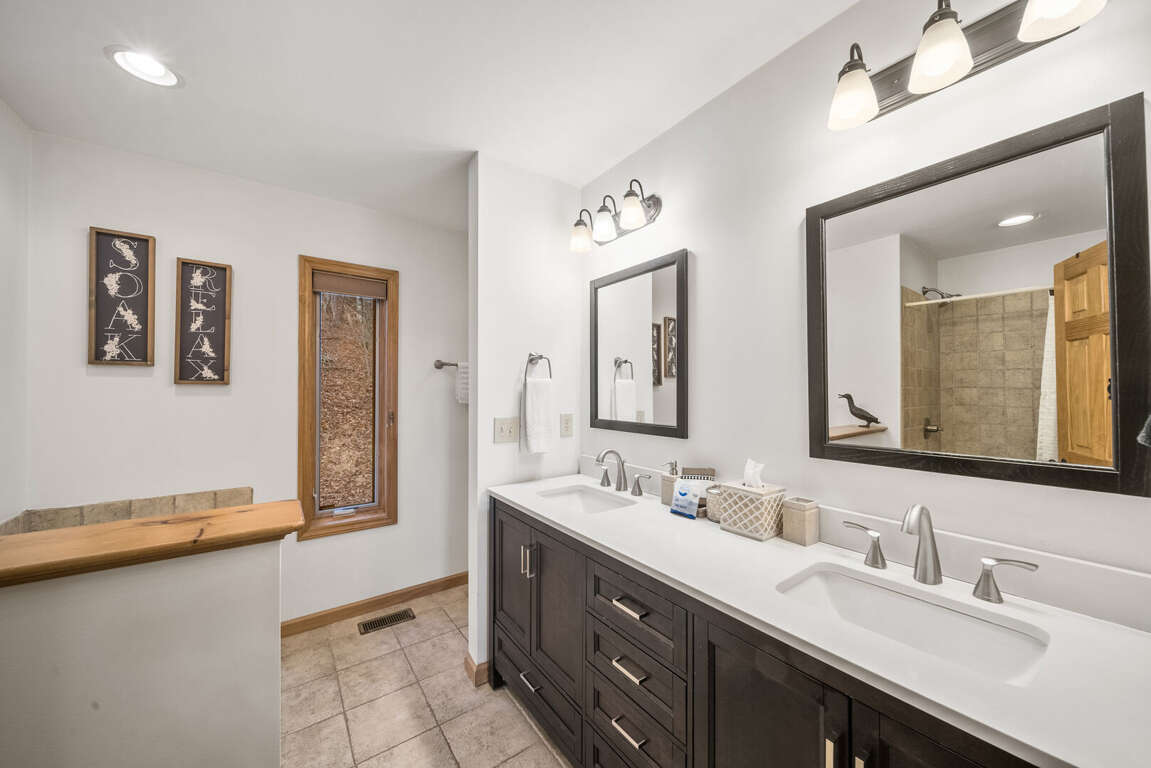 Downstairs, a second living area offers a massive sectional facing another large mounted TV, along with a nearby card table for games or puzzles. This level includes a second king suite with deck access, a private TV, and an ensuite bathroom featuring double quartz vanities and a shower/tub combo. A welcoming queen bedroom and a full-over-full bunk room are also located on this level, along with a shared hall bathroom offering double quartz vanities and another shower/tub combo. All bedrooms are thoughtfully furnished with tasteful décor and ample storage.