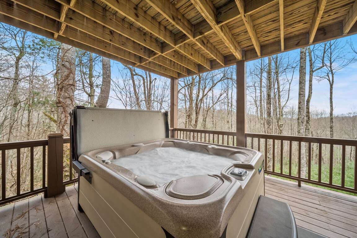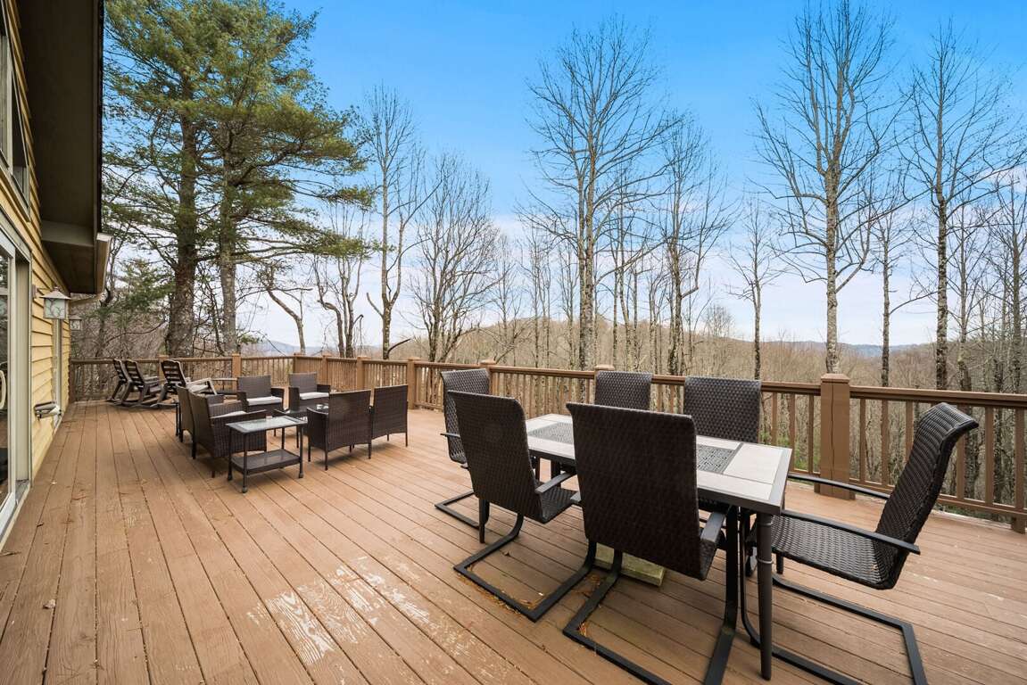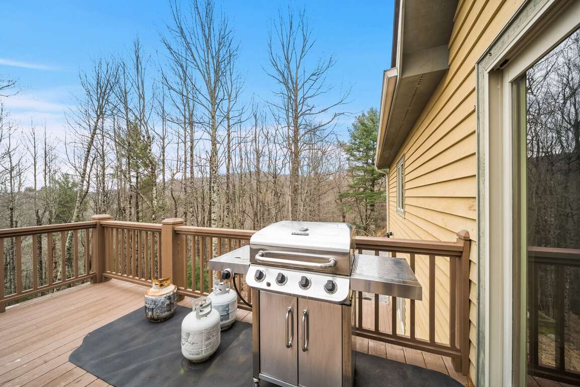 Step outside and enjoy two spacious decks designed for relaxation and mountain living. The upper deck features a dining table, plenty of comfortable seating, and a propane grill—the perfect place to enjoy meals while taking in peaceful mountain views through the woods. Down below, the lower deck invites you to slow down with rocking chairs and a private hot tub. Sink into the warm bubbles, breathe in the cool mountain air, and let the stress melt away as you relax here, day or night.