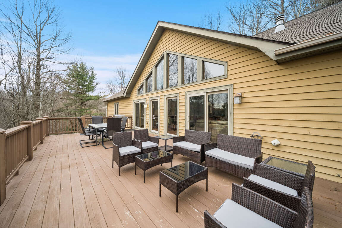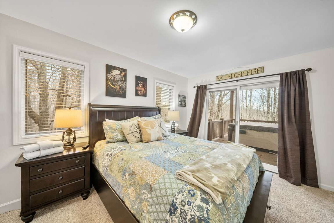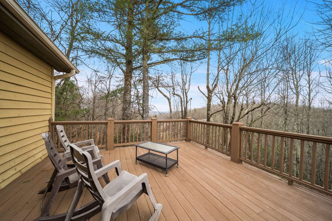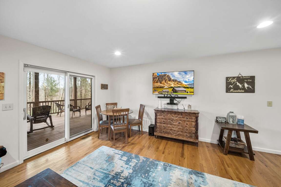 Step outside and enjoy two spacious decks designed for relaxation and mountain living. The upper deck features a dining table, plenty of comfortable seating, and a propane grill—the perfect place to enjoy meals while taking in peaceful mountain views through the woods. Down below, the lower deck invites you to slow down with rocking chairs and a private hot tub. Sink into the warm bubbles, breathe in the cool mountain air, and let the stress melt away as you relax here, day or night.