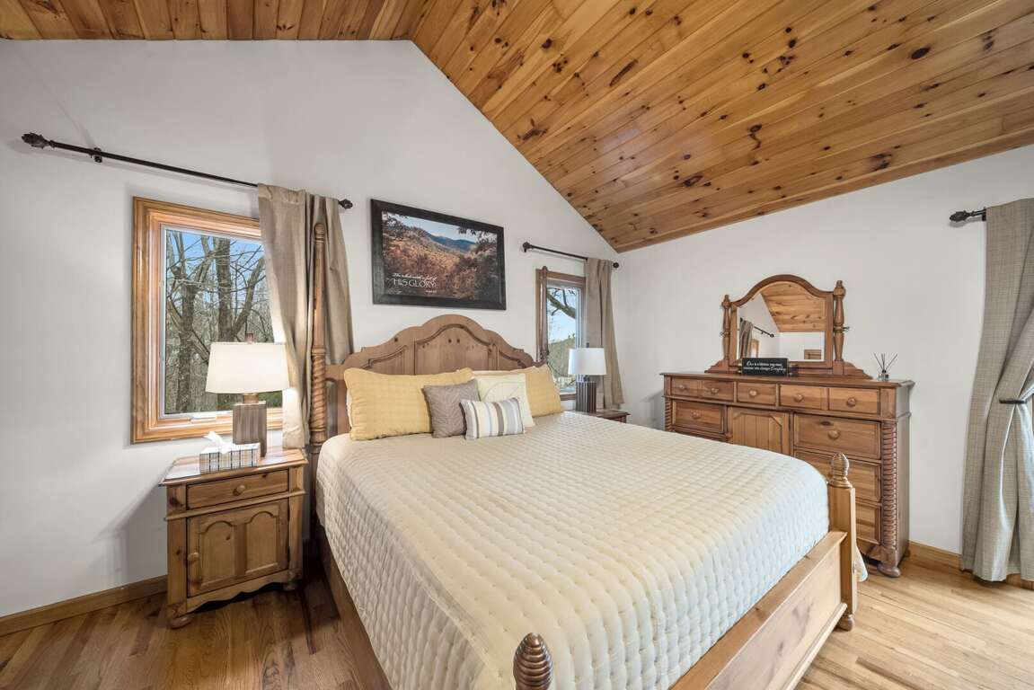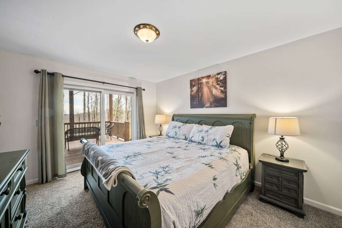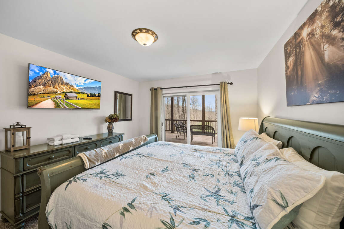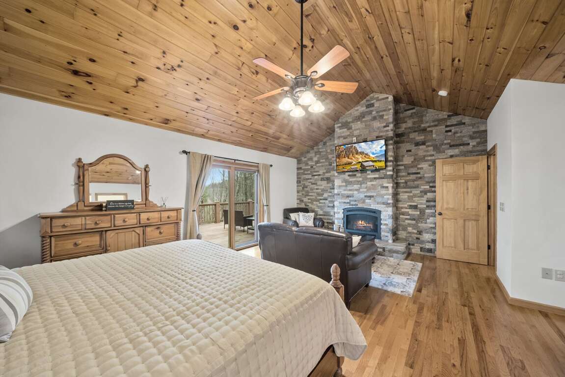 Just off the great room, the primary suite is a true retreat. It features a king bed, private deck access, and a spacious sitting area with leather seating, a private gas log fireplace, and its own mounted TV. The luxurious ensuite bath includes double quartz vanities, a jetted soaking tub, and a custom tiled shower.