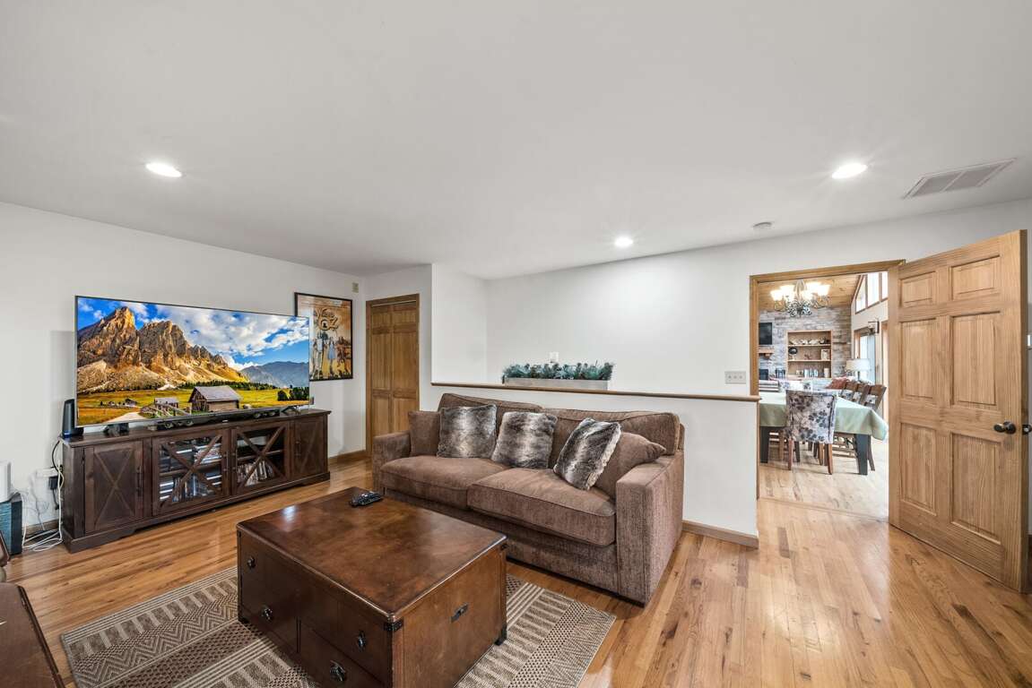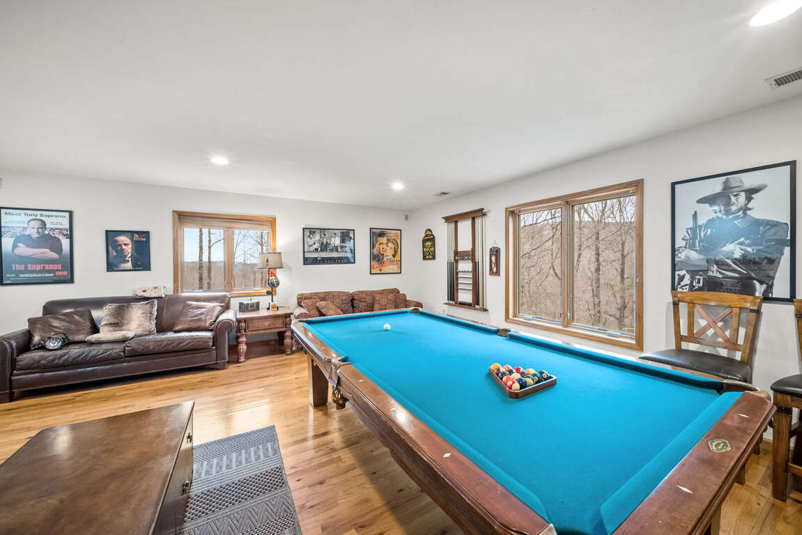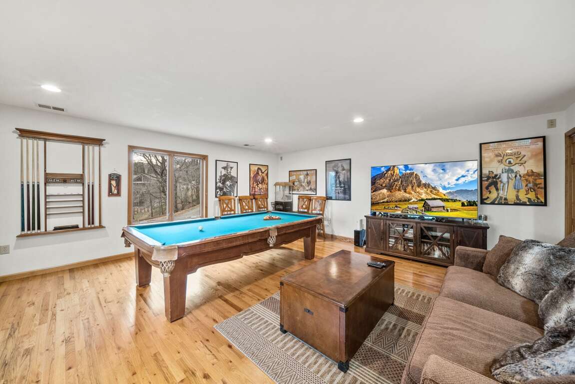 On the opposite side of the great room, you’ll find a dedicated game room complete with a full-size pool table, a large flat-screen TV, and multiple comfortable couches—perfect for game nights, movie marathons, or rainy-day fun.