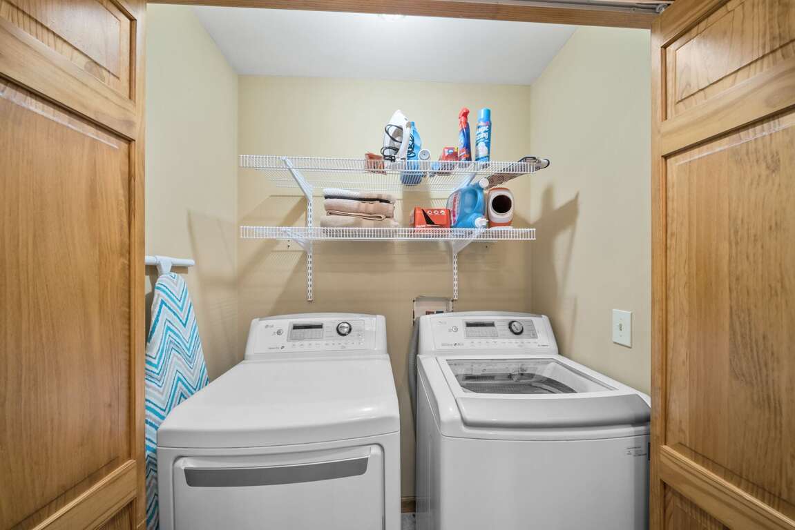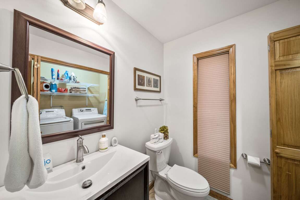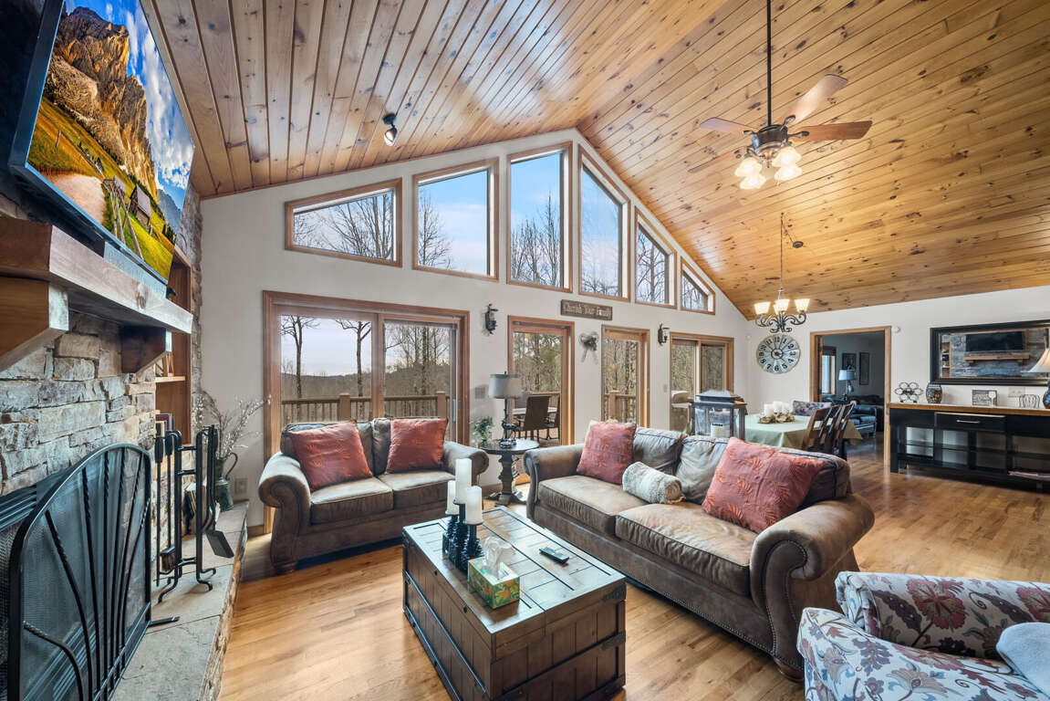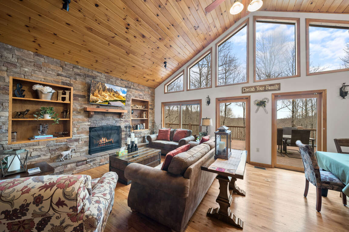 The connected living area offers plenty of comfortable seating centered around a cozy gas log fireplace with a TV mounted above on a beautiful stone accent wall—an inviting spot to unwind after a day in the mountains. A convenient half bath is located near by.