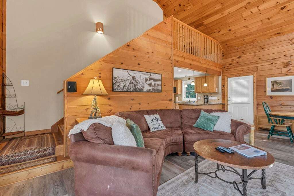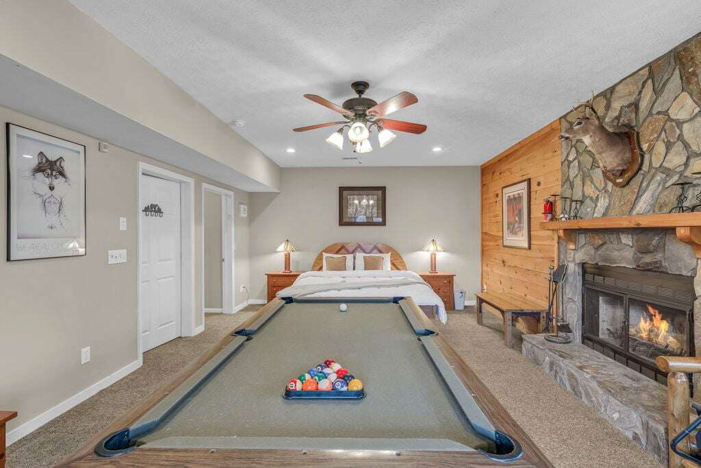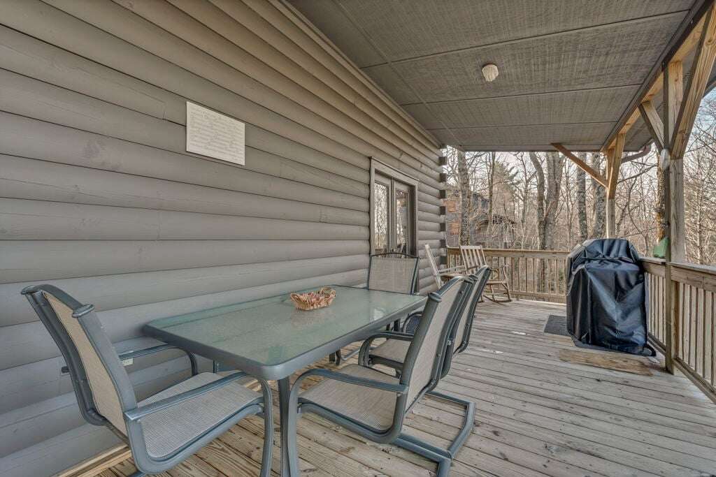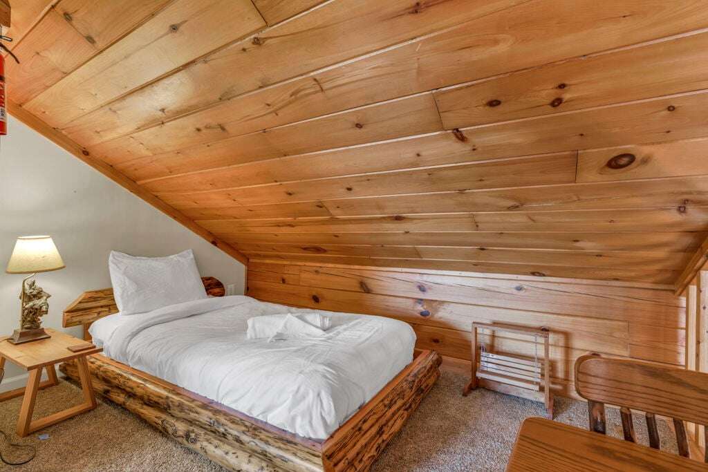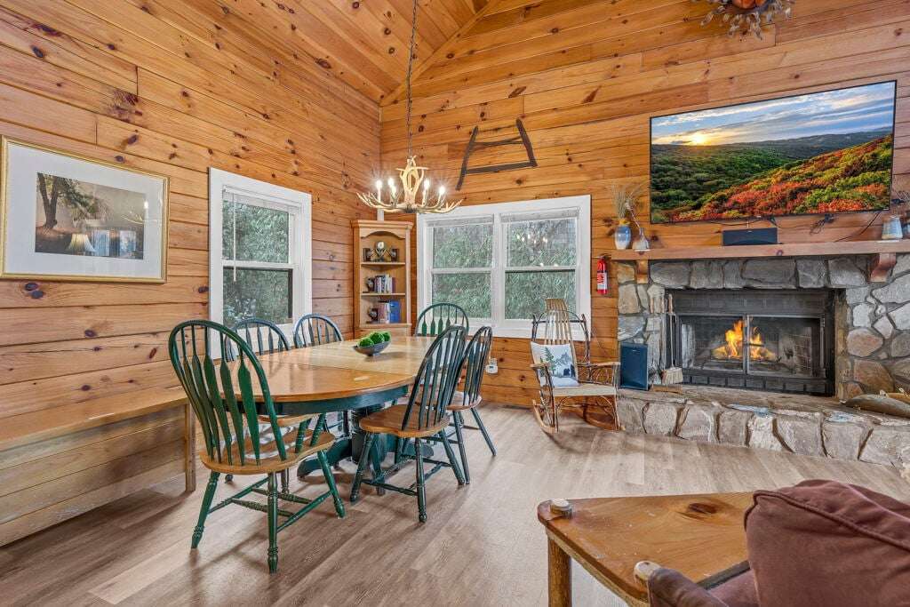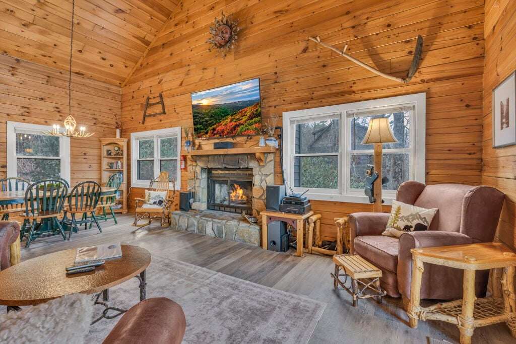 The Mountain Hideaway Getaway boasts a range of cabin features designed to provide a comfortable and memorable retreat for guests seeking a rustic mountain experience. The cozy living room is equipped with a 70 LCD Smart HDTV with Roku and surround sound, perfect for unwinding after a day of outdoor adventures. The stone wood-burning fireplace adds to the ambiance, creating a warm and inviting atmosphere. The fully equipped upgraded kitchen and dining area make meal times a joy, while the bedrooms offer unique touches such as stunning handcrafted log bunk beds and beautifully designed log beds. For outdoor cooking enthusiasts, an outdoor grill is provided, allowing guests to savor delicious meals against the backdrop of the picturesque surroundings. These thoughtful touches ensure that every aspect of your stay is filled with comfort and enjoyment.