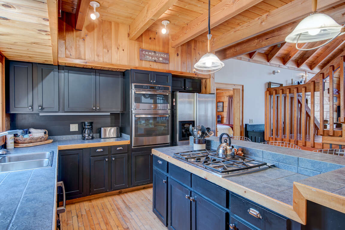 With comfortable accommodations for up to 10 guests established, the main level of Boles Lodge boasts an array of impressive features and amenities to ensure a memorable and luxurious mountain retreat experience. The enormous open great room with an exposed-beam cathedral ceiling creates a welcoming atmosphere, complemented by the massive 20-foot-high stone wood-burning fireplace, perfect for cozy evenings. The fully-equipped gourmet kitchen with stainless steel appliances offers the opportunity for culinary delights, while the dining area comfortably seats 12, facilitating enjoyable meals and gatherings. Additionally, the spacious main level master suite provides a tranquil sanctuary with a king-sized bed, private deck, and a luxurious master bath. These features, including the main level fireplace and gourmet kitchen, contribute to the perfect blend of comfort and luxury for a truly relaxing mountain getaway.