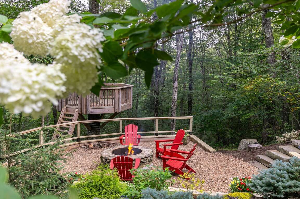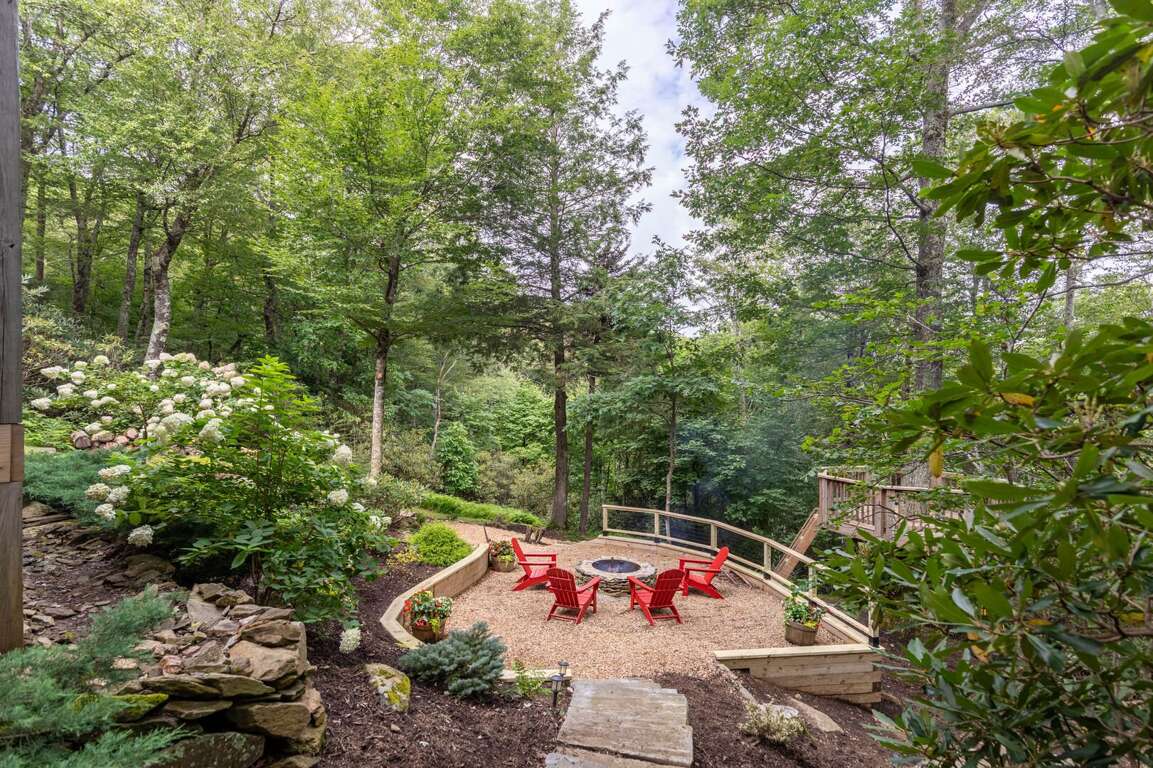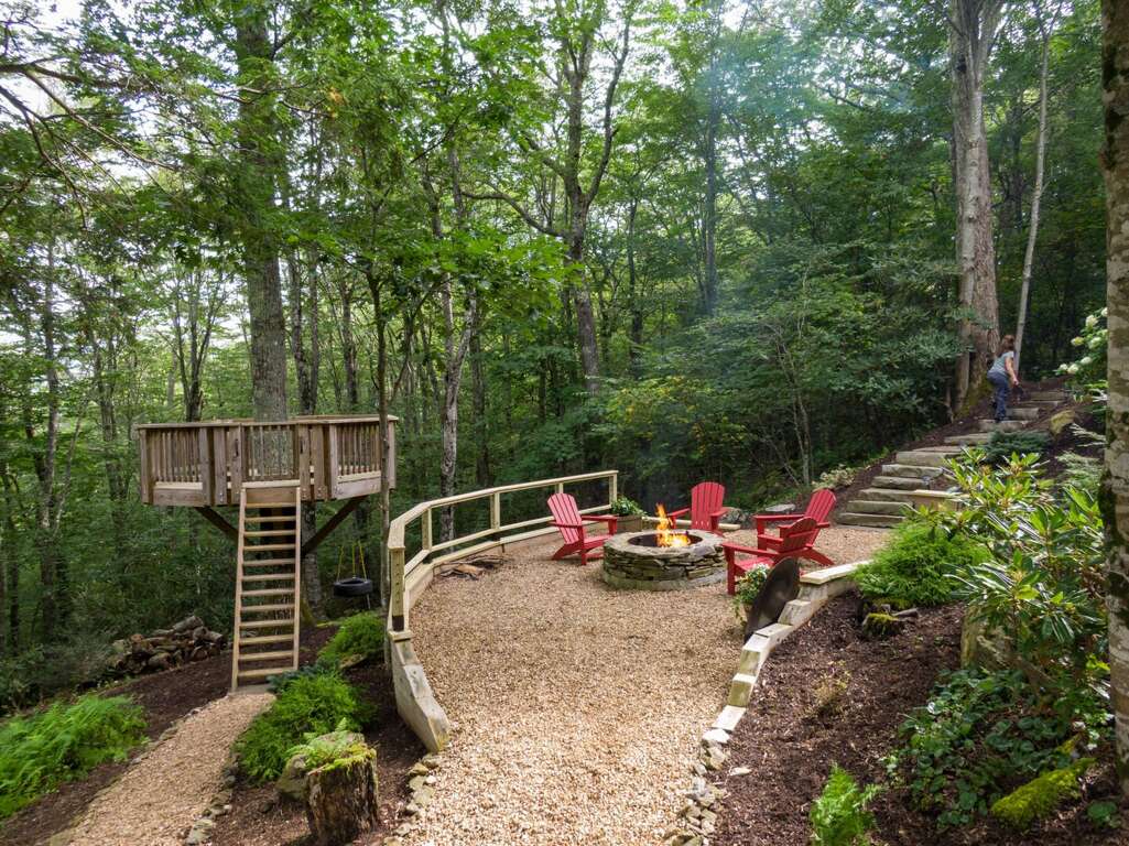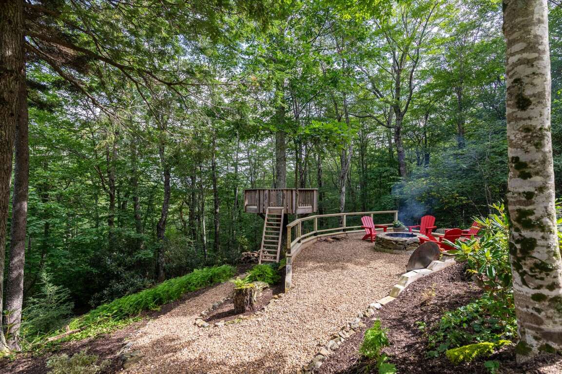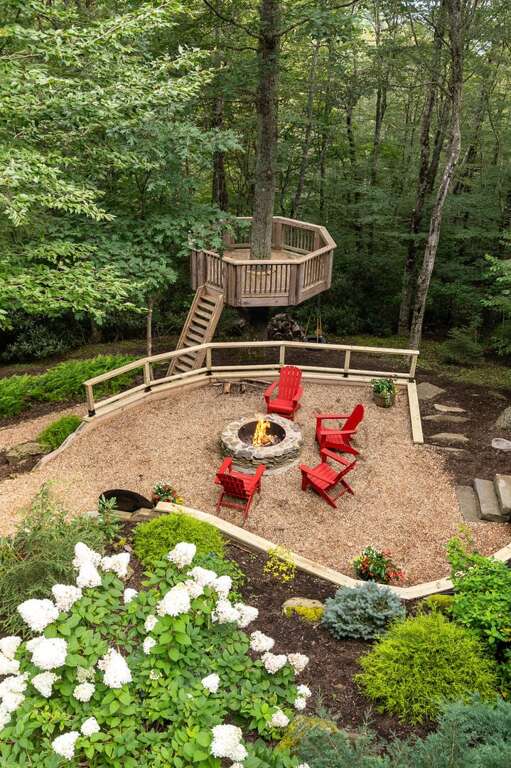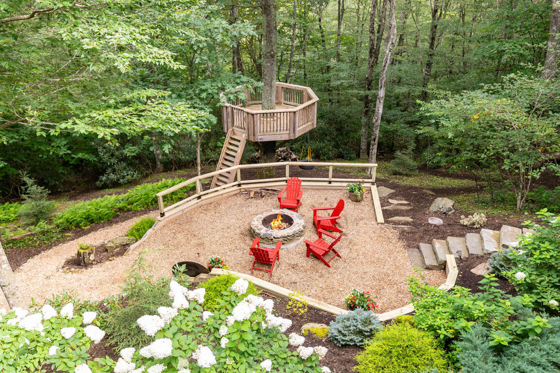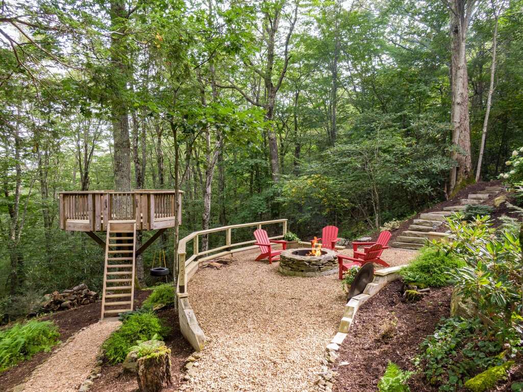 Nestled within a private, secure, and gated community, the cozy cabin in Grandfather, NC offers a tranquil archway of trees at the entrance, beautiful views, and a backyard oasis for guests to enjoy. The backyard has been recently transformed with new amenities in 2021, including a second deck off the lower bedroom, a huge entertaining space with a custom-built fire pit, and an open treehouse large enough for adults and children. Additionally, the backyard features gorgeous new landscaping, a tire swing, and a secret hiking loop. Guests can explore this secret hiking loop, immersing themselves in the natural beauty of the surrounding area. Whether it's relaxing in the serene backyard oasis or embarking on a nature-filled adventure, the outdoor amenities at Scarborough Fair provide the perfect setting for a rejuvenating stay.