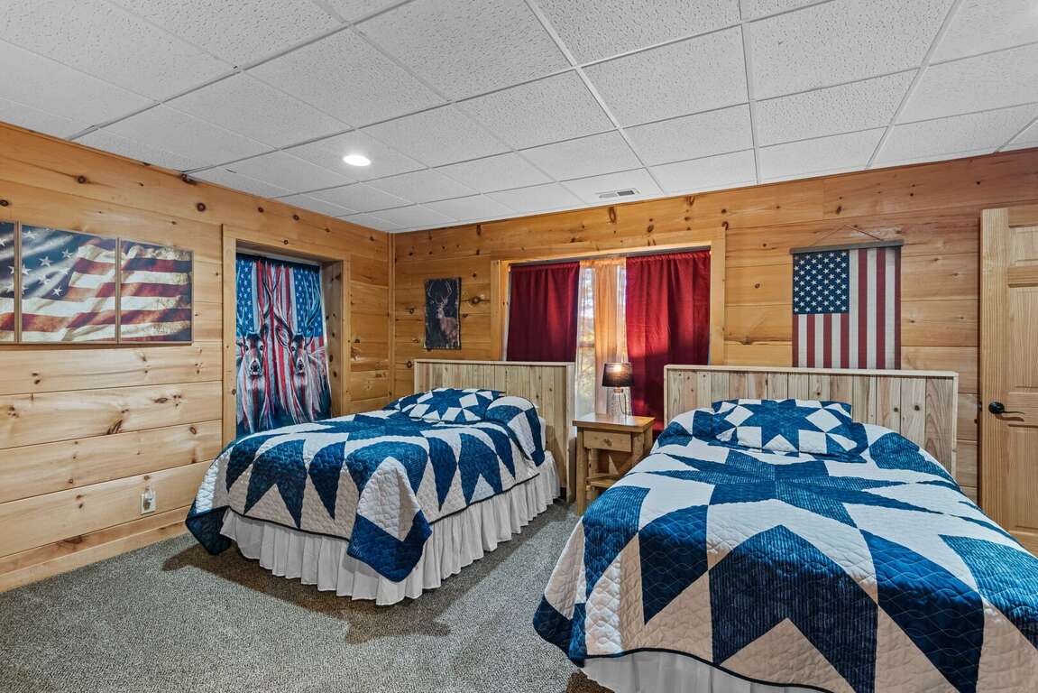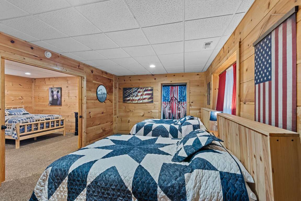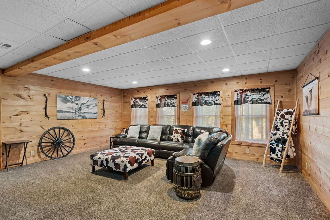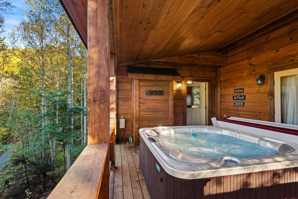 The Falling Waters Log Cabin offers a range of luxurious features, including three bedrooms with a total sleeping capacity of 8 and four full bathrooms, providing ample space and comfort for guests. The cabin layout is thoughtfully designed to maximize space and functionality, with a well-appointed kitchen boasting stainless steel appliances and granite counters. The cabin decor exudes a rustic charm, with plush chairs, leather couches, and a gas fireplace in the living room, creating a cozy ambiance. The dining area with a cathedral pointed soaring ceiling provides an inviting space for communal meals, while the open-air deck and private covered deck with a hot tub offer opportunities for relaxation and al fresco dining. The loft, complete with a sleeper sofa and full bath, adds versatility to the cabin's layout, ensuring a comfortable and freeing experience for guests.