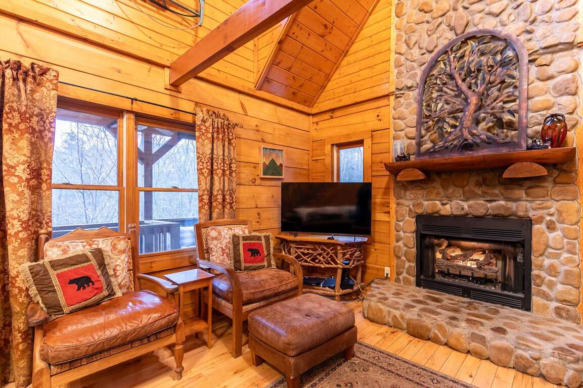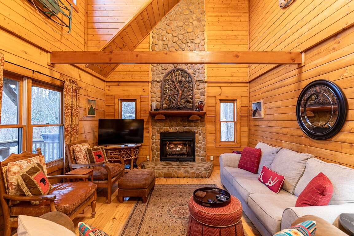 Boasting a 40' flat screen HDTV with over 200 channels, including premium options, and a gas-log fireplace in the spacious living room, this log cabin offers an array of luxurious amenities for a comfortable and relaxing stay. The large wraparound deck provides relaxation options, including a hammock and gas grill, while the Jacuzzi tub and shower in the master bathroom offer a perfect way to unwind. Entertainment features abound with DVD players and maple floors in the living room, creating an inviting atmosphere for movie nights or cozy gatherings. The exposed beam, 20-foot high cathedral ceiling adds to the charm of the cabin, ensuring a delightful experience. Whether it's curling up by the fireplace or enjoying the scenic views from the deck, this cabin provides the ideal setting for a tranquil and enjoyable retreat.