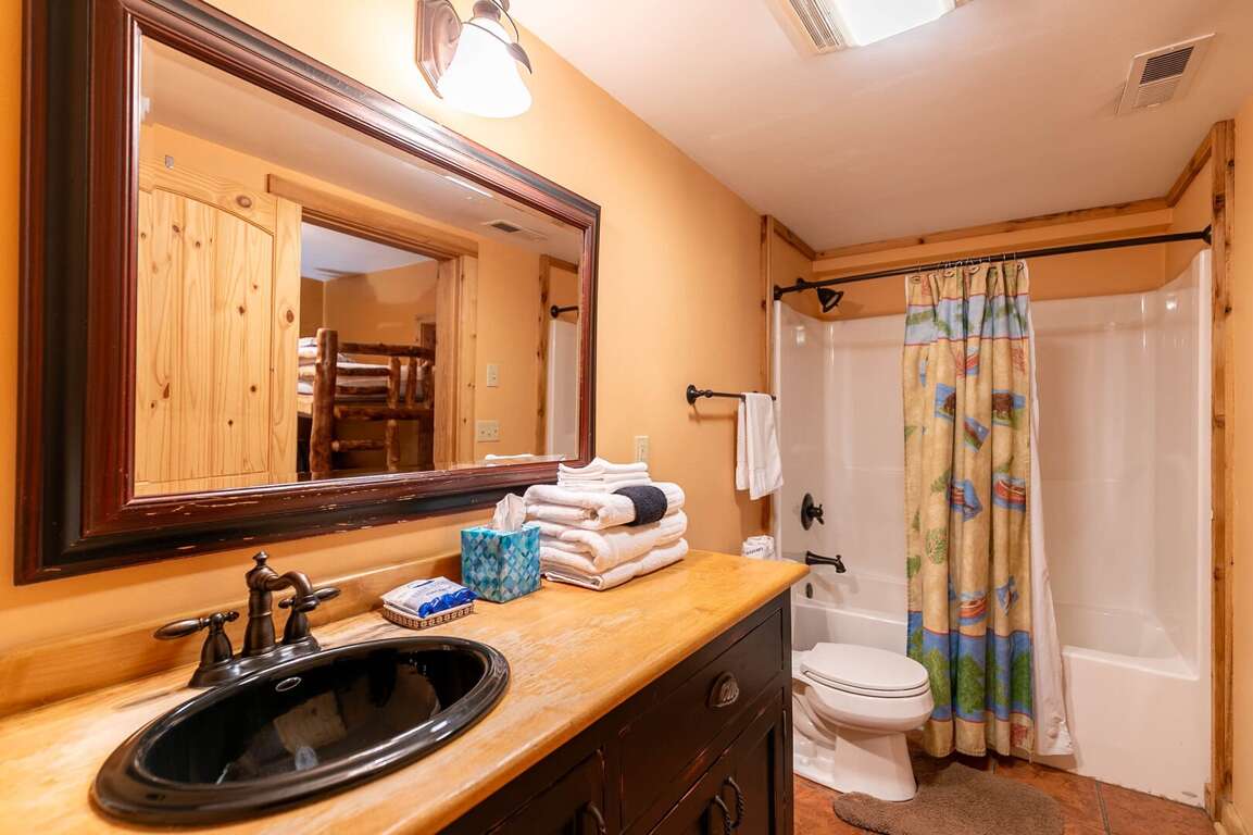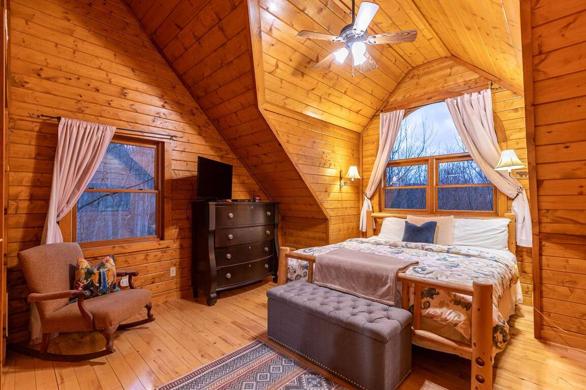 The log cabin getaway offers comfortable sleeping arrangements for up to 9 people, with 4 bedrooms and additional private sleeping areas, ensuring a restful and enjoyable stay for all guests. The bedding options include a master bedroom with a king bed and private bathroom on the main level, a king room and queen room on the upper level, and a bunk room with a twin over queen on the lower level. In addition to the bedrooms, there is an extra private sleeping area in 2 Cubs Cabin. Guests have the freedom to choose their sleeping arrangements and can opt for sharing bedrooms or enjoy the privacy of their own space.