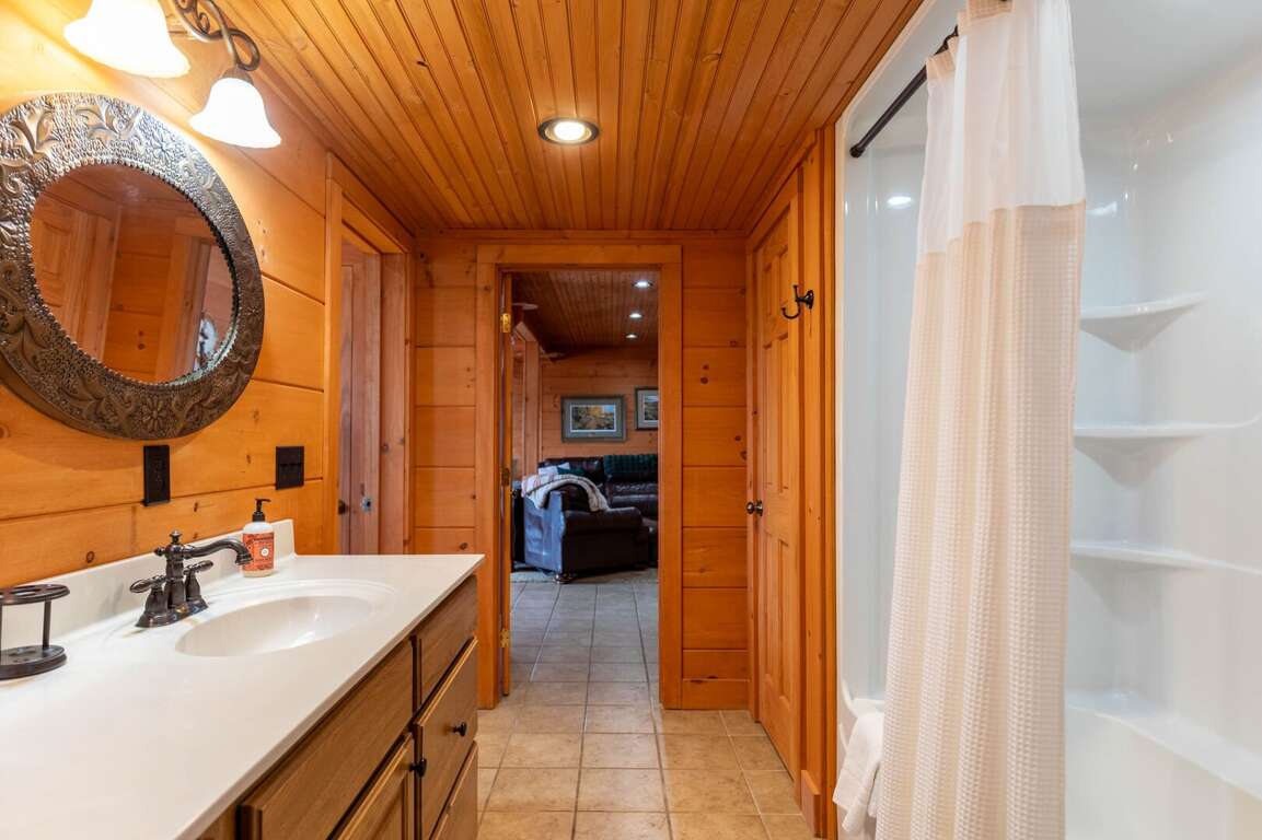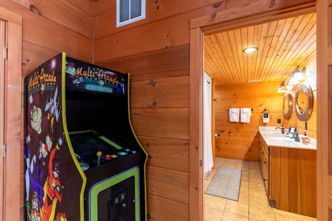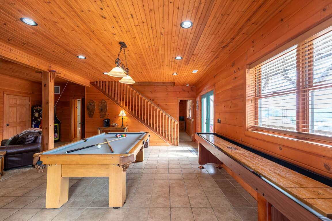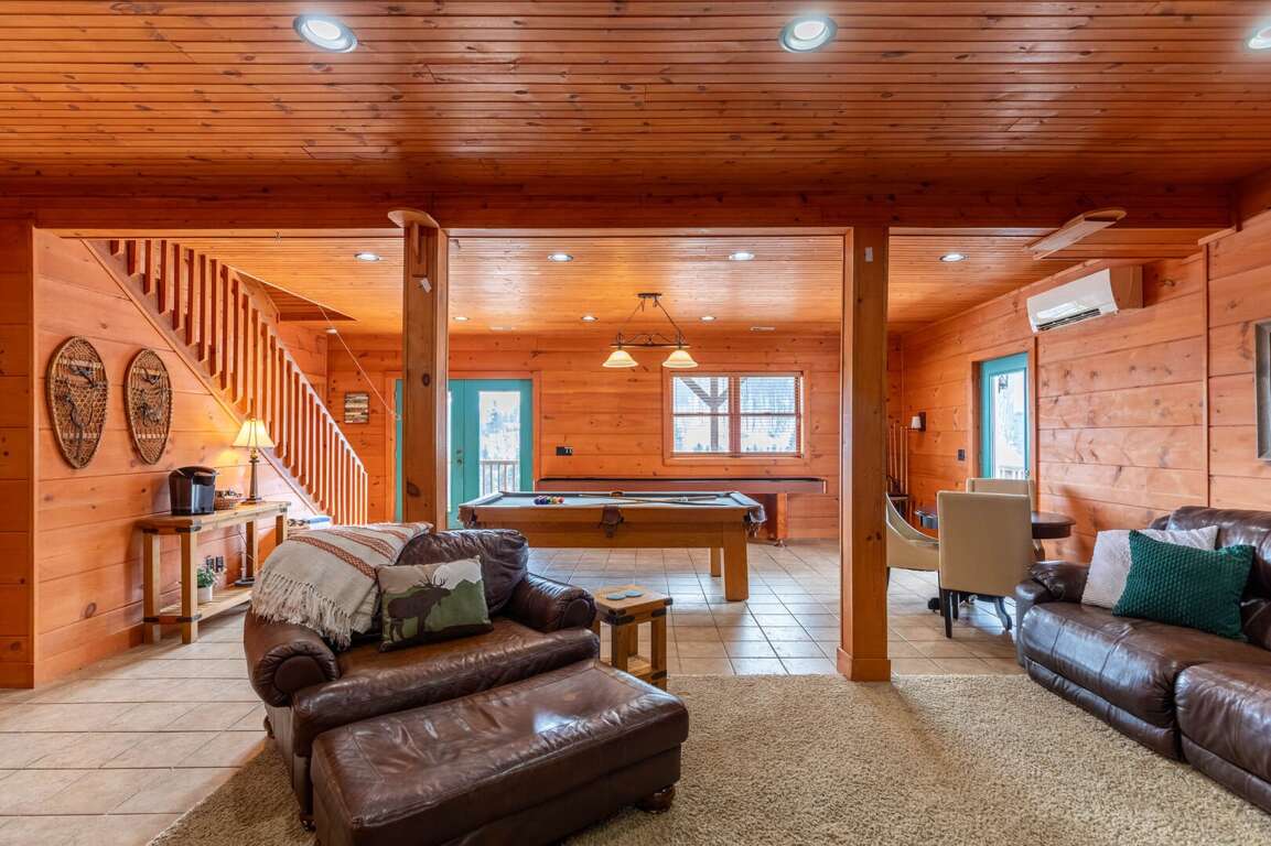 The lower level offers a spacious den and entertainment area complete with a pool table, shuffleboard, and a video arcade. This floor also includes a king suite with a full private bathroom. The laundry room is conveniently located off the game/entertainment area. There is also access to the lower deck, where a 6-person hot tub awaits—perfect for relaxing beneath the mountain sky.<br />
