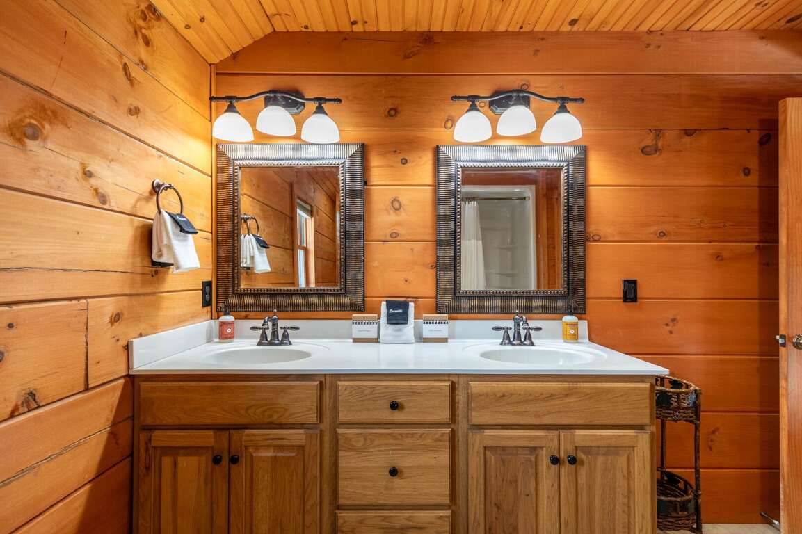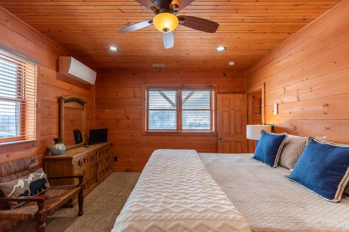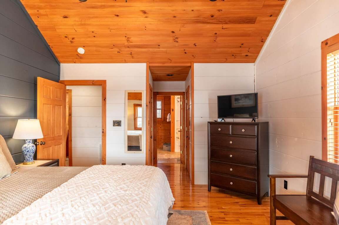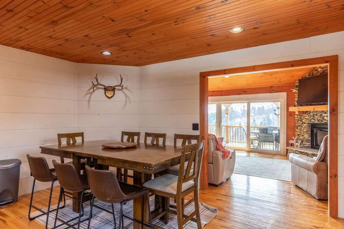 The main level features a spacious open living room with soaring cathedral, exposed-beam ceilings, a beautiful stone gas-log fireplace, and a TV for cozy movie nights. Step out onto the large covered deck to unwind, dine outdoors, or simply soak in the sweeping mountain views. The fully equipped kitchen offers granite countertops, ample space for meal prep, and a dining table for eight, making it easy to enjoy meals together as a group. This level also includes a convenient half bath and a generous king suite with its own TV and an ensuite bathroom featuring a tub/shower combination and double vanities.<br />